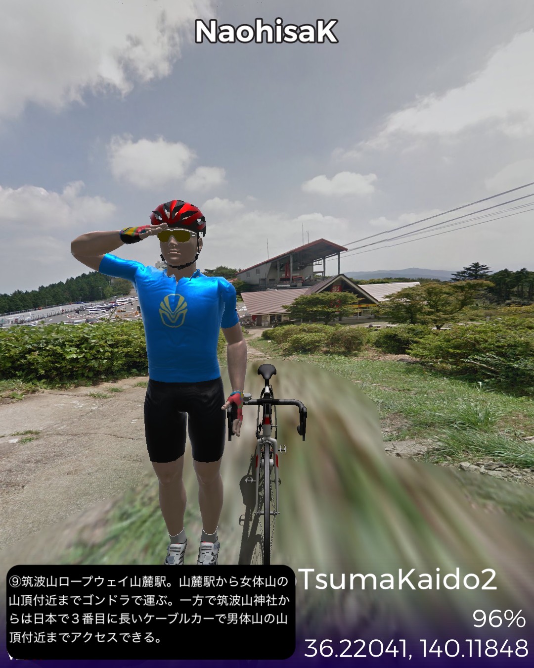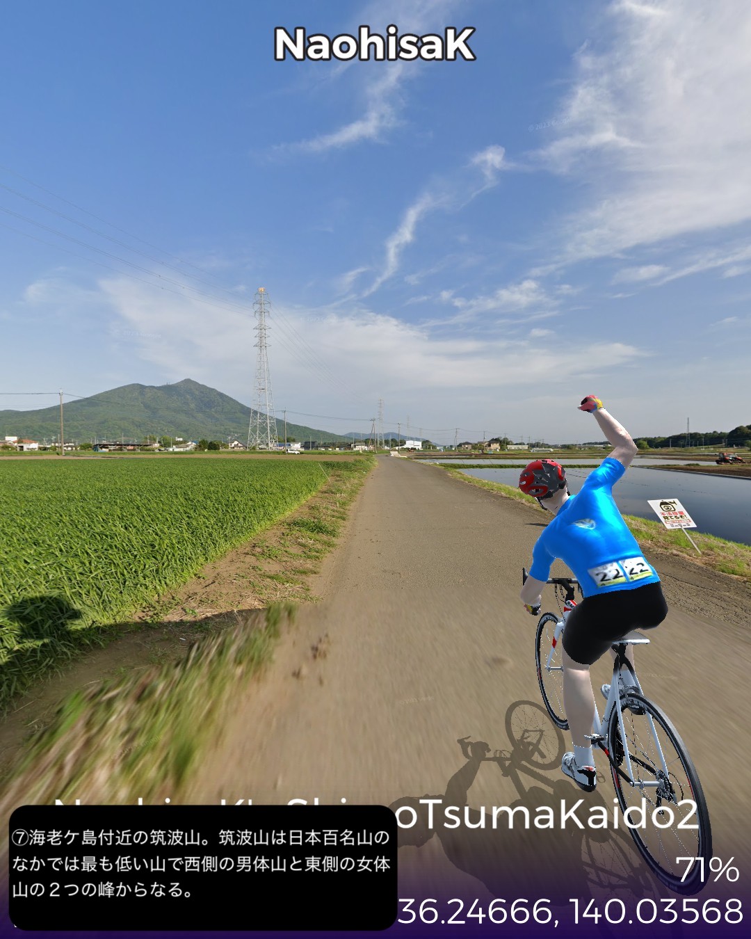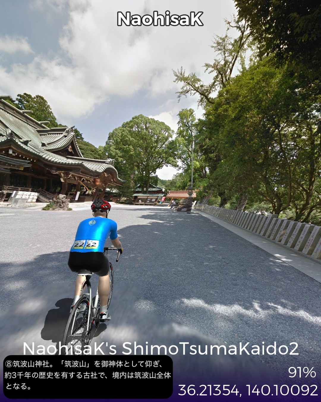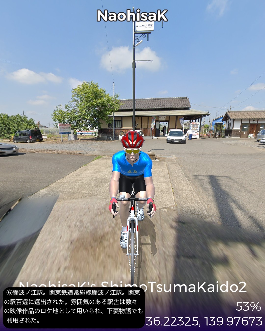 VRサイクリング 下妻街道2日目。茨城県西部筑波山麓を巡り筑波山へ登るの巻。水海道をスタートし鬼怒川に沿って北上、下妻物語で知られた下妻を過ぎ、黒子で街道を外れ寄り道モードとなって、筑波山麓を回り込んで筑波山神社に詣り筑波山女体山頂上をゴールとする47km。水海道と下妻の間の町石下(いしげ)の鄙びたレトロな味わいがちょっと良かった。下妻物語は観ていないが、多分東京まで2時間程で出られるが茨城県でとてつもなく田舎、というロケーションがポイントになっていると思うので、そういう意味ではとてつもなく田舎である、という点は体感した。ただし街道はロケ現場からは離れていて、一箇所だけロケで使われた騰波ノ江駅という関東の駅百選に選出されたTheローカル線の駅という雰囲気を醸す駅舎だけは押さえた。筑波山は登ったことがないので登ってみようと考えてゴール地点としたが、登ってみると実ははるか昔ではない娘が小さい頃に、茨城ドライブの帰りに寄って登ったことを不意に思い出した。行ってないつもりでも実は行ったことがある、ということもあるんだね。これからはVRやりすぎて行ったつもりだったけど実は言っていないケースが多くなりそうだけど。次回は一気に宇都宮へ進む。