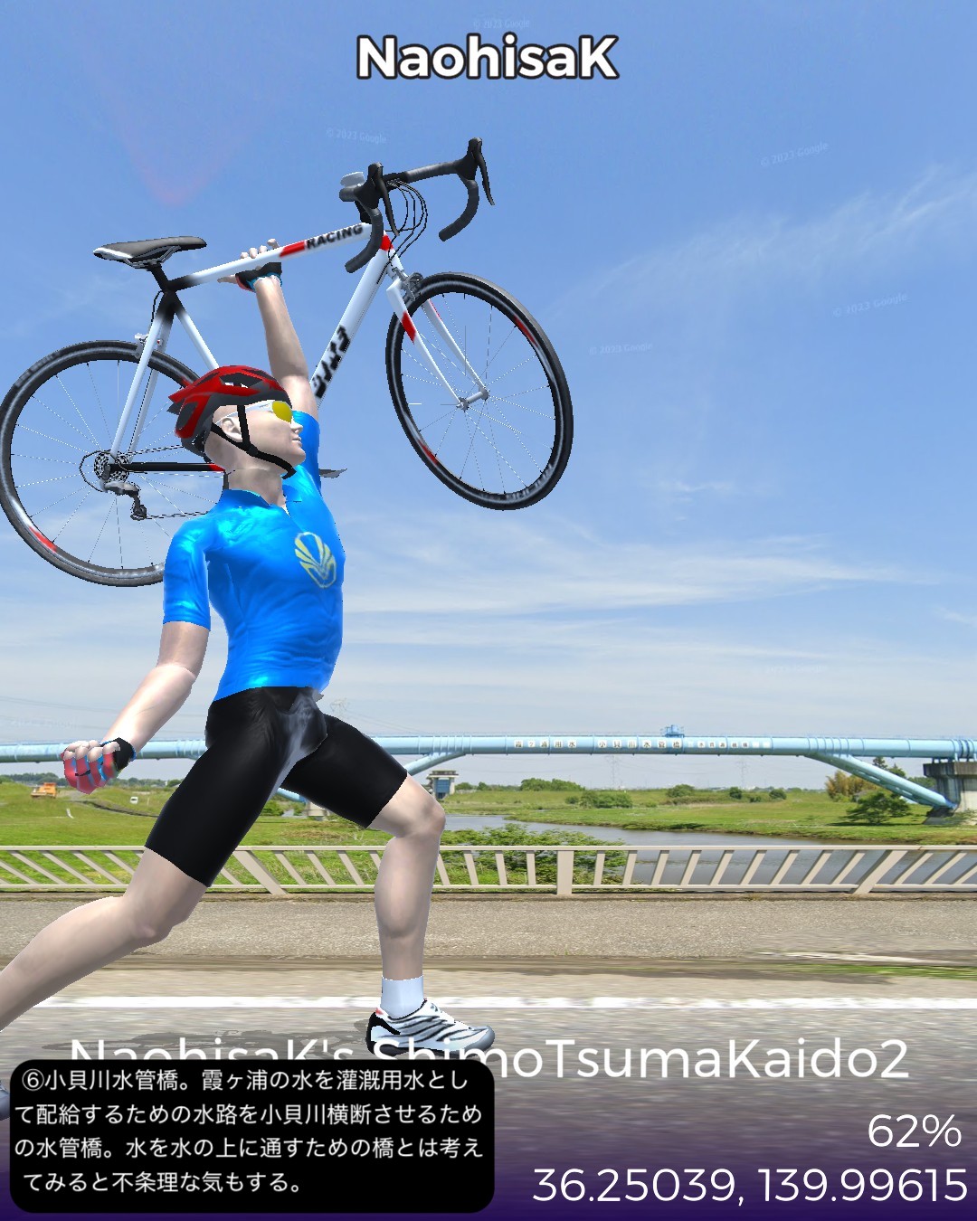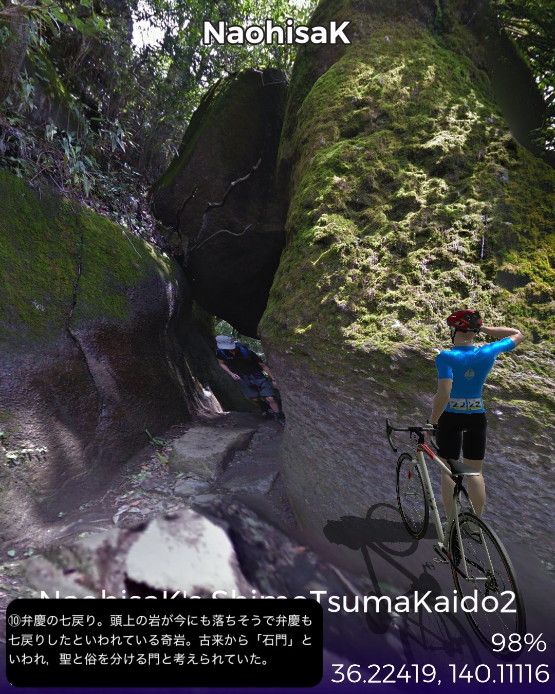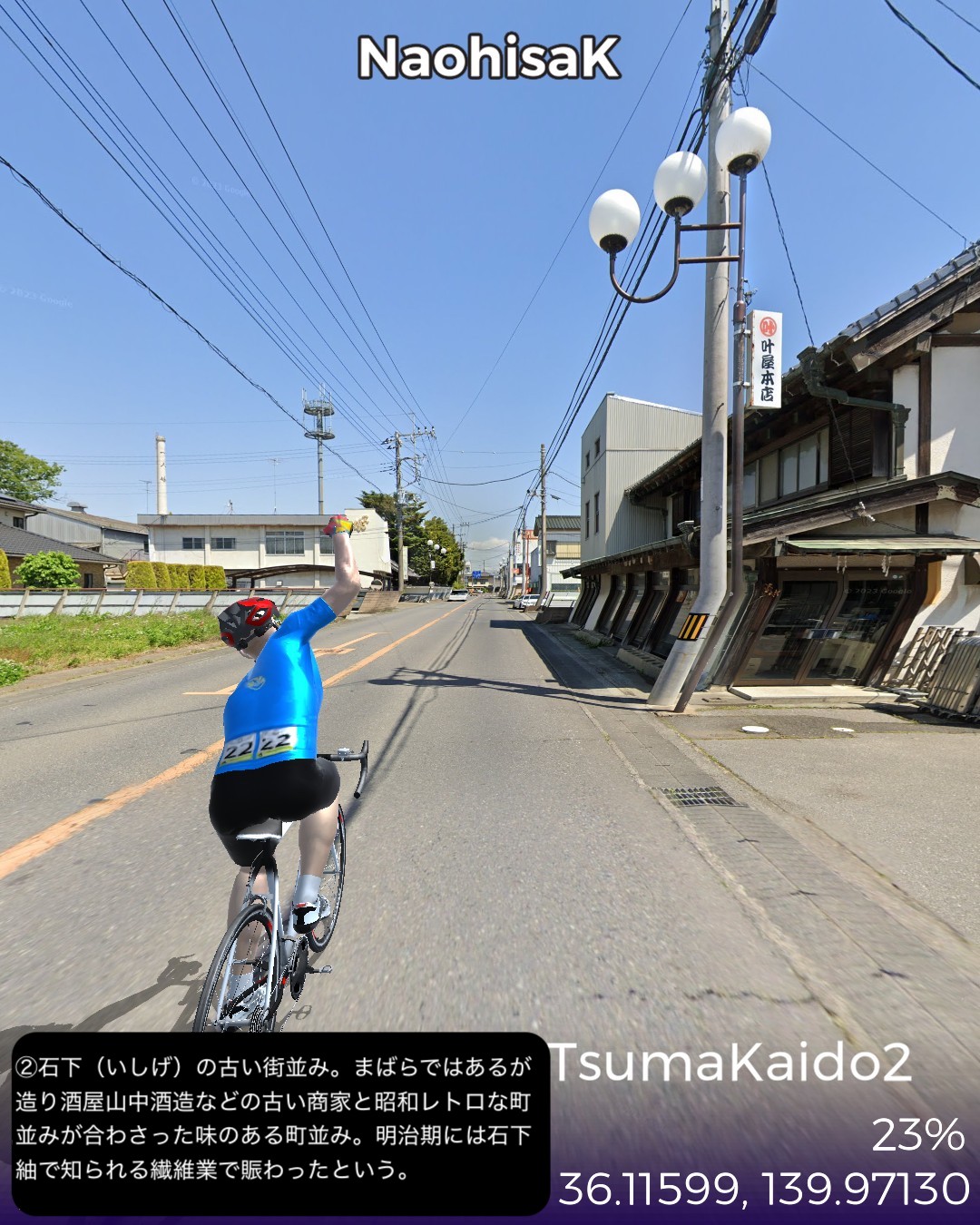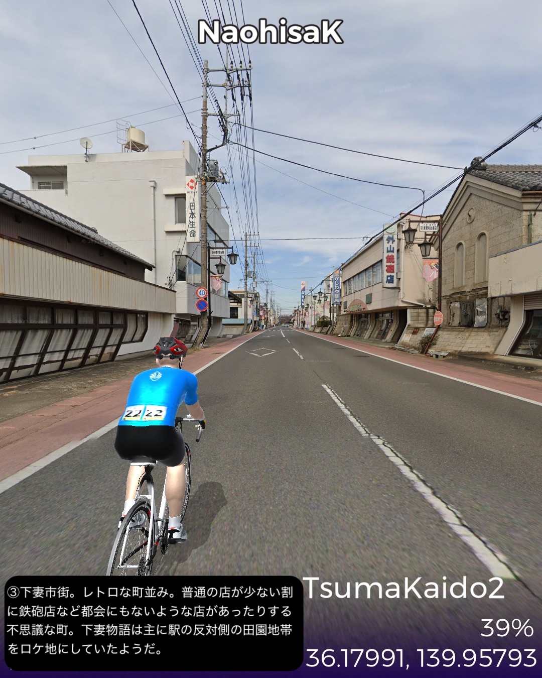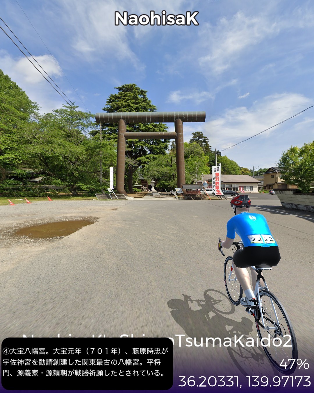 VRサイクリング 下妻街道2日目。茨城県西部筑波山麓を巡り筑波山へ登るの巻。水海道をスタートし鬼怒川に沿って北上、下妻物語で知られた下妻を過ぎ、黒子で街道を外れ寄り道モードとなって、筑波山麓を回り込んで筑波山神社に詣り筑波山女体山頂上をゴールとする47km。水海道と下妻の間の町石下(いしげ)の鄙びたレトロな味わいがちょっと良かった。下妻物語は観ていないが、多分東京まで2時間程で出られるが茨城県でとてつもなく田舎、というロケーションがポイントになっていると思うので、そういう意味ではとてつもなく田舎である、という点は体感した。ただし街道はロケ現場からは離れていて、一箇所だけロケで使われた騰波ノ江駅という関東の駅百選に選出されたTheローカル線の駅という雰囲気を醸す駅舎だけは押さえた。筑波山は登ったことがないので登ってみようと考えてゴール地点としたが、登ってみると実ははるか昔ではない娘が小さい頃に、茨城ドライブの帰りに寄って登ったことを不意に思い出した。行ってないつもりでも実は行ったことがある、ということもあるんだね。これからはVRやりすぎて行ったつもりだったけど実は言っていないケースが多くなりそうだけど。次回は一気に宇都宮へ進む。