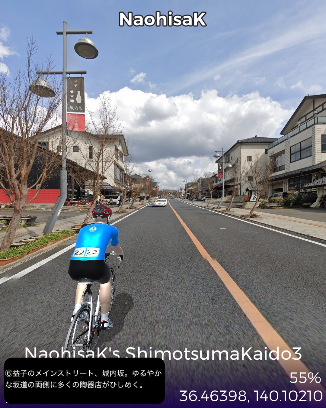 VRサイクリング 下妻街道 3日目。益子経由宇都宮へ至る遠い旅路。下妻の先黒子をスタートし、以前西から東に抜けた結城街道の経由地、蔵の町下館を南から北へ抜けた後は、豪農の立派な家並の集落が点在する大平原の田園地帯を延々と走り、益子に着いたところで下妻街道に別れを告げて、陶器の里を一巡り。さらに延々と田園地帯を走ってようやく宇都宮へ辿り着く長丁場61kmの行程。益子が陶器で有名な町とは知っていたが、250もの窯元が競う一大陶器産地でメインストリートには陶器店がひしめき客が押し寄せる場所とまでは認識していなかった。春と秋に開催されるという陶器市に一度訪れてみたいものだ。さて下妻街道はこの先北上すると喜連川で奥州街道と繋がるが、この先東北地方をまず奥州街道を通して攻めるためにその始点となる宇都宮からスタートしたい、ということで下妻街道を離れて宇都宮へと向かったわけだ。よって次回から奥州街道編のはじまり。