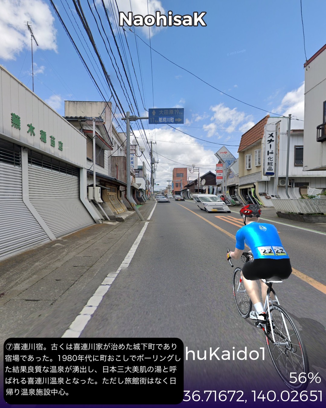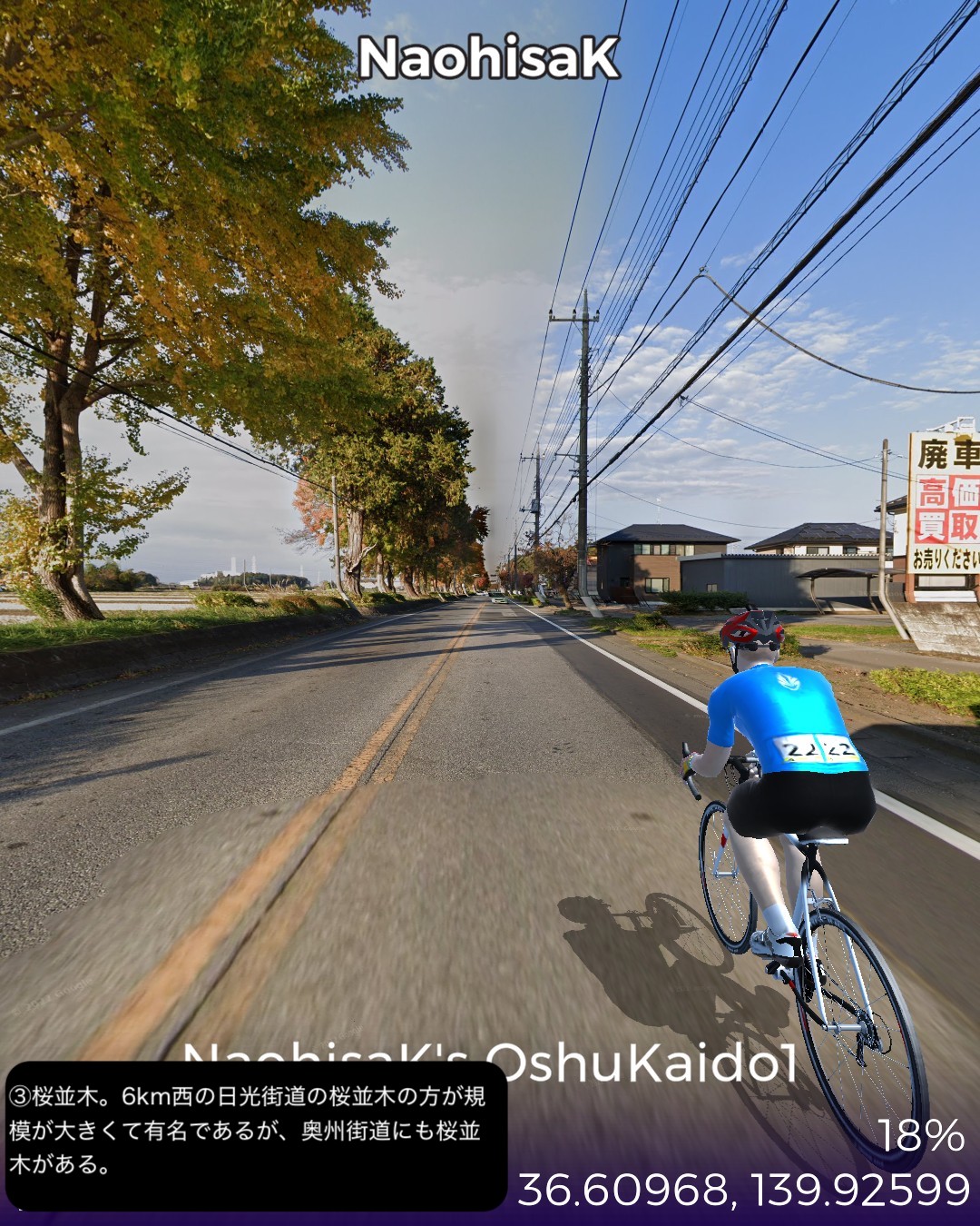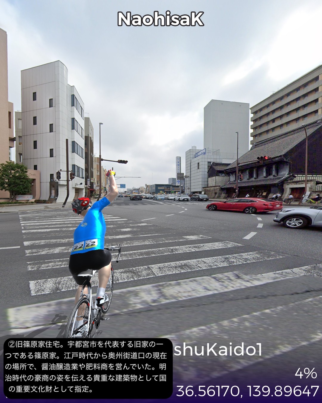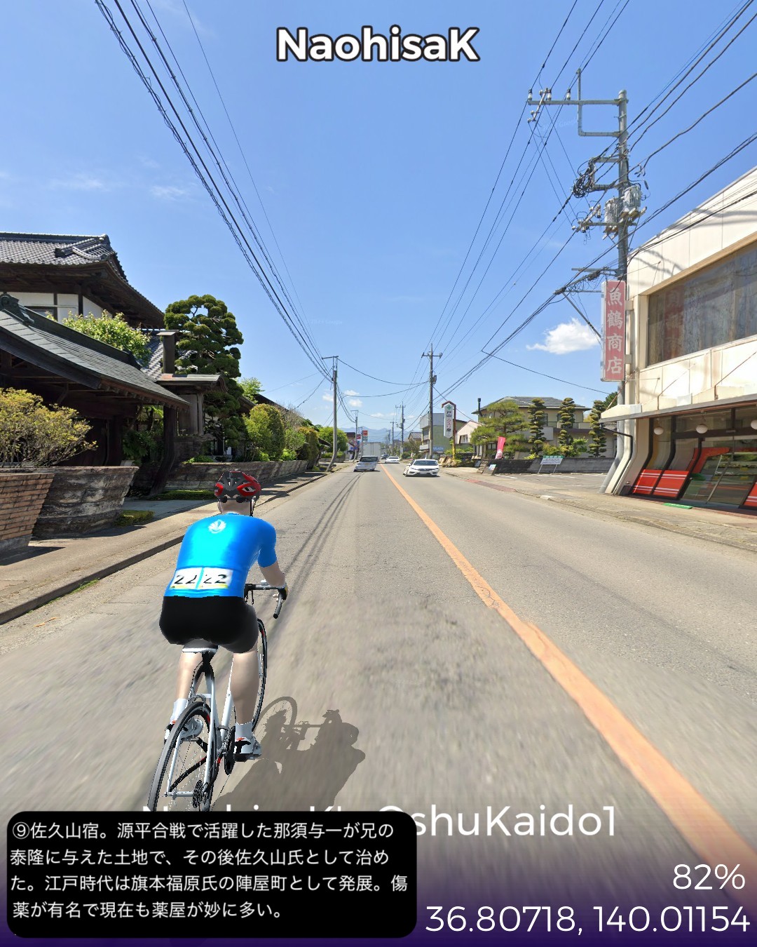 VRサイクリング、今回から五街道の最後の1つであり日本最長の街道、奥州街道を踏破しようと思う。厳密には奥州街道は日本橋が出発点であるが、宇都宮までは日光街道と共通なのでその先を往く。よって奥州街道1日目は宇都宮の日光街道との追分をスタート地点として、北北東に進み鬼怒川を越えて氏家宿まではJR東北本線にほぼ沿ってゆくが、その先は離れて日光連山から那須連山を望む緑濃い田園地帯を進む。温泉場としても知られる喜連川宿、佐久山宿を抜けて、最高級和牛の産地として知られる大田原宿に至る45kmの行程。宇都宮から13kmほど離れた鬼怒川を渡る地点に江戸時代から明治時代中期にかけて水陸交通の要地として繁栄して小江戸と呼ばれた「阿久津河岸」という港町があった。水運は陸運の1/25の運賃で済むため奥州広域の米を江戸に運ぶための一大拠点となっていたという。今は全く跡形もなく緑に覆われた幻の町なのだ。うーむ、こういうのが歴史の浪漫だなあ。また近くの氏家宿は、奥州街道以外に会津西街道、会津中海道、原街道などが集まる陸路のハブとなっており、阿久津河岸から積み出す物資の集積地として奥州各藩の蔵が建ち並び共に繁栄していたという。喜連川は1980年代に町おこしでボーリングしてみたら、あら不思議!日本三大美肌の湯と呼ばれるようになる良質な温泉が湧出したというラッキーな温泉地。ただ行ってみると温泉街のような旅館が建ち並ぶ風景はなく基本的に日帰り温泉施設で売っているようだが余り観光ビジネス的に成功している雰囲気はない。ちょっともったいない気がする。