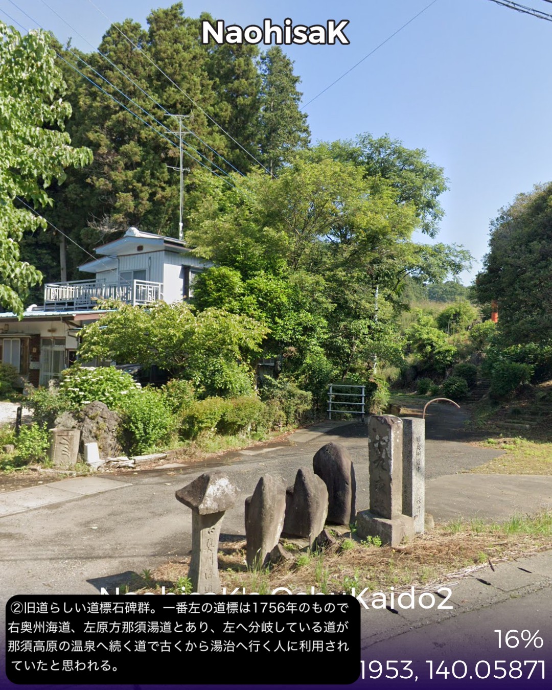 VRサイクリング 奥州街道2日目。長くさすらってきた関東地方を抜けていよいよ東北地方に突入の巻。高級牛肉でしか地名を聞いたことがなかった大田原宿をスタートし、源平合戦で名を上げた那須与一が兄弟に分け与えた下野国北部那須地域の東側を北上。鍋掛宿、越堀宿の2つの宿場が両河岸にある難所那珂川を越え、下野国最北の宿場芦野宿を経て国境を越えて磐城国(福島県)白河宿に至る41kmの行程。高校野球で昨年仙台育英が優勝して初めて「白河の関」を越えたという話があるが、その白河の関とは古代の道、東山道に存在した関所である。今回通った奥州街道の国境には二所の関址という史跡があるが、それは少なくとも江戸時代の関所の跡ではなく、東山道にあったいわゆる白河の関は奥州街道の4km東に存在することになっており、そちらは白河関の森公園などと称して観光地化されている。有名な白河の関が4km東にあるとしたのは江戸時代の白河藩主にして老中となった松平定信でそれが定説になったわけだが、どうもこちらの奥州街道の国境に東山道の白河の関があったとする説も昔から脈々と存在し、どうやら現在においても決着はついていないが、奥州街道の国境にあったとする説の方が有力らしい。二所関址という名称も関所が二箇所に存在した可能性を踏まえたものではないかという。ちなみに相撲部屋の名門、二所が関部屋はこの二所関になぜか由来しているらしい。白河の関の謎、なかなか興味深い話であった。