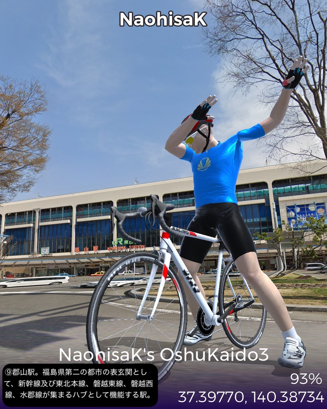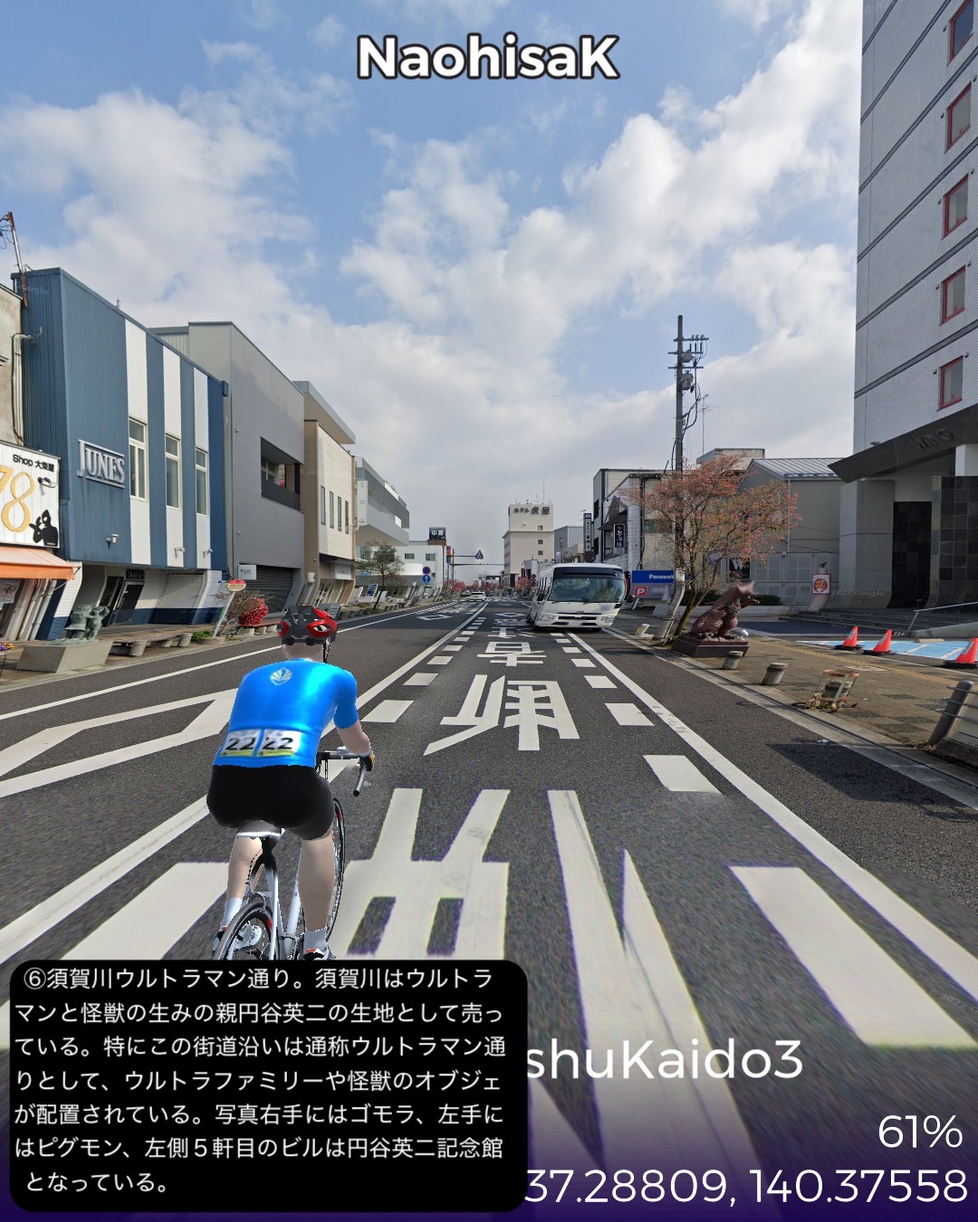 VRサイクリング、奥州街道3日目。阿武隈川流域の磐城国(福島県)中通りをぐいぐい北上する。奥州外様大名防衛の要衝白河宿を出発し、ほぼ平らな盆地を北上し、矢吹宿、須賀川宿といった小さな城下町の宿場を経て商都、郡山宿に至る。さらに郡山市北部の福原宿まで43kmの行程。磐城国に入ると桜の咲く景観が目立ってきた。それも関東ではほぼソメイヨシノばかりなのが、少なくとも街道沿いではしだれ桜や山桜などの古来からの野生種がほとんどなのが印象的。有名な三春滝桜は街道から外れているが今回のルート上の郡山から10kmほど東に行ったところにある。こうした野生の桜の景観は単調になりがちな街道風景のアクセントとなり心和ませる。途中の町、須賀川は室町時代に稲村御所が置かれて奥州を管轄する中心地だったとか、戦国時代には名門二階堂氏の須賀川城が伊達政宗に攻められたとか、江戸時代には宿場町と阿武隈川の水運で栄えたとか、芭蕉が6日間滞在したとか歴史的に見るべきところの多い街と言えるが、訪れてみると古い街並みはほとんど見当たらず、最も印象的なのはウルトラマンと怪獣の生みの親、円谷英二の出身地というアピールである。街道沿いにはウルトラマン、ウルトラセブンやゴモラ、レッドキングなどの怪獣達のオブジェで溢れているし、円谷英二記念館もある。これはこれでなかなか面白い。