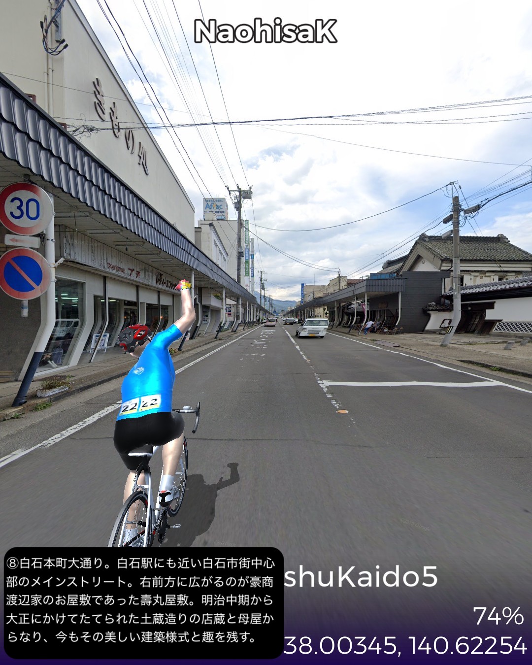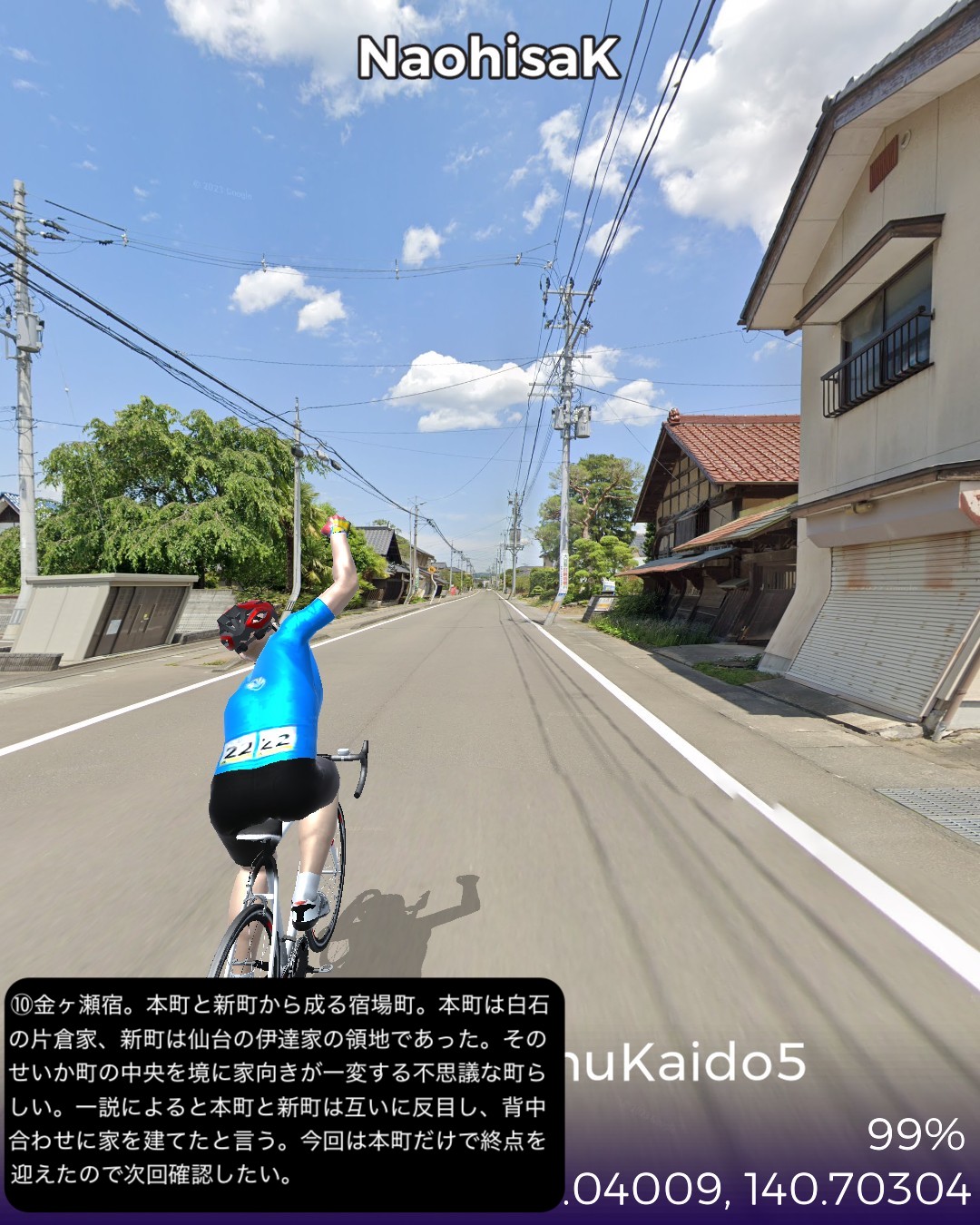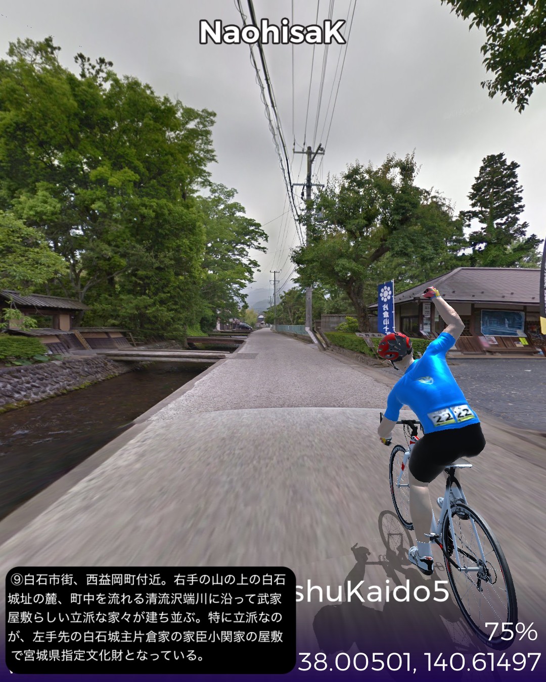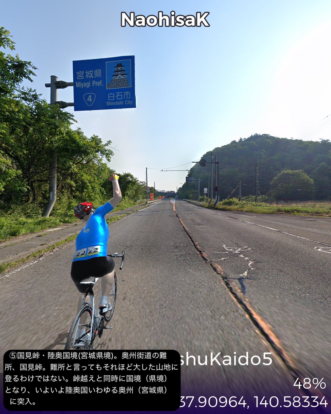 VRサイクリング 奥州街道5日目。いよいよ「みちのく」陸奥国(宮城県)に入るの巻。県庁所在地、福島市街ど真ん中栄町付近をスタートし、瀬上宿、桑折宿と阿武隈川流域の田園地帯を進み、阿武隈川から離れて山地へ入り軽い難所国見峠を越えると陸奥国(宮城県)。越河宿を抜け城下町白石宿からは阿武隈水系の白石川に沿ってゴール金ヶ瀬宿まで48kmの行程。磐城国(福島県)の中通りは内陸ではあるが阿武隈川の賜物で広い田園地帯の盆地であった。白河から福島の北まで丘陵地帯の多少のアップダウンはあったもののほぼ平らな道であった。そのまま阿武隈川と共に下れば峠越えなしに仙台に抜けられるはずであるが、街道は国見峠の国境を越えて白石川の流域に沿って仙台方面へ下る。幕府の奥州外様大名へ対する防衛措置としてわざわざ峠の国境を通すルートにしたのだろうか。明治になって奥州街道に沿って東北本線の鉄道を敷いたわけだが、後々急勾配を避けて輸送力を増強するために阿武隈川に沿ってバイパスするルートの計画が上がり国鉄丸森線として開通したが、タイミングが合わずバイパス機能を発揮する前に赤字化し、第三セクタの阿武隈急行として今に至っている。ある意味歴史的経緯のツケが回ってきていると言えるかも。白石という城下町も奥州街道が通ったから発展した町なのかもしれないが、江戸時代一藩一城が基本であったのが、仙台藩は例外的に仙台城(青葉城)と白石城の2つの城下町を持つことを許されていて、白石城は伊達政宗の名参謀片倉十郎一族に与えられた。現在はのどかな城下町であるが、幕末の戊辰戦争時には新政府軍に対抗した奥羽越列藩同盟会議が行われた抵抗勢力の中心地となった土地柄である。