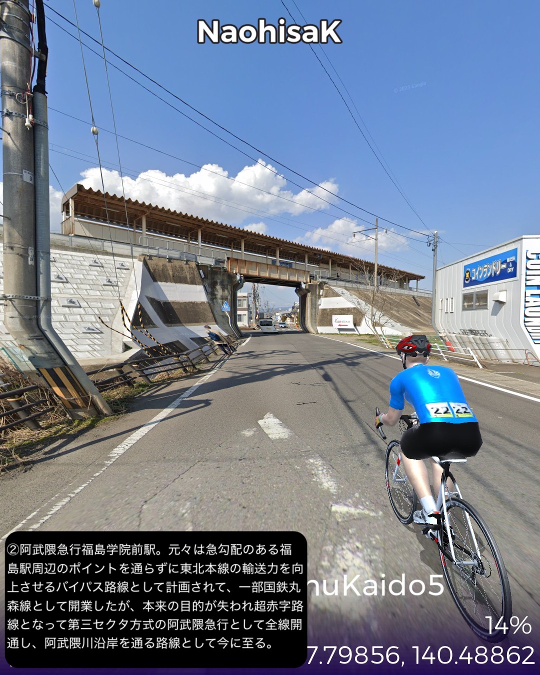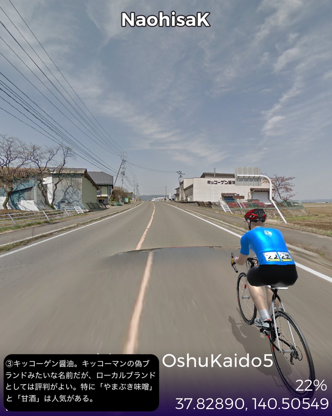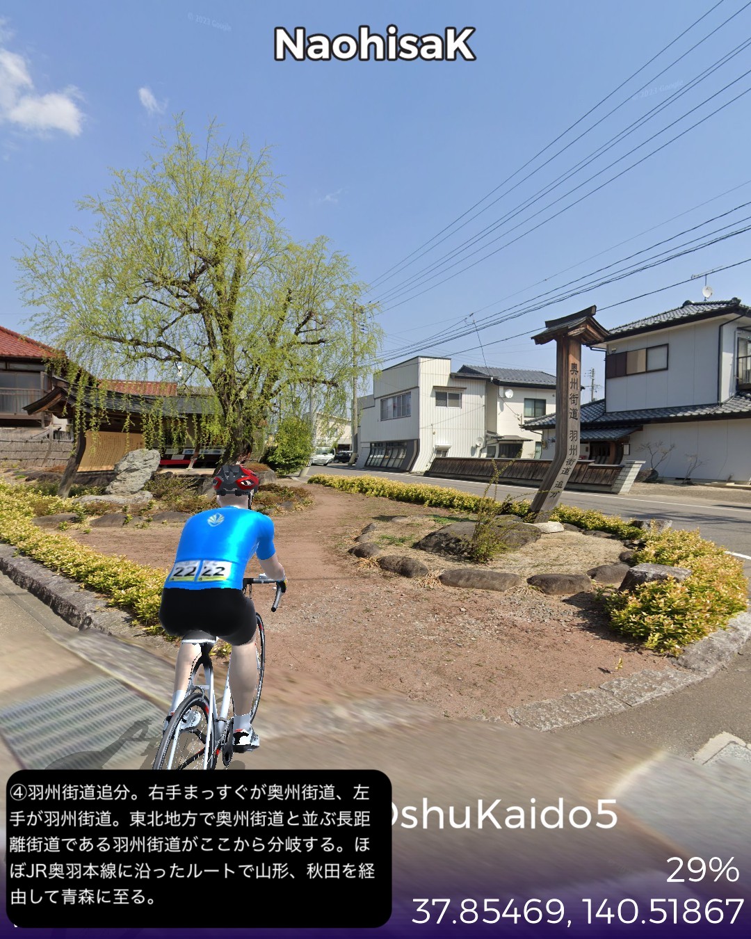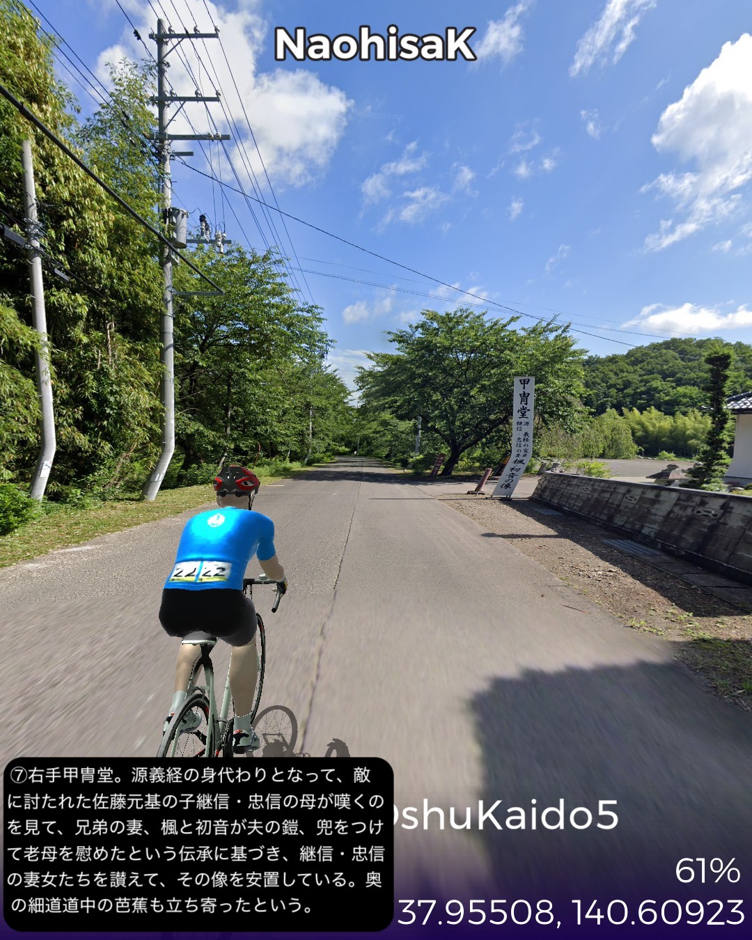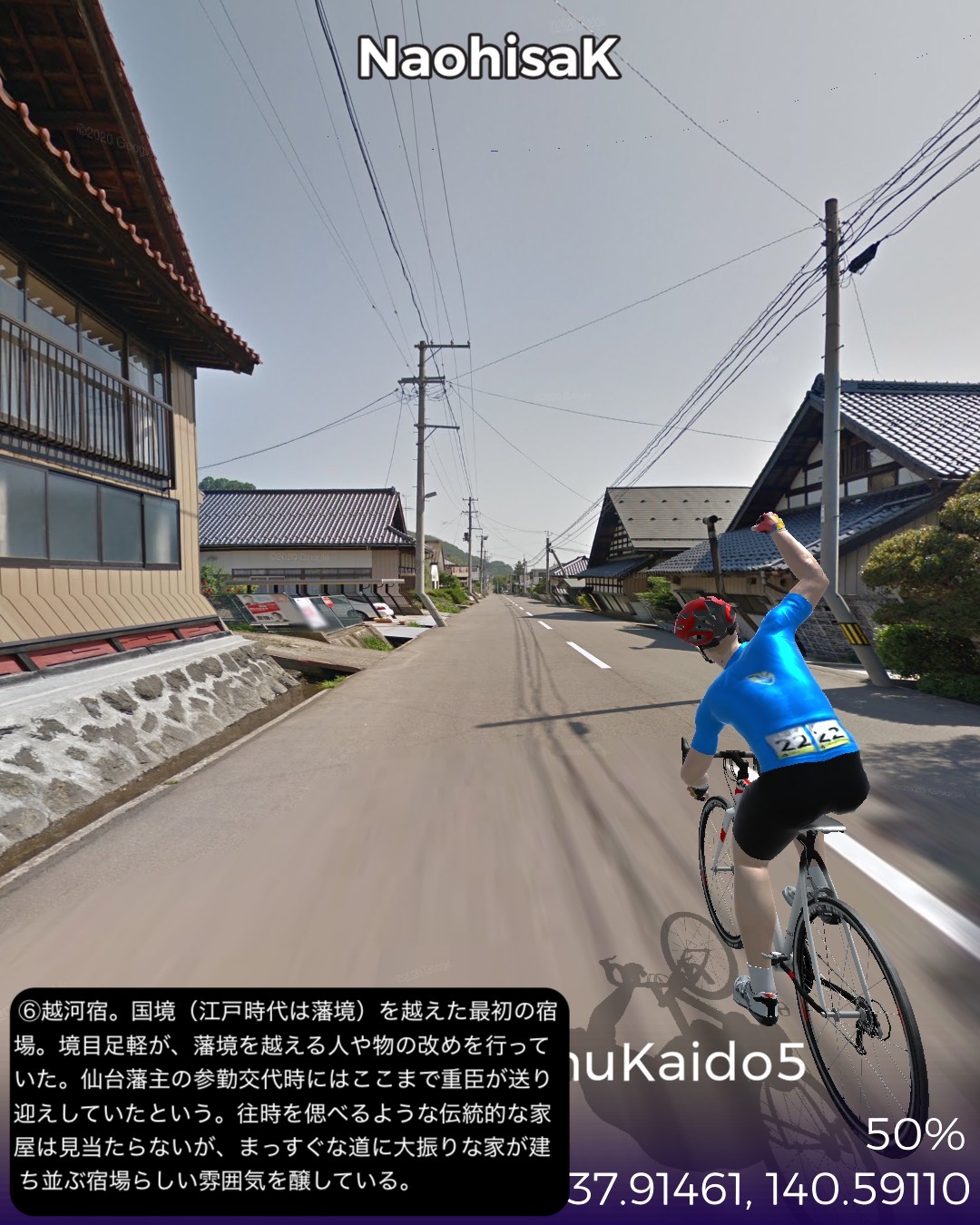 VRサイクリング 奥州街道5日目。いよいよ「みちのく」陸奥国(宮城県)に入るの巻。県庁所在地、福島市街ど真ん中栄町付近をスタートし、瀬上宿、桑折宿と阿武隈川流域の田園地帯を進み、阿武隈川から離れて山地へ入り軽い難所国見峠を越えると陸奥国(宮城県)。越河宿を抜け城下町白石宿からは阿武隈水系の白石川に沿ってゴール金ヶ瀬宿まで48kmの行程。磐城国(福島県)の中通りは内陸ではあるが阿武隈川の賜物で広い田園地帯の盆地であった。白河から福島の北まで丘陵地帯の多少のアップダウンはあったもののほぼ平らな道であった。そのまま阿武隈川と共に下れば峠越えなしに仙台に抜けられるはずであるが、街道は国見峠の国境を越えて白石川の流域に沿って仙台方面へ下る。幕府の奥州外様大名へ対する防衛措置としてわざわざ峠の国境を通すルートにしたのだろうか。明治になって奥州街道に沿って東北本線の鉄道を敷いたわけだが、後々急勾配を避けて輸送力を増強するために阿武隈川に沿ってバイパスするルートの計画が上がり国鉄丸森線として開通したが、タイミングが合わずバイパス機能を発揮する前に赤字化し、第三セクタの阿武隈急行として今に至っている。ある意味歴史的経緯のツケが回ってきていると言えるかも。白石という城下町も奥州街道が通ったから発展した町なのかもしれないが、江戸時代一藩一城が基本であったのが、仙台藩は例外的に仙台城(青葉城)と白石城の2つの城下町を持つことを許されていて、白石城は伊達政宗の名参謀片倉十郎一族に与えられた。現在はのどかな城下町であるが、幕末の戊辰戦争時には新政府軍に対抗した奥羽越列藩同盟会議が行われた抵抗勢力の中心地となった土地柄である。