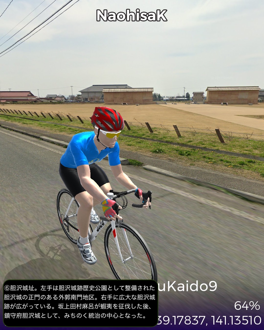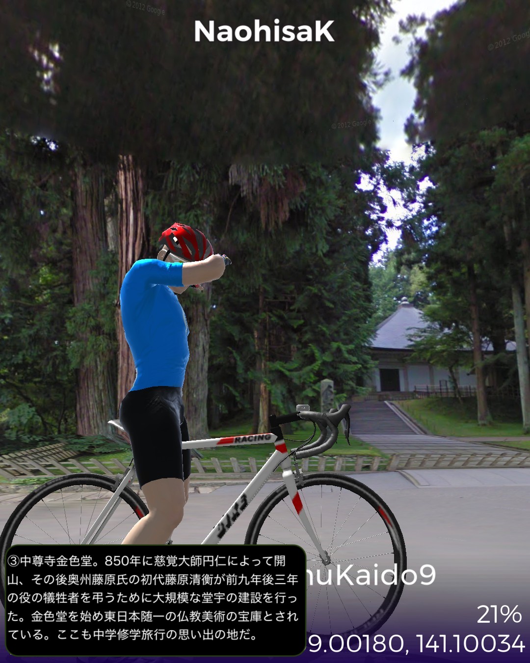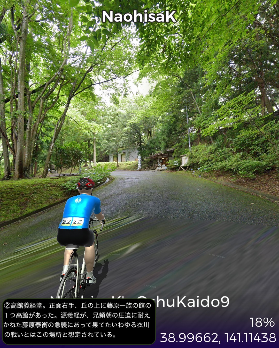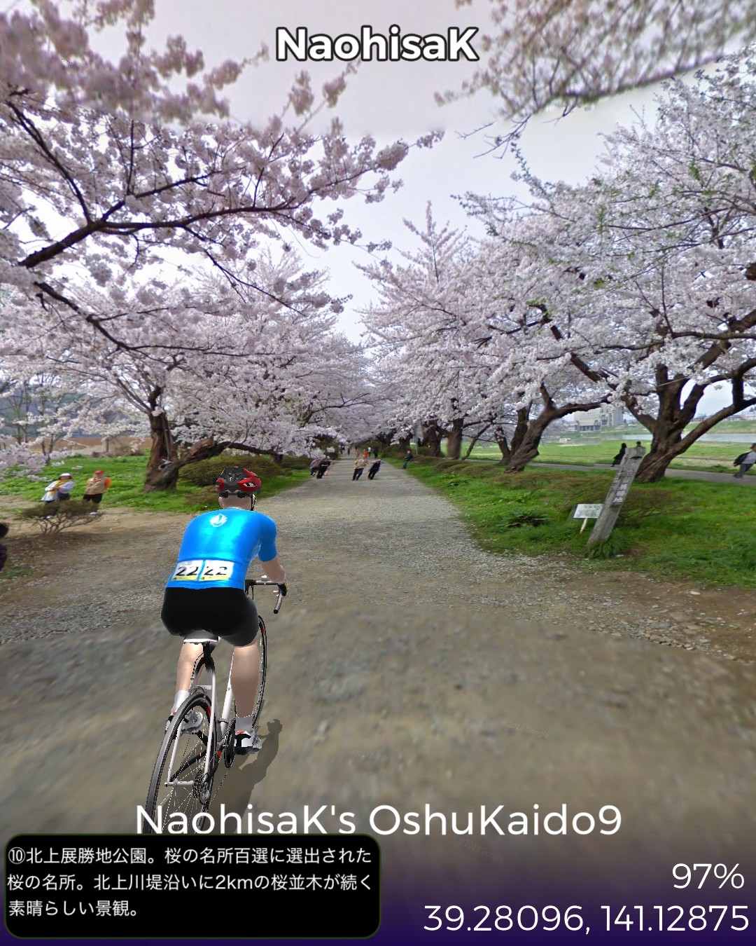 VRサイクリング 奥州街道9日目。これぞみちのくゴールデンルートを往くの巻。岩手県最南部の都市である一関宿をスタートし、いつの間にか近くにすり寄ってきた東北の大河、北上川と共に北へ遡る。いにしえのみちのくの都、平泉では寄り道モードでグルっと名所を巡り、高級牛で有名な前沢宿、みちのくの小京都と呼ばれる水沢宿と素敵な街並みの街を通り過ぎ、昔の黒沢尻宿、今の北上市街に到達、さらに再度寄り道モードで北上川沿いの桜の名所北上展勝地公園まで54kmの行程。今回のハイライトは何といっても平泉である。平安時代後期100年間近く藤原氏三代に渡ってみちのく王国の首都として輝いた。現代においても毛越寺、中尊寺やその他の遺構からその余韻を感じ取ることができる。村ぐらいの狭い地区の中に毛越寺、中尊寺以外にも観自在王院、無量光院という数々の大寺院が甍を競い、政庁の伽羅御所、一族の居館となった平泉館や高館、そしてみちのく中の産物が集積される人口数万の産業都市であった。現代においてはそうした輝きの余韻を除けば日本の中心から遠く離れた北上川沿いの低い山地が迫る小さな田舎町に過ぎないのが嘘のようだ。もう一カ所水沢宿とゴールの北上市街の間にあった胆沢城址というだだっ広い荒野。ここは藤原三代よりさらに昔の平安時代初期に蝦夷を征伐した坂上田村麻呂が鎮守府胆沢城としてみちのく統治の中心とした場所であった。城址の広さが当時の朝廷のみちのくを制圧し日本という国土の広がりを持った国家を整えようという意志が感じられる。今回のルートはいにしえの異なる2つの時代においてみちのくの中心となった地帯であった。