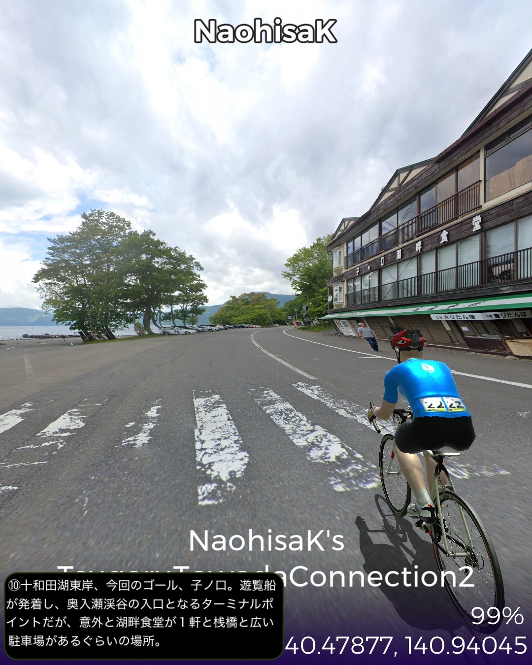 VRサイクリング 津軽・十和田コネクション2日目。津軽平野を横切り黒石経由で十和田湖周遊コース。五所川原駅前をスタートし、秀麗な岩木山を横目で愛でつつ広大な津軽平野を横断し、津軽平野のどん詰まり山懐に抱かれた古い街並みの黒石市街を経て、黒石温泉郷を冷やかしつつ山奥へと分入り峠を越すとそこに神秘の湖十和田湖。十和田湖を反時計回りに2/3周、賑やかな南岸の湖畔休屋を通り抜け十和田湖東岸の子ノ口に至る超長丁場94kmの行程。前半は眠くなるような広大な津軽平野をひた走るだけで特にめぼしい場所はなかったが、ノーマークだった黒石市街とその近郊の黒石温泉郷が良かったのである。黒石はこじんまりとした町であるが、黒石市中町伝統的建造物群保存地区に指定された一角は、えんじ色のトタン屋根に焦げ茶色の年季を感じさせる木造商家に、「こみせ」と呼ばれるえんじ色の屋根のアーケードが一体化した家並みになっているのが非常にユニークな魅力であり、ここは是非リアルにも訪れてみたくなった。黒石温泉郷も山懐に抱かれて情緒あふれる自炊設備のある木賃宿から洗練された温泉旅館まで幅広い受け口のある温泉地帯で、特に1つだけ離れているランプの湯で有名な青荷温泉は昔から訪れてみたい場所だった。十和田湖は中学校の修学旅行で訪れた場所で、今やその時の具体的な情景は思い出せないが、広大で神秘的なカルデラ湖の印象はその頃と同じに感じられた。