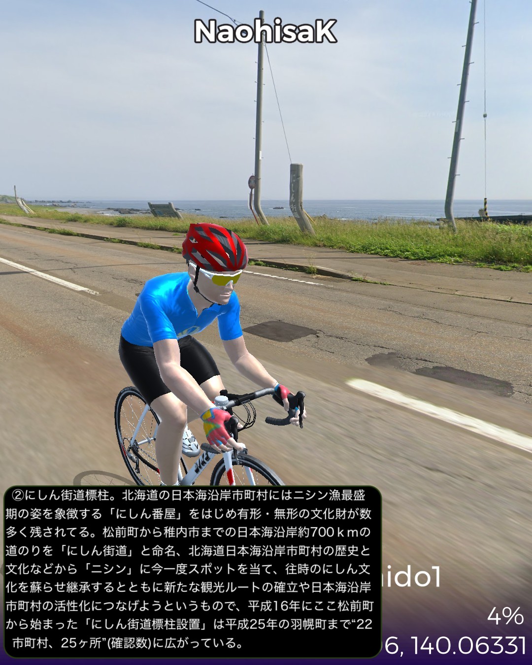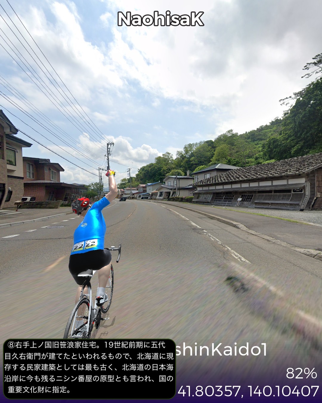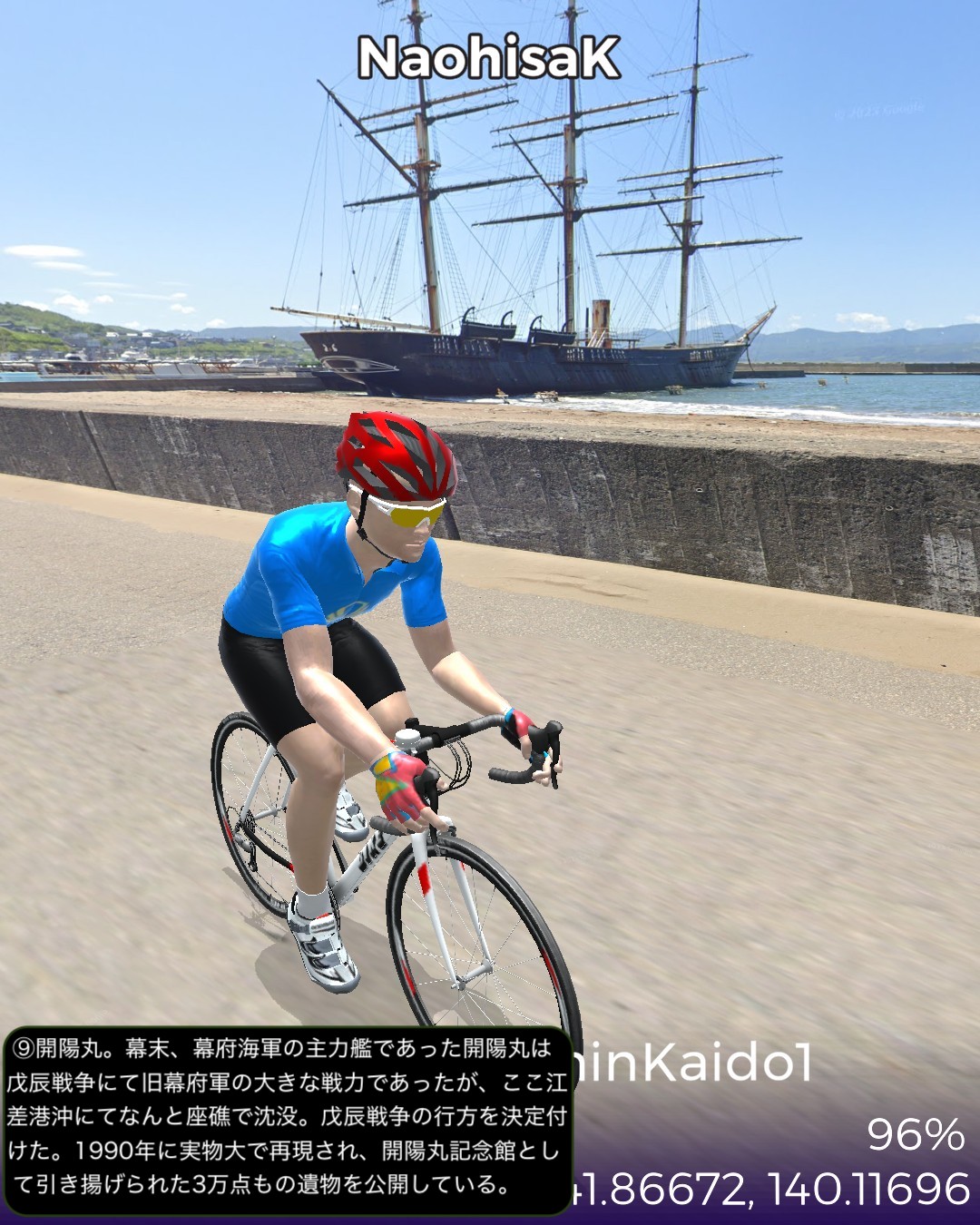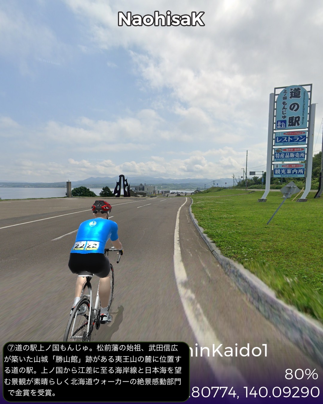 VRサイクリング。北海道の南西の端から日本海沿岸を北上する。北海道の日本海沿岸の道を「にしん街道」と名付けている団体があるので、その名称を拝借して今回は1日目。北海道唯一の城下町松前を出発し、海岸沿いを北へ向かってひた走る。いくつもの小さな漁村を通り過ぎ比較的開けた町上ノ国を過ぎてしばらく進み、にしん漁で栄えた江差に到達する67kmの行程。今回のルート上は、緑色のブッシュで彩られた海岸段丘がずっと続くが、左手に広大な日本海を眺めつつその段丘を登ったり下ったりしつつ進む絶景ルートであるが、それも延々と続くと飽きてくる。ひょっとしたら北海道の海岸はずっとこの同じパターンの繰り返しか。この間漁村は点在するが地形的に大きな良港が見当たらないなかで、今回のゴールに近い上ノ国と江差は地形的に湾となっていて良港の条件が整っている。幕末に幕府が誇る軍艦開陽丸が、戊辰戦争において、旧幕府軍の用心棒的戦力になっていたのだが、江差港で嵐をやり過ごしていて座礁し沈没の憂き目に遭った。敵の攻撃ではなく自ら座礁してしまったところが残念すぎる最期であったが、その開陽丸がそっくり再現されて開陽丸記念館として引き揚げられた3万点もの遺物を公開している。江差はかつてニシン漁で栄えたことで知られている。辺境の地にありながら江差の品揃えは江戸、大阪と変わらないと言われた繁栄の時代の名残りが、町に点在する鰊御殿と呼ばれる大きな木造建築物に顕れている。広い道に大振りの木造建築が建ち並ぶ開放的な街並みはユニークで、アクセス的には非常に遠い町であるがリアルに訪れてみたいと思った。