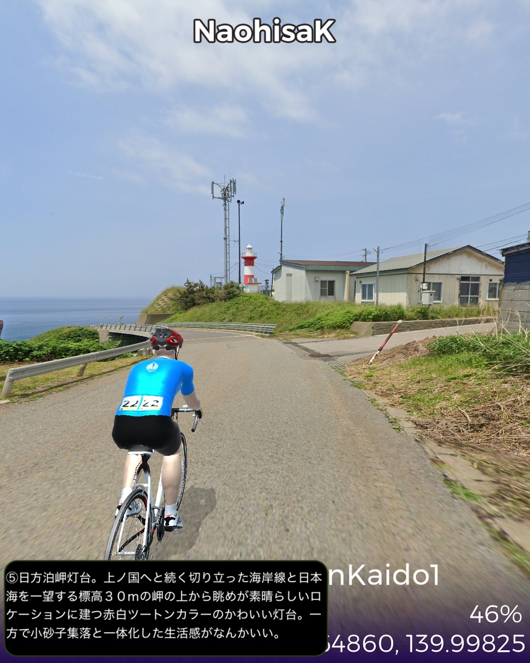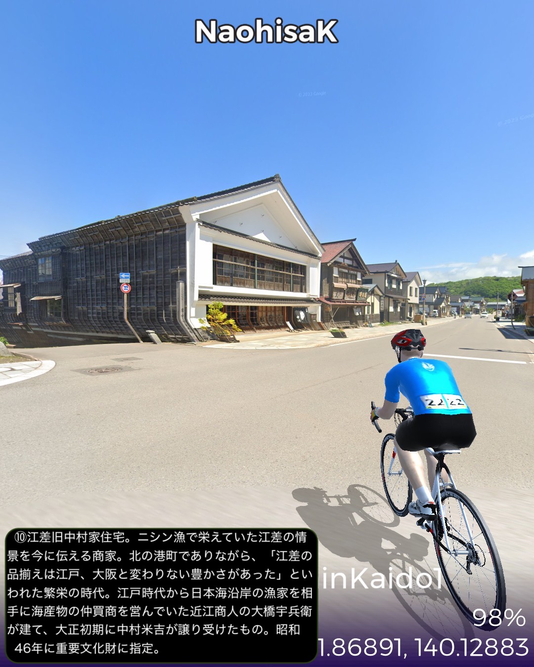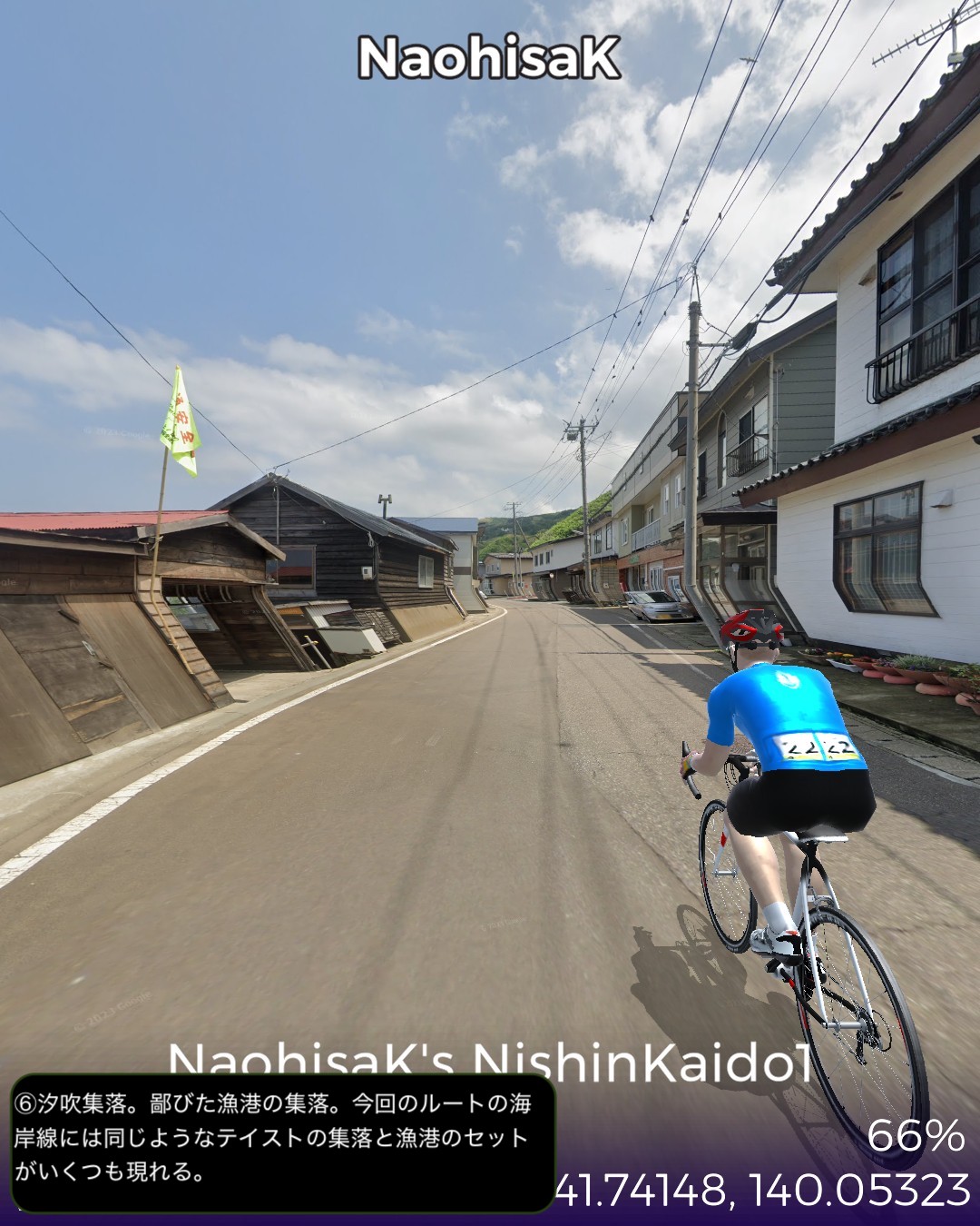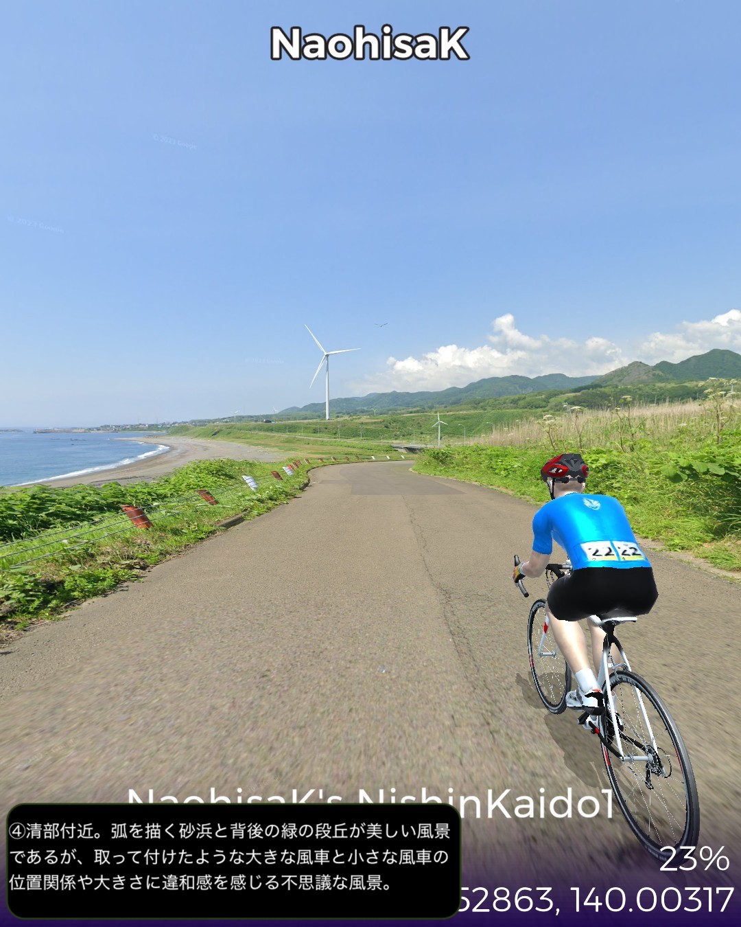 VRサイクリング。北海道の南西の端から日本海沿岸を北上する。北海道の日本海沿岸の道を「にしん街道」と名付けている団体があるので、その名称を拝借して今回は1日目。北海道唯一の城下町松前を出発し、海岸沿いを北へ向かってひた走る。いくつもの小さな漁村を通り過ぎ比較的開けた町上ノ国を過ぎてしばらく進み、にしん漁で栄えた江差に到達する67kmの行程。今回のルート上は、緑色のブッシュで彩られた海岸段丘がずっと続くが、左手に広大な日本海を眺めつつその段丘を登ったり下ったりしつつ進む絶景ルートであるが、それも延々と続くと飽きてくる。ひょっとしたら北海道の海岸はずっとこの同じパターンの繰り返しか。この間漁村は点在するが地形的に大きな良港が見当たらないなかで、今回のゴールに近い上ノ国と江差は地形的に湾となっていて良港の条件が整っている。幕末に幕府が誇る軍艦開陽丸が、戊辰戦争において、旧幕府軍の用心棒的戦力になっていたのだが、江差港で嵐をやり過ごしていて座礁し沈没の憂き目に遭った。敵の攻撃ではなく自ら座礁してしまったところが残念すぎる最期であったが、その開陽丸がそっくり再現されて開陽丸記念館として引き揚げられた3万点もの遺物を公開している。江差はかつてニシン漁で栄えたことで知られている。辺境の地にありながら江差の品揃えは江戸、大阪と変わらないと言われた繁栄の時代の名残りが、町に点在する鰊御殿と呼ばれる大きな木造建築物に顕れている。広い道に大振りの木造建築が建ち並ぶ開放的な街並みはユニークで、アクセス的には非常に遠い町であるがリアルに訪れてみたいと思った。