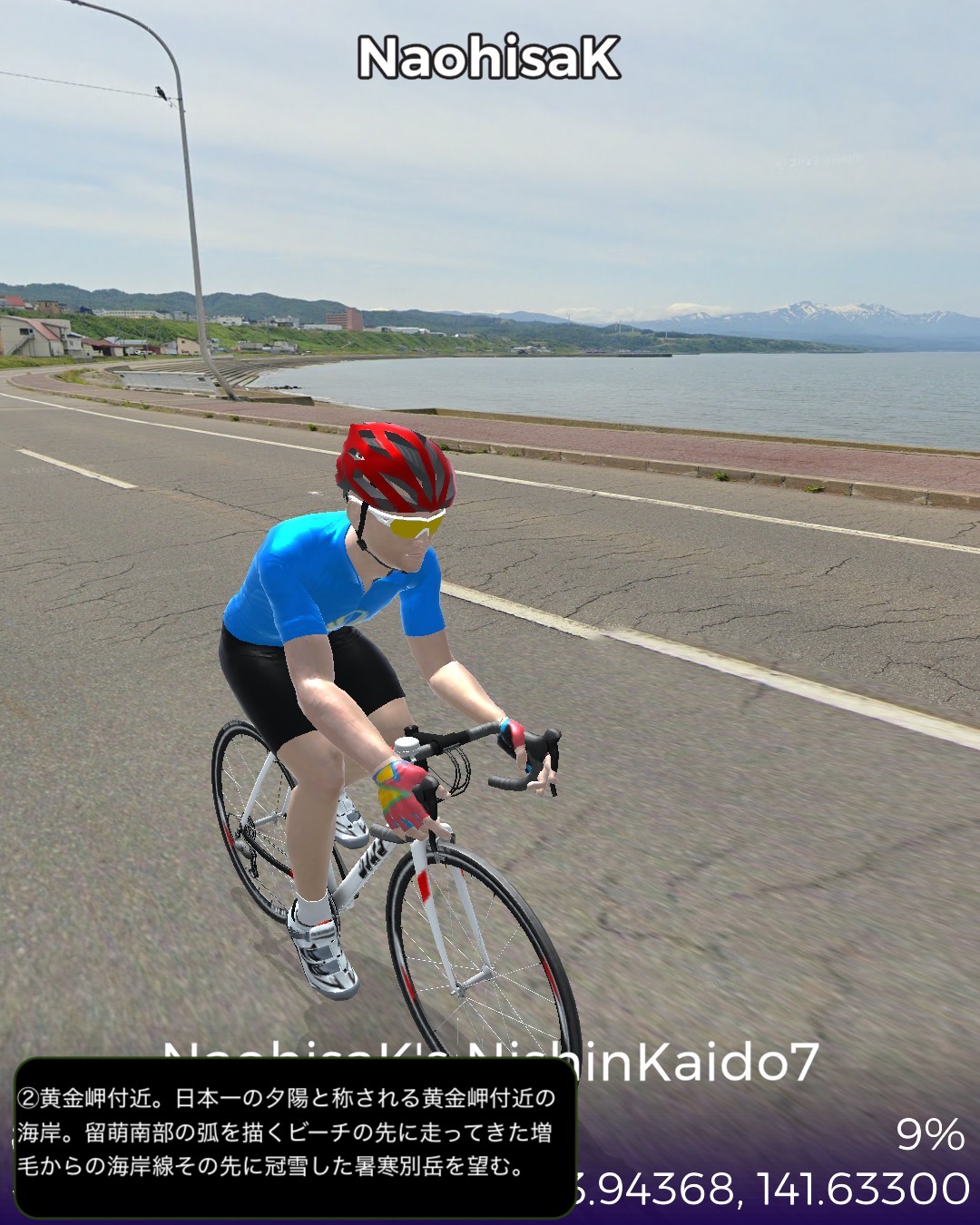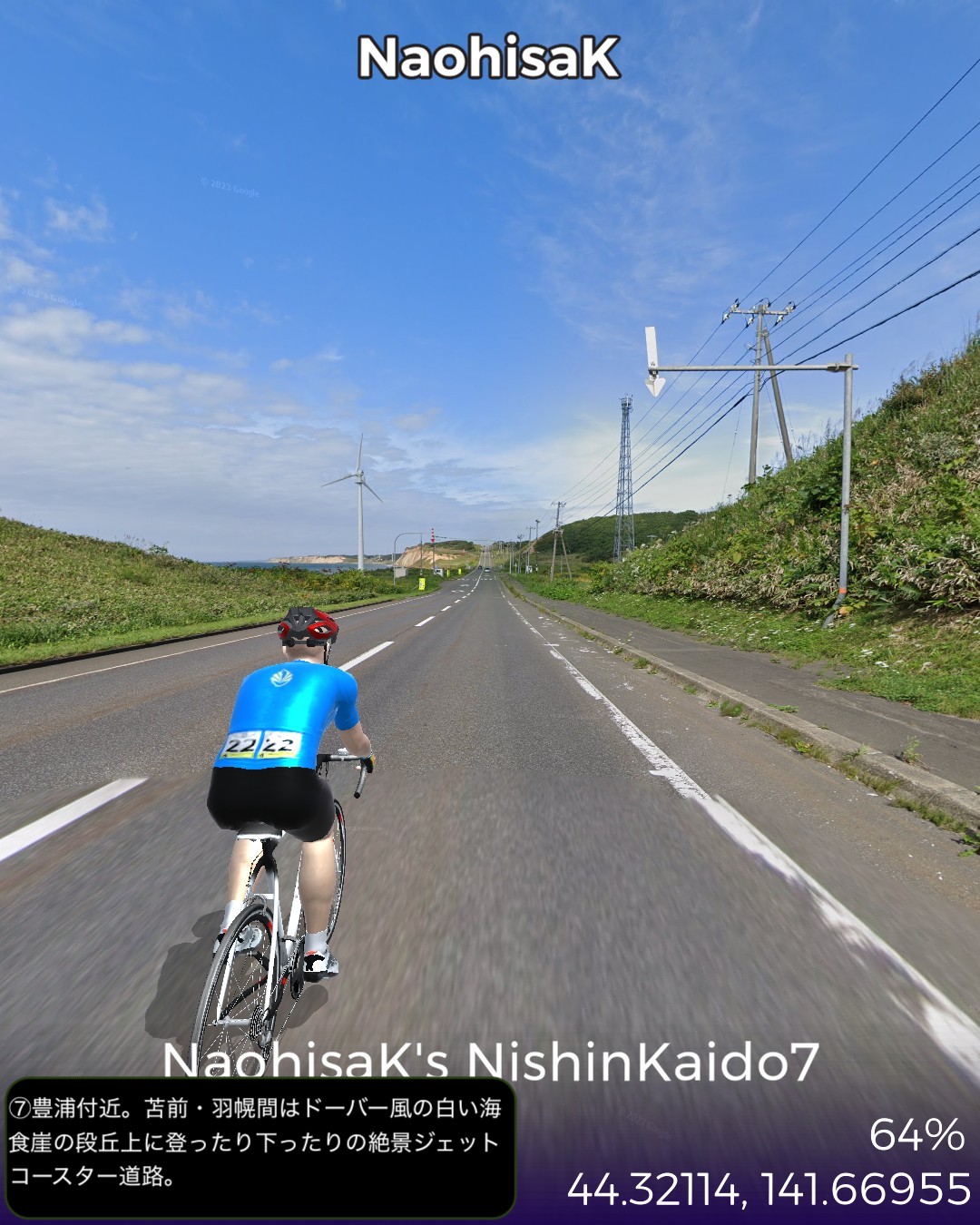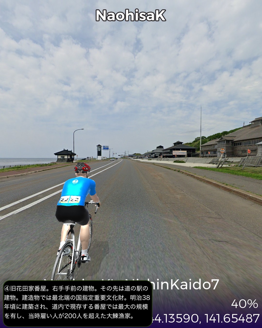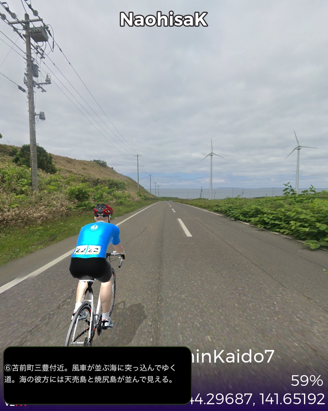 VRサイクリング、日本海沿岸に戻ってひたすら北上の巻。ということでタイトルもにしん街道に戻ってその7日目。前回増毛に到達する前に山から海岸に出た地点をスタート地点として海岸沿いに北へ向かう。ほどなく北海道北部日本海沿岸の中心都市、留萌を経て小平、そして苫前と進む。海の向こうに天売島、焼尻島のシルエットが見えてきたらしばらくして羽幌に到達。さらに海岸沿いを進み初山別村の集落の先の初山別みさき公園をゴールとする93kmの行程。留萌はもっと鄙びた漁業の町を想像していたら意外と大きな町でちょっと驚いた。商業地域の広がりが結構大きく、北海道の日本海沿岸では多分小樽を除くと最大の町ではなかろうか。やはりニシン漁で賑わってきた町のようであるが、現在でもカズノコの国内最大の加工地となっていて水産加工業中心に成立している都市のようだ。それでもJR留萌本線は利用者減少に歯止めが効かずとうとう今年の3月で廃線となった。高速道路などの代替手段も確立してきたこともあるようだ。留萌から小平にかけては大きな鰊番屋が点在して、この辺も鰊漁の1つの中心であったことが窺える。苫前から先は、低いがウネウネした起伏の激しい海岸段丘が続き、道は主にその段丘上を水平方向にはほぼ直線なのに段丘に沿って上下するジェットコースター道路となり、広がる日本海と、崖が露出する海岸線とウネウネする緑の海岸段丘のダイナミックな風景が展開し、なかなか他で見られない特有の絶景が延々と展開する。