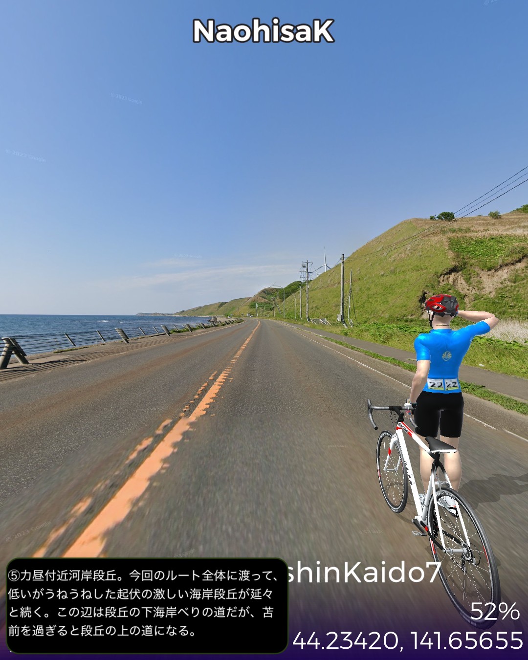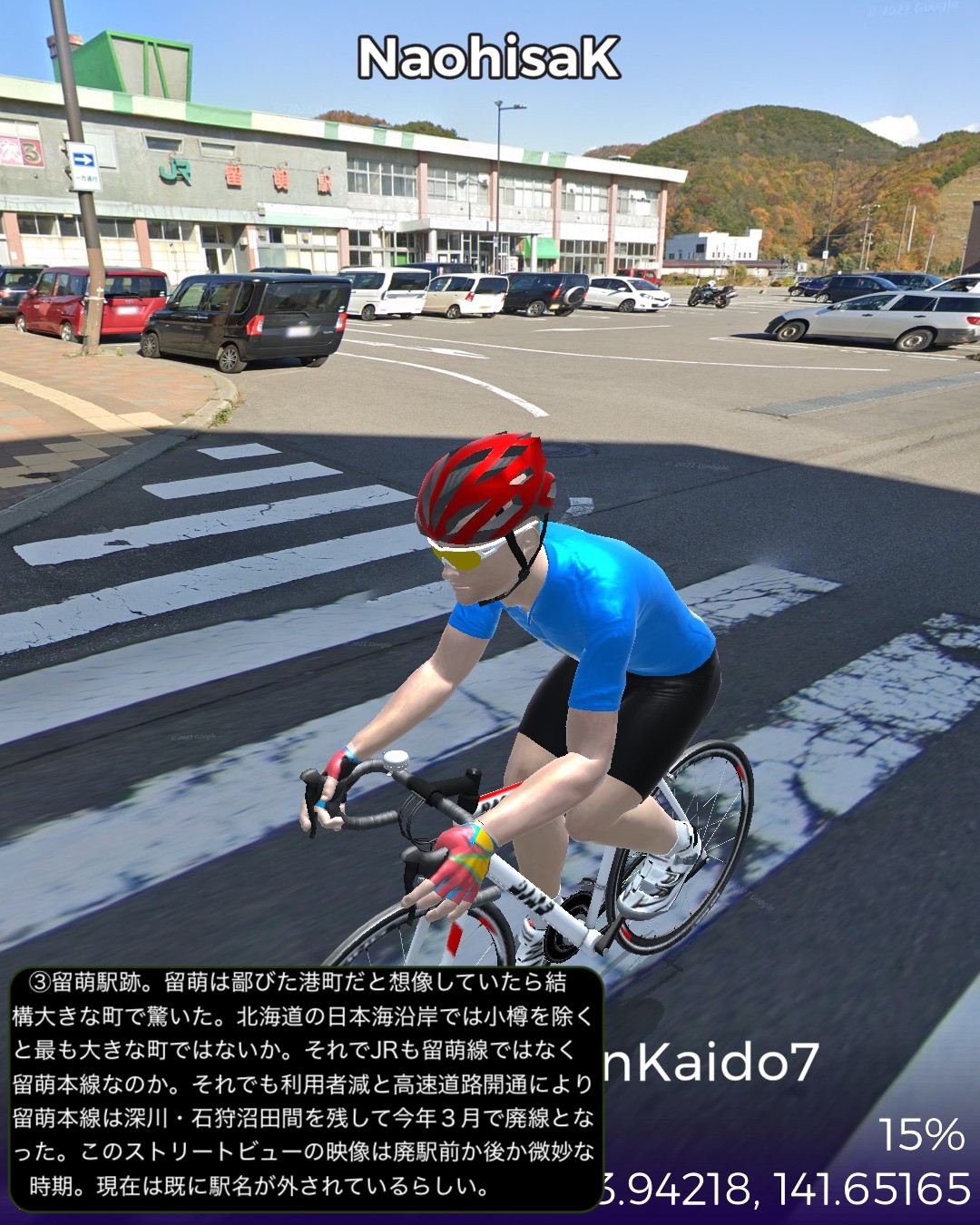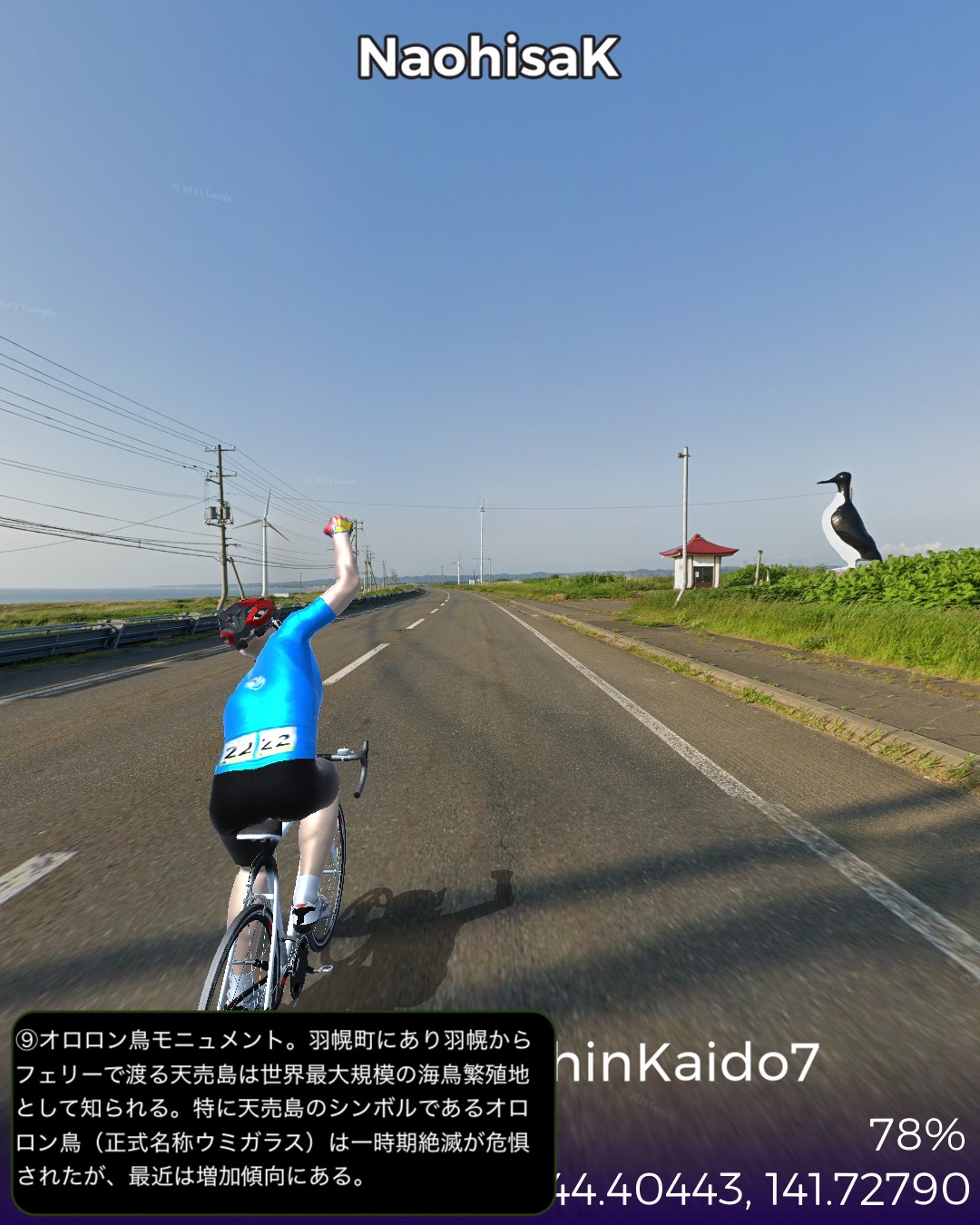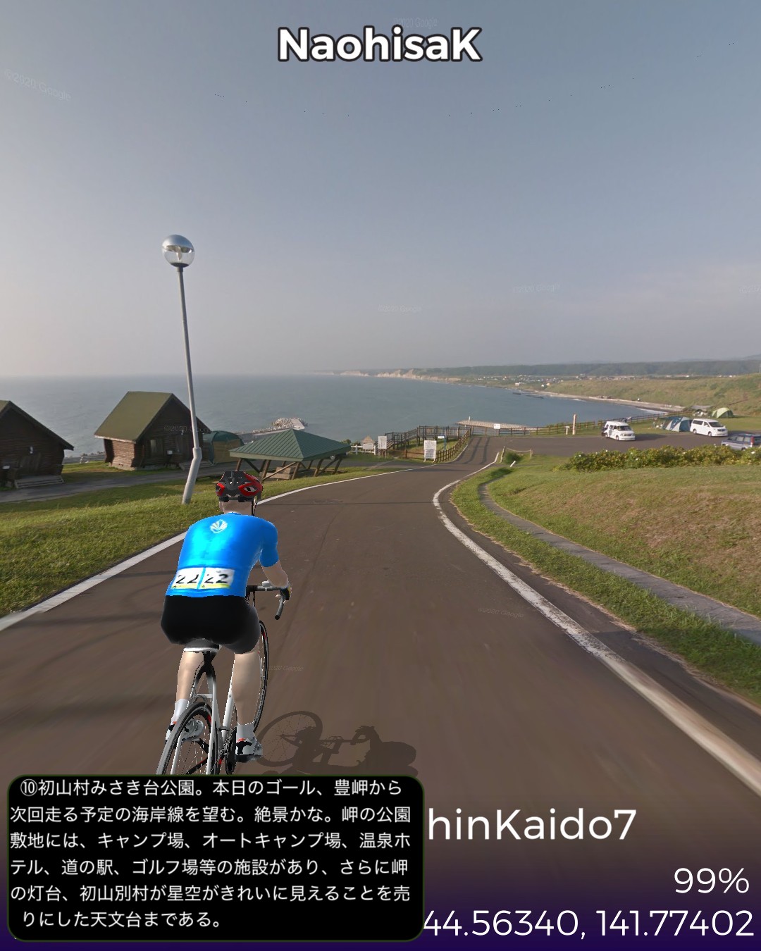 VRサイクリング、日本海沿岸に戻ってひたすら北上の巻。ということでタイトルもにしん街道に戻ってその7日目。前回増毛に到達する前に山から海岸に出た地点をスタート地点として海岸沿いに北へ向かう。ほどなく北海道北部日本海沿岸の中心都市、留萌を経て小平、そして苫前と進む。海の向こうに天売島、焼尻島のシルエットが見えてきたらしばらくして羽幌に到達。さらに海岸沿いを進み初山別村の集落の先の初山別みさき公園をゴールとする93kmの行程。留萌はもっと鄙びた漁業の町を想像していたら意外と大きな町でちょっと驚いた。商業地域の広がりが結構大きく、北海道の日本海沿岸では多分小樽を除くと最大の町ではなかろうか。やはりニシン漁で賑わってきた町のようであるが、現在でもカズノコの国内最大の加工地となっていて水産加工業中心に成立している都市のようだ。それでもJR留萌本線は利用者減少に歯止めが効かずとうとう今年の3月で廃線となった。高速道路などの代替手段も確立してきたこともあるようだ。留萌から小平にかけては大きな鰊番屋が点在して、この辺も鰊漁の1つの中心であったことが窺える。苫前から先は、低いがウネウネした起伏の激しい海岸段丘が続き、道は主にその段丘上を水平方向にはほぼ直線なのに段丘に沿って上下するジェットコースター道路となり、広がる日本海と、崖が露出する海岸線とウネウネする緑の海岸段丘のダイナミックな風景が展開し、なかなか他で見られない特有の絶景が延々と展開する。