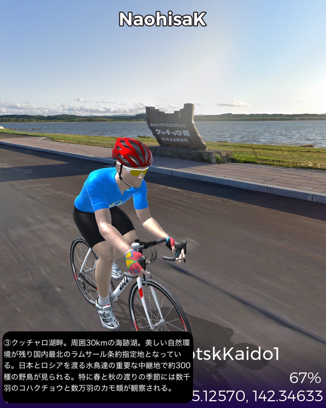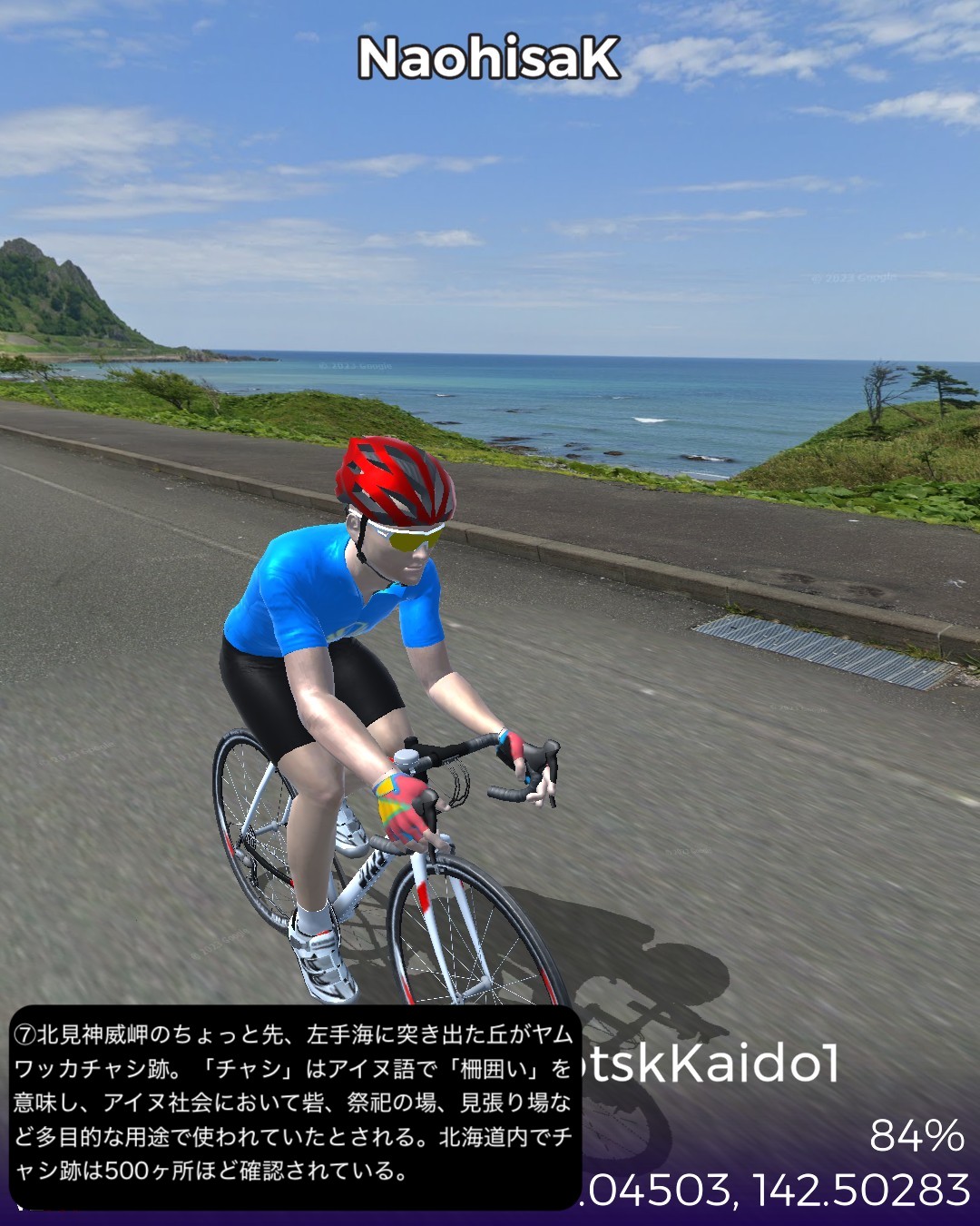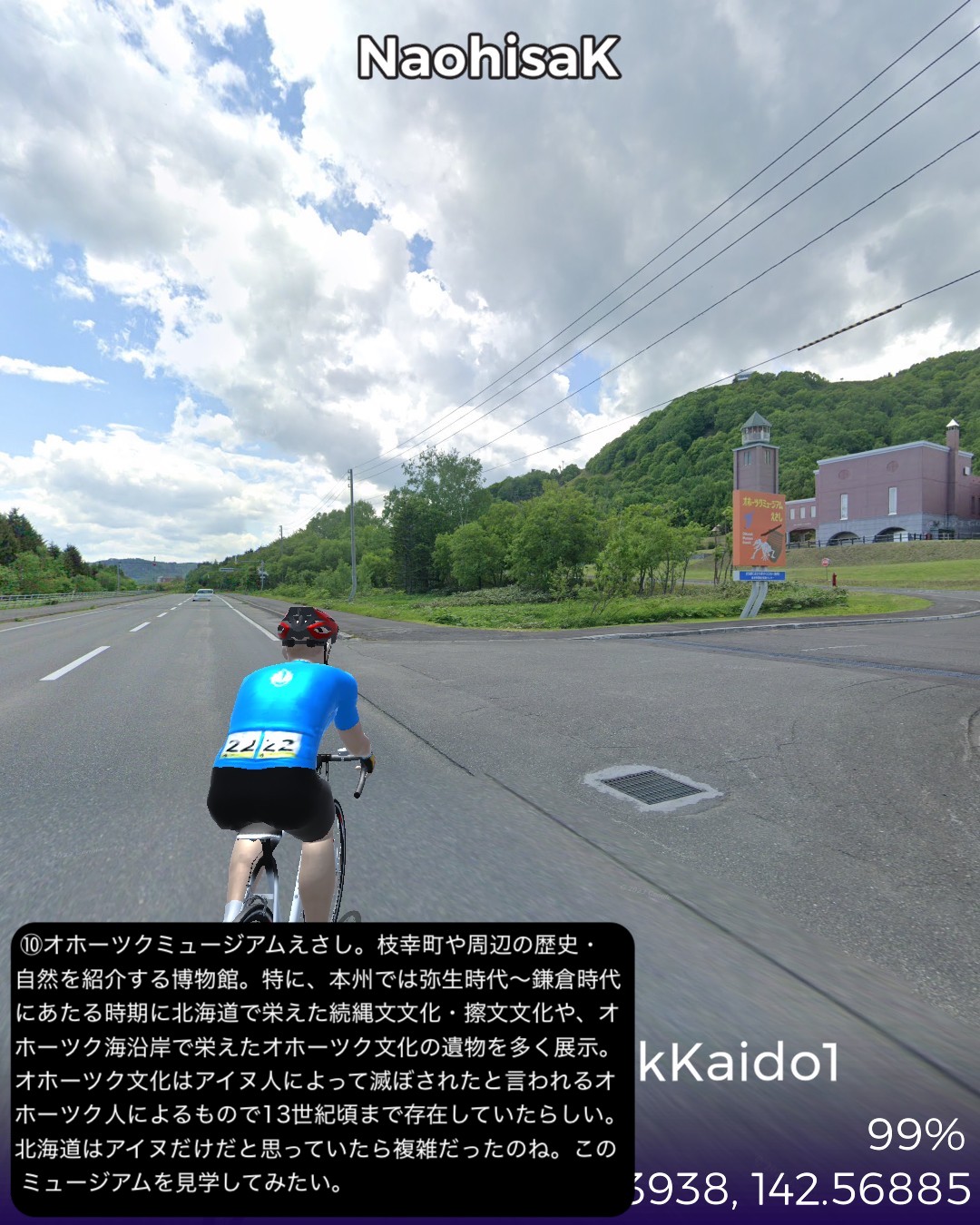 VRサイクリング オホーツク街道2日目。オホーツク海沿岸をさらに南東へ進む。当初1つのルートの想定であった後半部分をゆく。猿払村と浜頓別町の境界付近の安別を出発し、道北最大の湖クッチャロ湖の後方をぐるっと廻って浜頓別へ。ここまでは内陸ルートであるが、ここからオホーツク海沿いの道に戻り、北見神威岬を経てカニの町枝幸に至る53kmの行程。クッチャロ湖は一般には知られていないが、ラムサール条約で指定された自然環境が素晴らしい湖。日本とロシアを渡る水鳥達の重要な中継地で約300種もの野鳥が見られる。特に春と秋の渡りの季節には数千羽のコハクチョウと数万羽のカモ類が集うという。これは壮観だろうなあ、観てみたい。猿払村から浜頓別町のオホーツク海岸はほぼ真っ直ぐな浜が50km以上続いていたが、浜頓別の先で険しい山が海に迫る北見神威岬が突如現れる。神威岬とは神が宿る岬という意味でアイヌの聖地で昔は険しい山道の難所だったという。岬の巨大な岩山の中腹に建つ北見神威岬灯台は難攻不落の要塞のようで岬の海沿いの道から見上げると迫力ある図になる。今回のゴールは枝幸の町外れの山の麓に建つオホーツクミュージアム。ここでは北海道独自の先史時代としてアイヌ以前の続縄文文化・擦文文化と共に、アイヌとも異なるオホーツク人によるオホーツク文化が別途花開いていたことを教えてくれる展示になっているようだ。興味あるなあ。