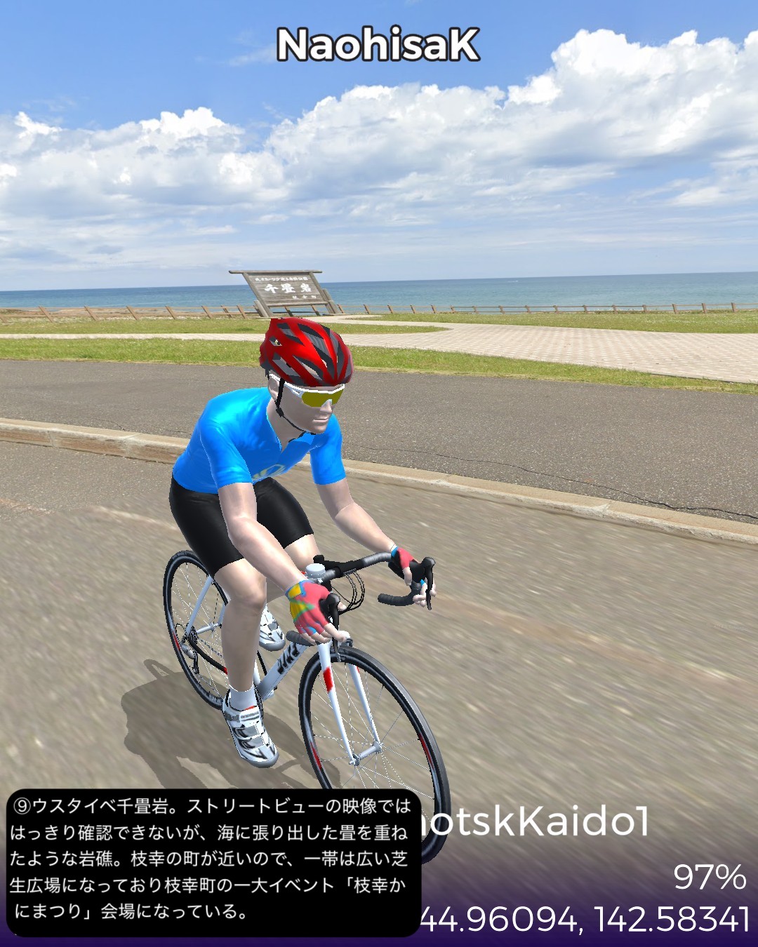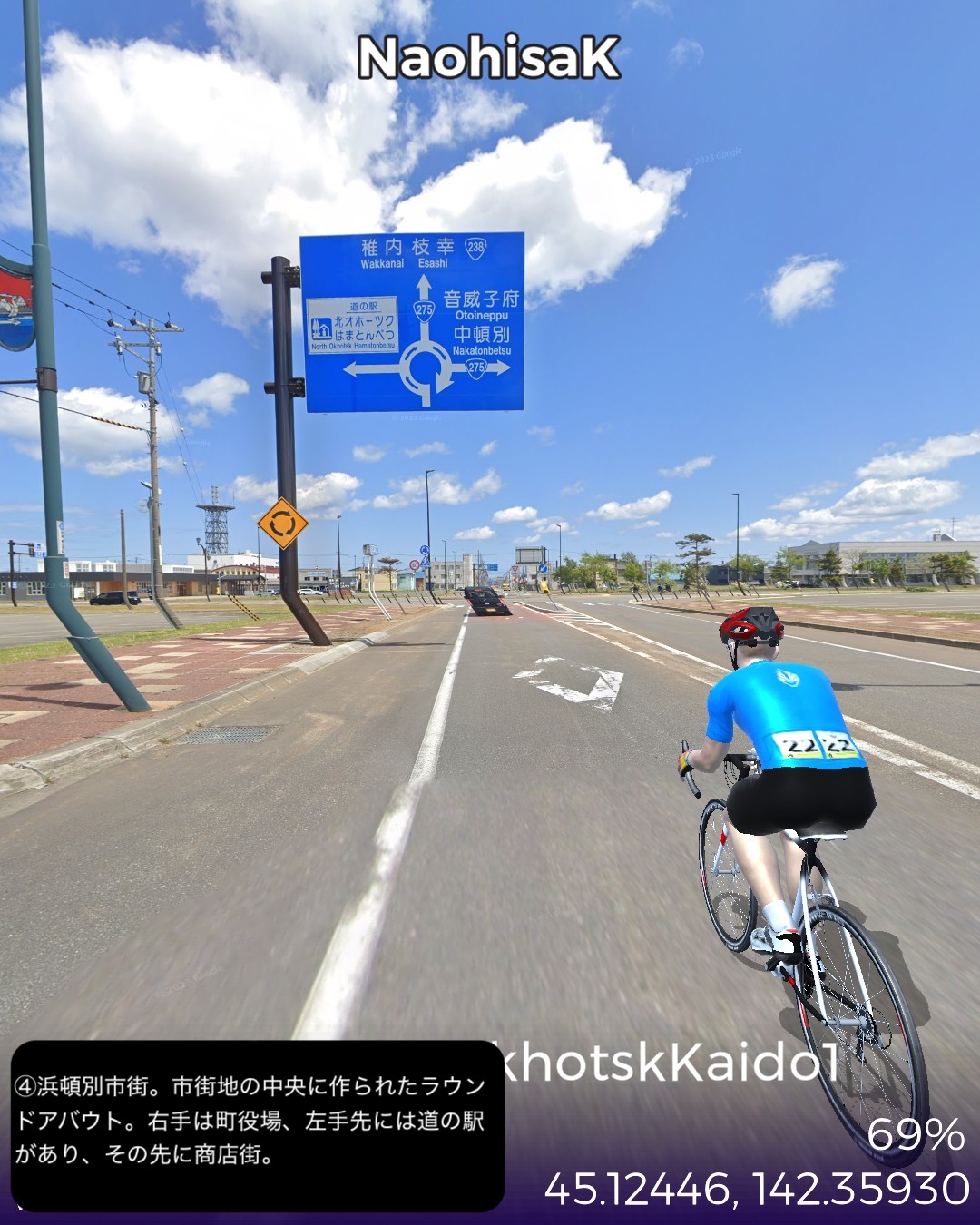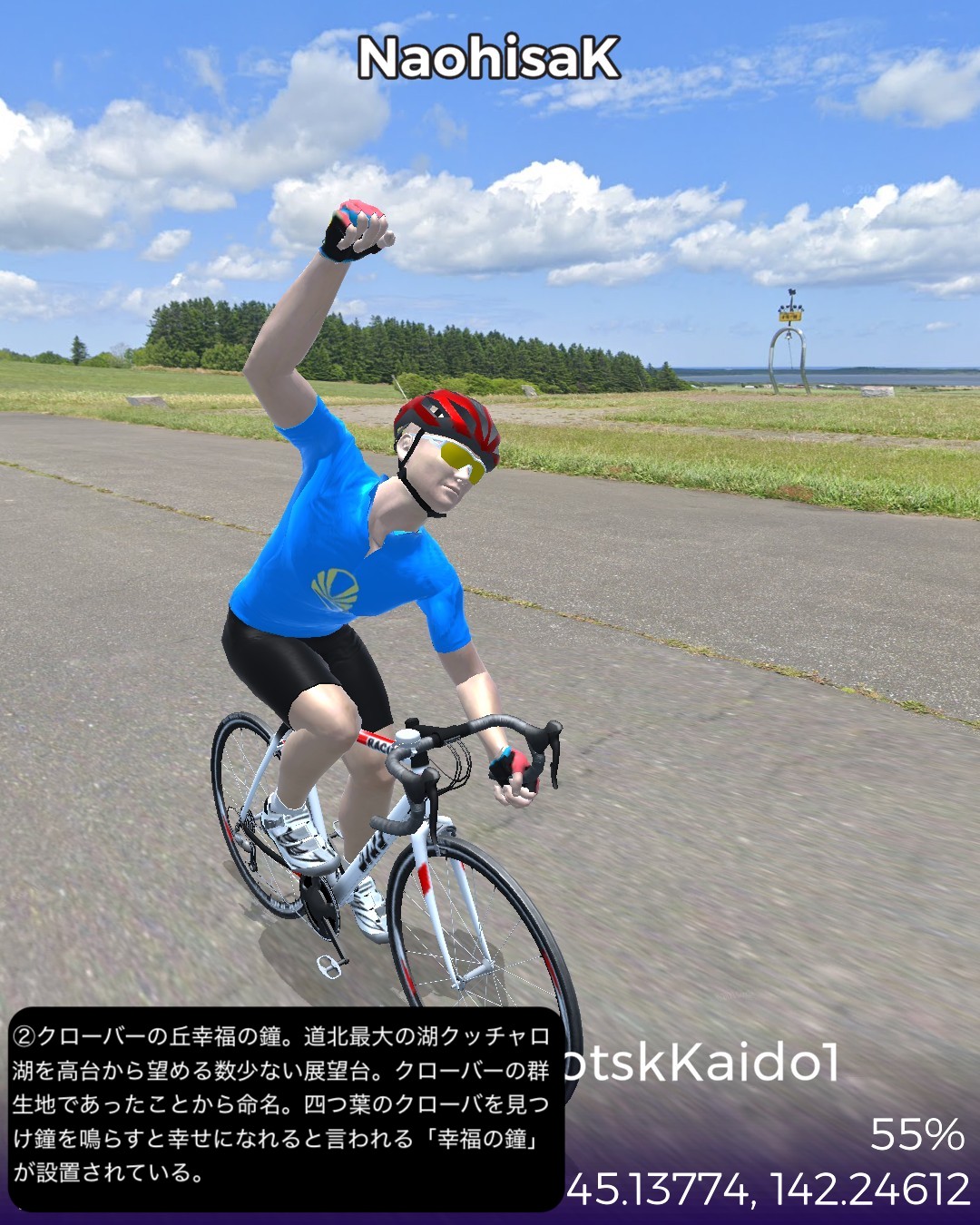 VRサイクリング オホーツク街道2日目。オホーツク海沿岸をさらに南東へ進む。当初1つのルートの想定であった後半部分をゆく。猿払村と浜頓別町の境界付近の安別を出発し、道北最大の湖クッチャロ湖の後方をぐるっと廻って浜頓別へ。ここまでは内陸ルートであるが、ここからオホーツク海沿いの道に戻り、北見神威岬を経てカニの町枝幸に至る53kmの行程。クッチャロ湖は一般には知られていないが、ラムサール条約で指定された自然環境が素晴らしい湖。日本とロシアを渡る水鳥達の重要な中継地で約300種もの野鳥が見られる。特に春と秋の渡りの季節には数千羽のコハクチョウと数万羽のカモ類が集うという。これは壮観だろうなあ、観てみたい。猿払村から浜頓別町のオホーツク海岸はほぼ真っ直ぐな浜が50km以上続いていたが、浜頓別の先で険しい山が海に迫る北見神威岬が突如現れる。神威岬とは神が宿る岬という意味でアイヌの聖地で昔は険しい山道の難所だったという。岬の巨大な岩山の中腹に建つ北見神威岬灯台は難攻不落の要塞のようで岬の海沿いの道から見上げると迫力ある図になる。今回のゴールは枝幸の町外れの山の麓に建つオホーツクミュージアム。ここでは北海道独自の先史時代としてアイヌ以前の続縄文文化・擦文文化と共に、アイヌとも異なるオホーツク人によるオホーツク文化が別途花開いていたことを教えてくれる展示になっているようだ。興味あるなあ。