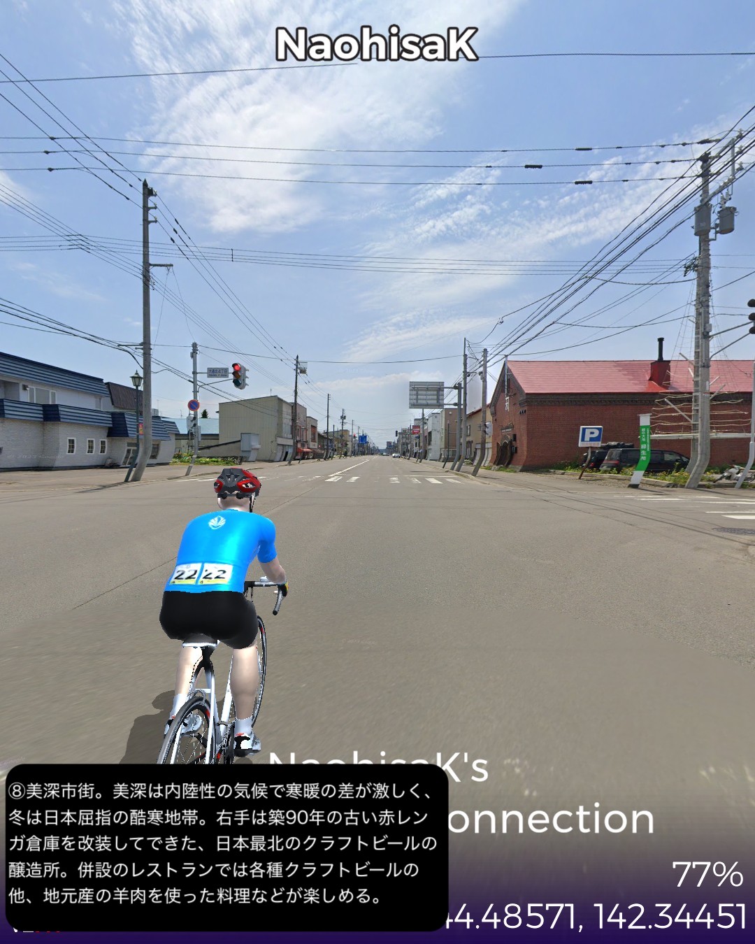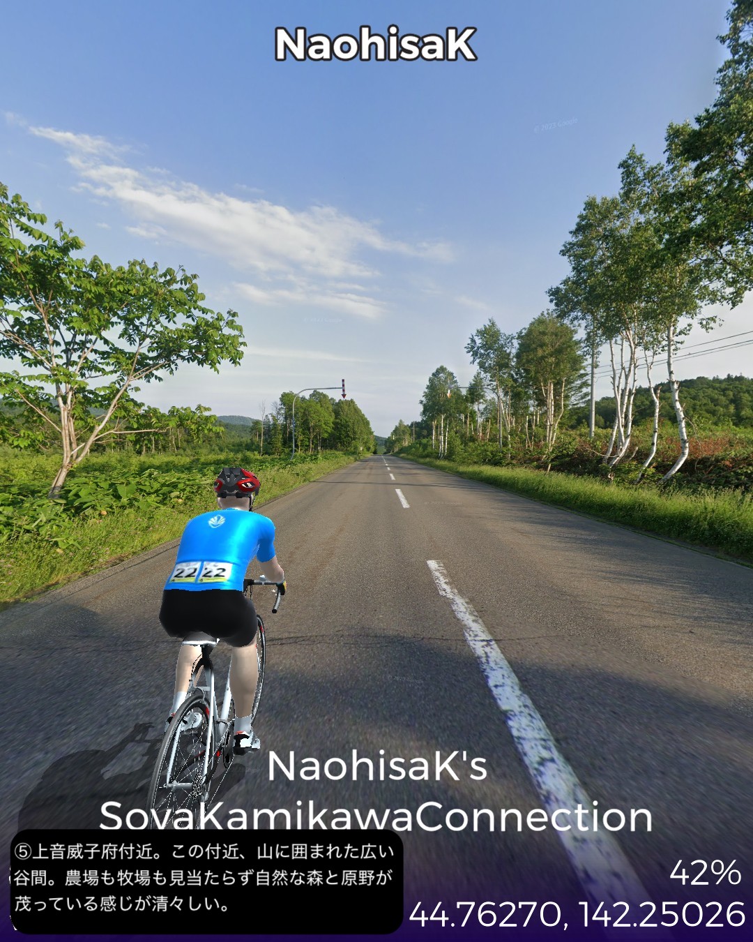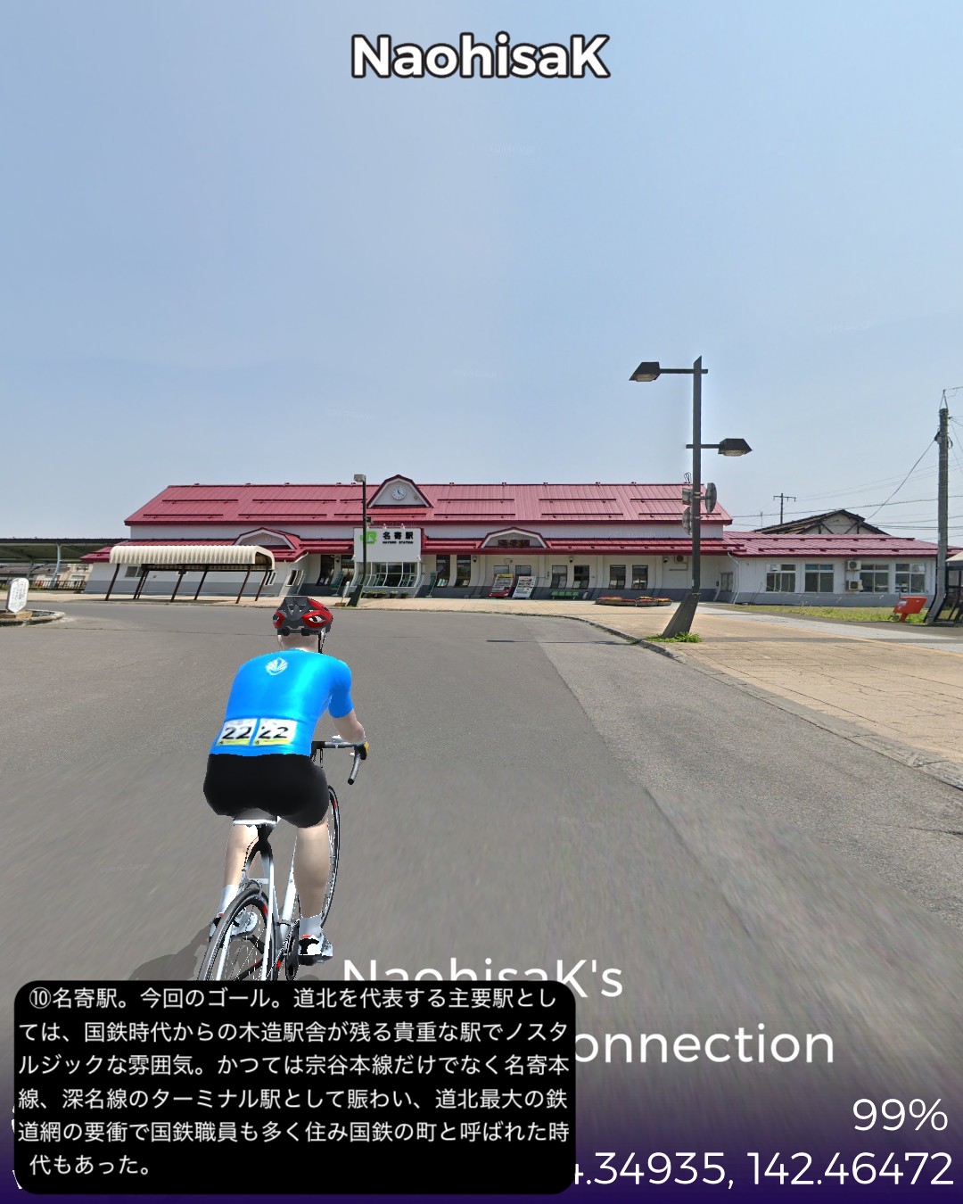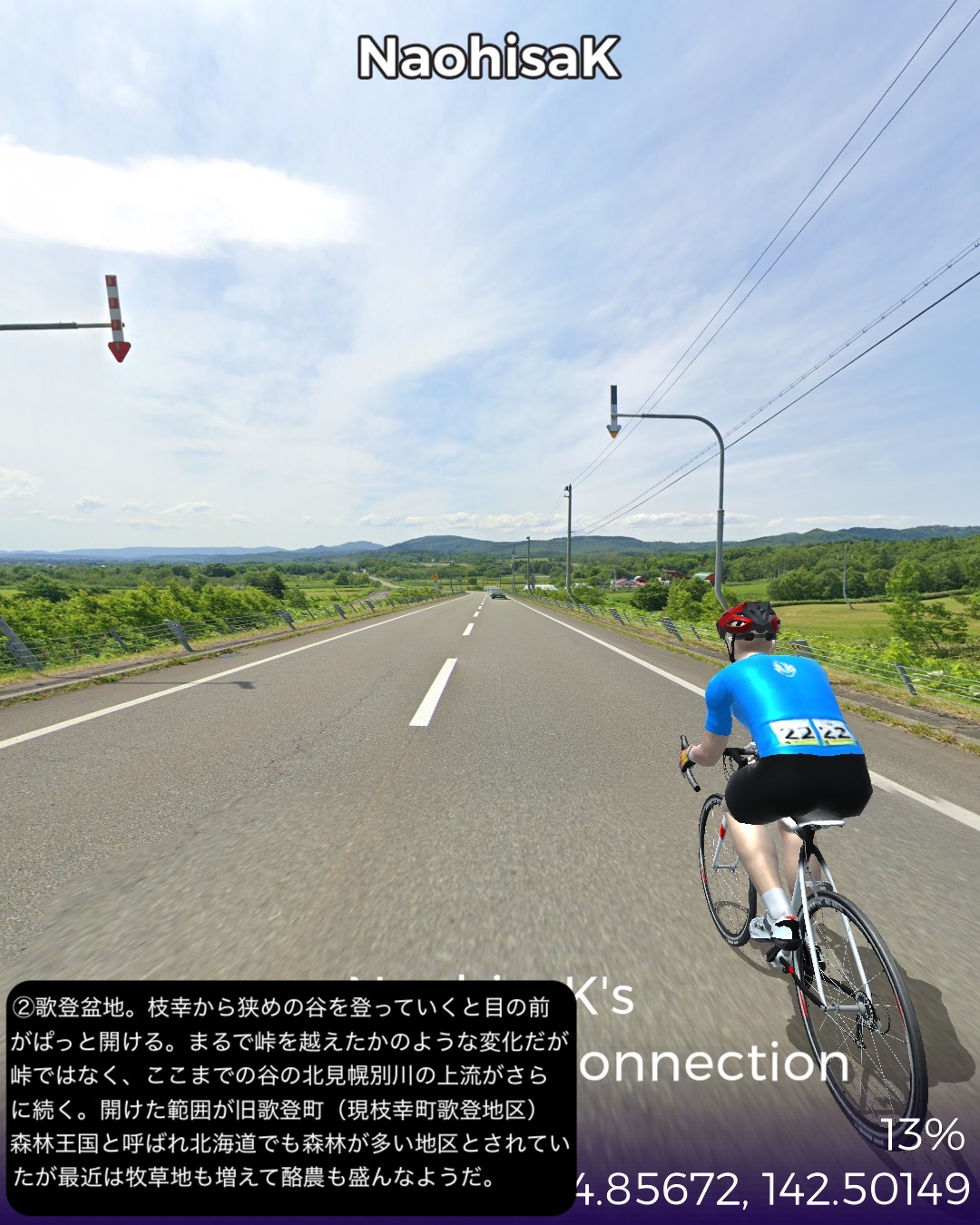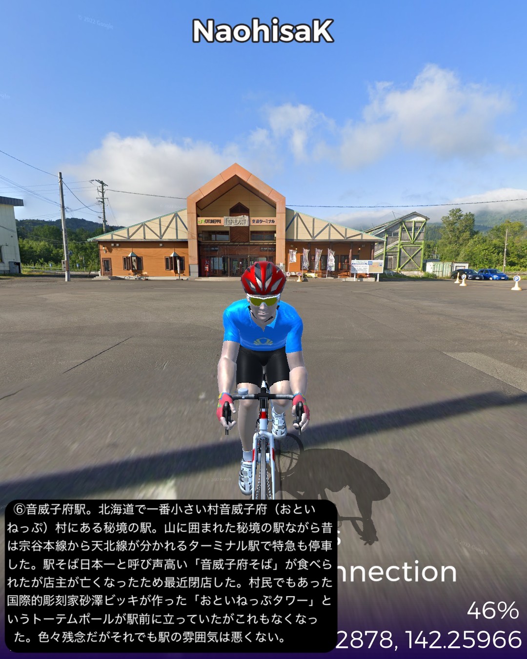 VRサイクリング オホーツク沿岸から一旦内陸に入る。宗谷地方から上川地方へ抜ける道ということでとりあえず宗谷・上川コネクションというルート名をつけておく。宗谷地方オホーツク沿岸のカニの町枝幸をスタートして、西の内陸に向けてひた走る。歌登町を経て北海道の中心線に近い音威子府(おといねっぷ)村へ。そこからは南に進路を転じ、北海道第二の大河天塩川の形成する広い谷を遡って、美深町を経て道北の1つの中心都市名寄に到達する103kmの行程。日本海側でもそうだったが海岸ばかり走っているのも飽きるのでちょっと内陸に入って気分転換というところだ。小学生の頃、国鉄の駅名を覚えて稚内から鹿児島まで各駅停車で全て暗唱する、というトライアルをしたことがある。確か1回ぐらい成功したような気がするが、稚内から暗唱を始めると最初の方で出てくる「音威子府(おといねっぷ)」という駅名の音感にエキゾチックな響きを感じて勝手に秘境の駅のイメージを膨らませていたので、特に観光資源がない土地柄なのは承知の上、どんな雰囲気の町なのか駅なのか今回内陸へ入るついでに寄ってみた。音威子府駅のある音威子府村は、山に囲まれて原生林と原野が生茂る土地柄で、観光地になるほどの雄大な自然はないが名も無き秘境の雰囲気を湛えて結構妄想していたイメージに合致した。駅も裏に山が迫る秘境感のあるロケーションで、駅舎も古いままではないが山小屋風で悪くない。秘境の駅ではあるが昔は天北線が分岐する要衝の駅で特急も停車した。知らなかったが音威子府駅には日本一と呼び声高かった駅そばがあって、蕎麦の実を殻ごとひく独自の製法で、そばの風味やコシが強く、麺が真っ黒な蕎麦が人気で、特急の客が停車時間を利用して蕎麦をすすっていたりしていたらしい。また駅前には音威子府村在住であった国際的彫刻家砂澤ビッキが作った「おといねっぷタワー」と呼ばれるトーテムポールが立っていた。残念ながら駅そばもトーテムポールも今はないが妄想に値するエピソードを帯びた駅で、それらがなくなった今もなかなか魅力的であることを確認した。音威子府の話で終わったが次回はまたオホーツク沿岸に戻る。