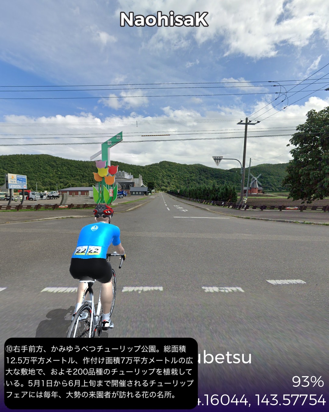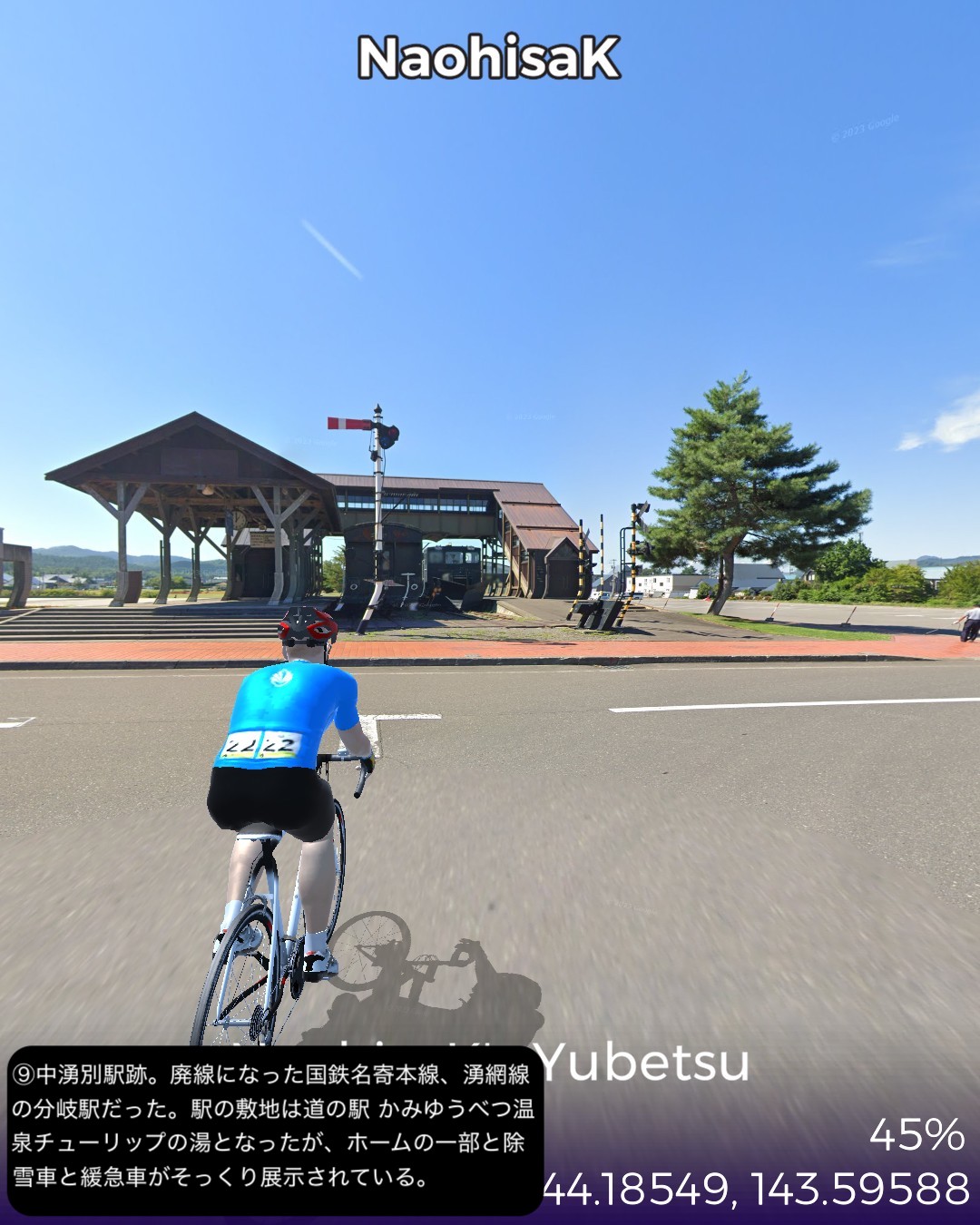 VRサイクリング オホーツク街道3日目。北海道の北東部オホーツク海沿岸を往くオホーツク街道も中盤。ハムとアイスクリームのご当地ブランドとしても名高い興部(おこっぺ)を出発し、またオホーツク海に沿って南東へ進む。流氷の町として有名になった紋別を通って、コムケ湖など小さな海跡湖の点在する原野・牧草地帯を抜けるといつの間にか山が遠のいてだだっ広い平原に出る。平原を形成する湧別川沿いに線状に展開する町湧別を少し内陸へ進み中湧別、さらに上湧別のチューリップ公園をゴールとする64kmの行程。後で気がついたが、前回山の中を進むルートで旧JR名寄本線に沿ってきたが、今回もまだフルに旧名寄本線に沿ったルートとなっていた。今回のゴールの近くに名寄本線と湧網線との分岐点となっていた中湧別駅跡があり、在りし日の跨線橋付きの駅のホームがそのまま保存されていた。これが昭和の映画の1シーンを見ているような懐かしい気分にさせてくれる。ルート途中の紋別は港に向かって緩やかな斜面に市街地が展開していて、町からの港やオホーツク海の眺めが良い。冬だったら港に押し寄せる流氷の臨場感が素晴らしいと想像できる。日常の町の風景といわば非日常の流氷の光景がミックスする絶景はここだけでしか見られないかもしれない。紋別が流氷の町と呼ばれる理由がわかった気がした。