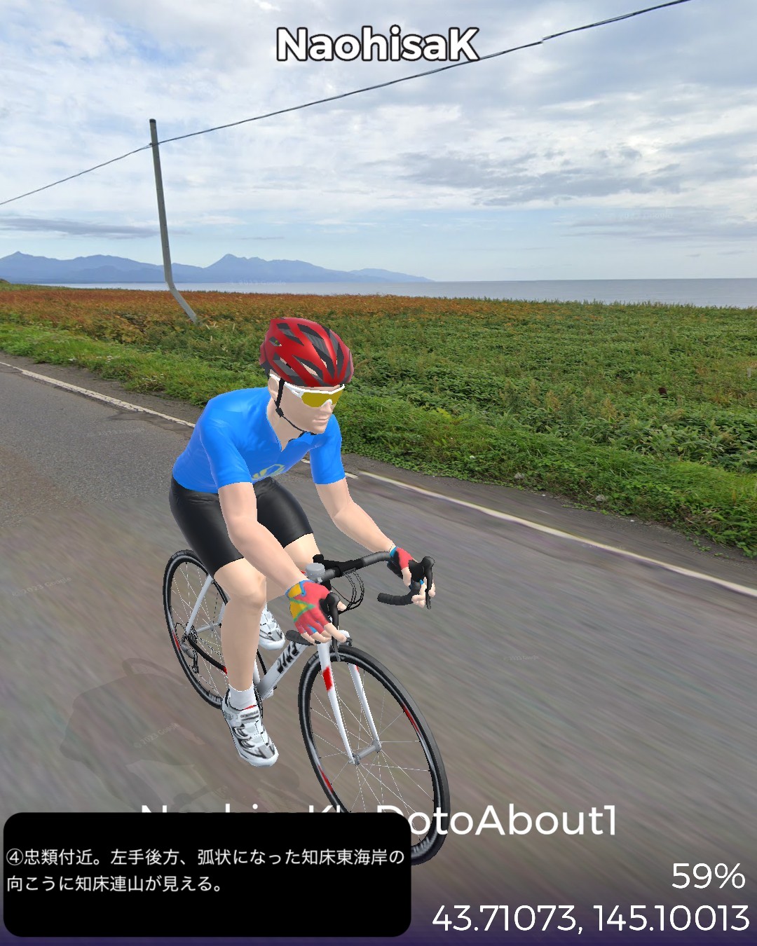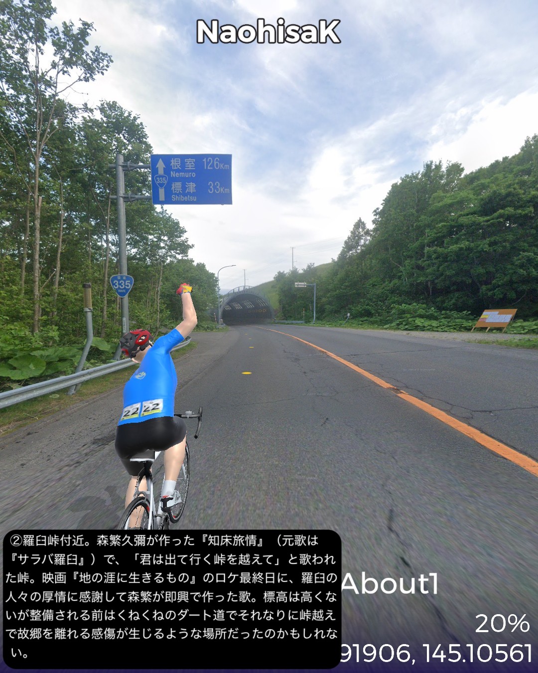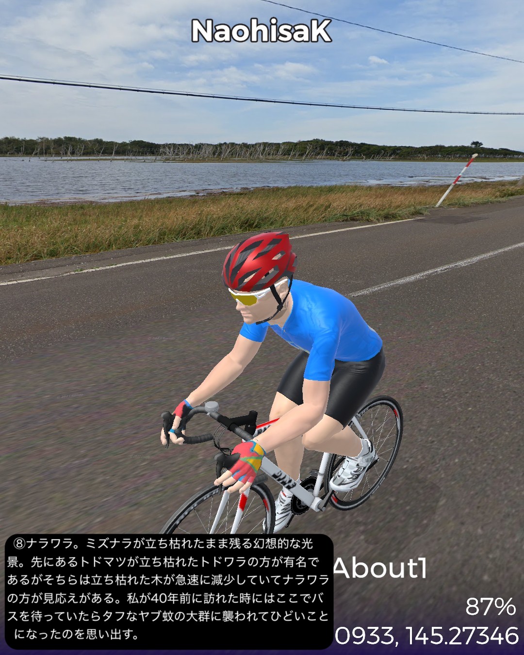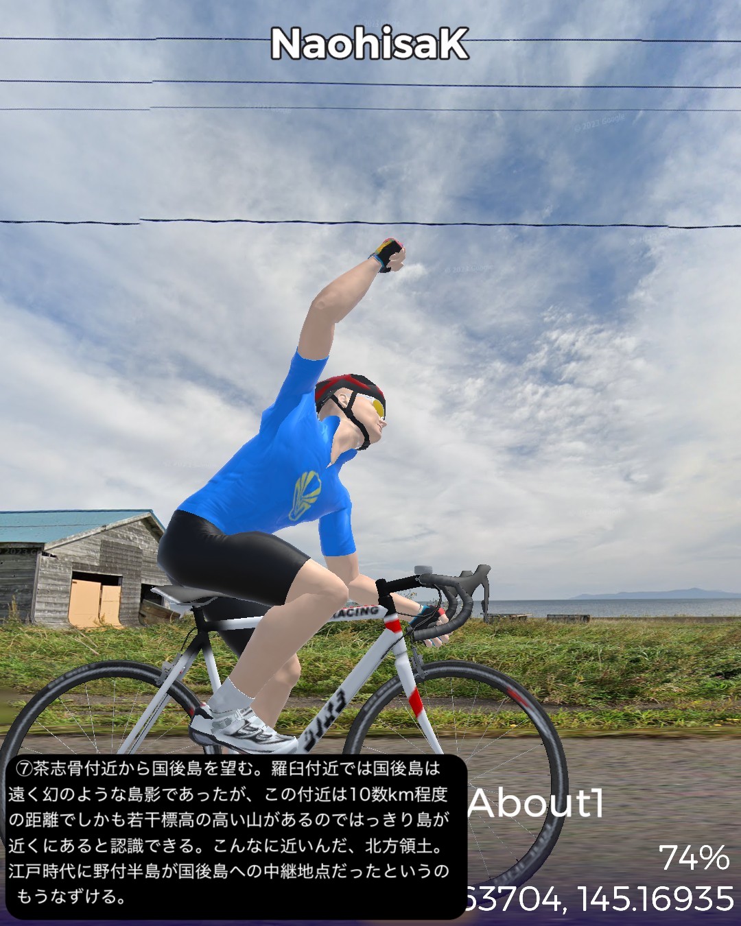 VRサイクリング 知床を抜けていわゆる道東エリアをしばらく2次元的にあちこち回ってみたい。名付けて道東逍遥ルート。「逍遥」とは気ままにあちこちを散歩することとある。散歩ではなくサイクリングであるが「気まま」がキーワードにはなるので当てはめてみる。まずはその1日目。知床の東海岸の中心地羅臼をスタートし、知床半島の東海岸を根本に向けて進む。知床半島を抜けたところで日本有数の鮭の産地標津を通り、桜海老のような野付半島の先端をゴールとする68kmの行程。本日のルートは根室海峡に面した海岸沿いであるが、この海岸ルートを特徴付ける1つは北方領土国後島が常に左手に眺められること。特に標津から野付半島においては国後島と10数kmしか離れておらず手に取るように近くに見える。野付半島は両側を海に挟まれた細長く茫漠たる原野が広がるのみで、サケの定置網の番屋が点在する以外は何もない寂寥感がつのる場所であるが、なんと江戸時代には国後島に渡る中継地として賑わい、遊郭まで備えた幻の町キラクがあったらしい。全く想像すらできないが歴史の浪漫だなあ。もう1つ今回のルートを特徴付けるのはサケの聖地であること。根室海峡に注ぐすべての川はサケ・マスが遡上する川で、毎年秋に繰り返される自然のサイクルでこの地域の人々の営みを1万年に渡って支え続けてきたという。江戸時代には将軍への献上品となるほど高品質さを誇り、そして今もなおサケがこの地域の基幹産業を担っている。標津の町の近くを流れるポー川もそうしたサケが遡上する川の一つだが、その流域には無数の古代住居跡があり遡上するサケで生計を立てていたことが窺える。湿原地帯を狭い水路で無数に蛇行するポー川には名前も含め心惹かれるものがある。この川でカヌーをしてみたいものだ。