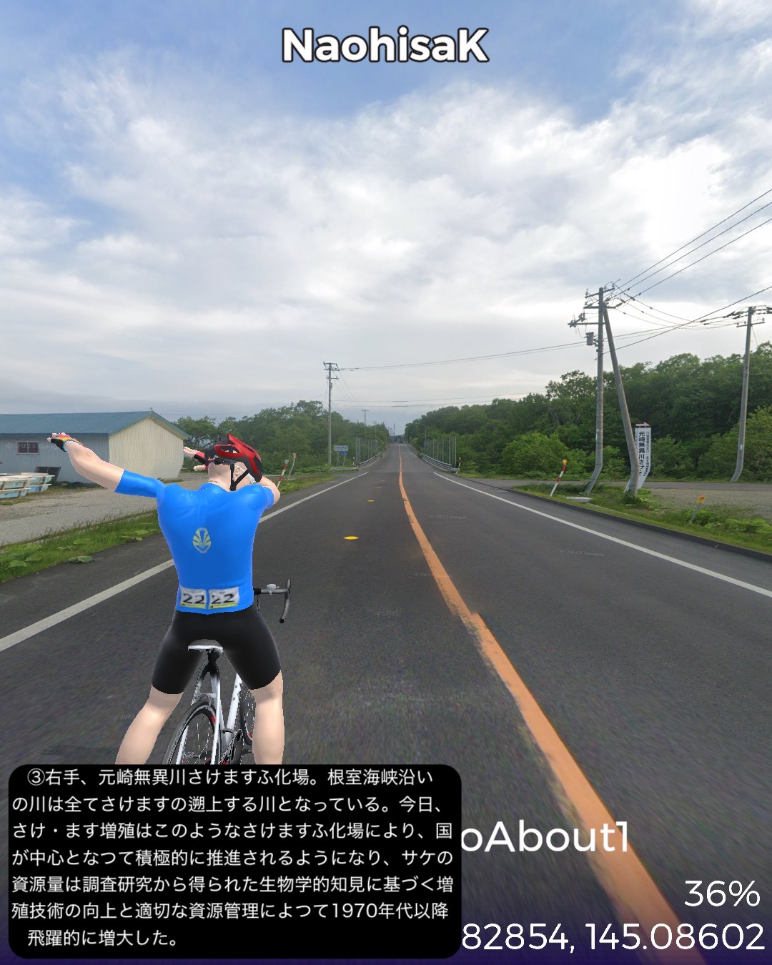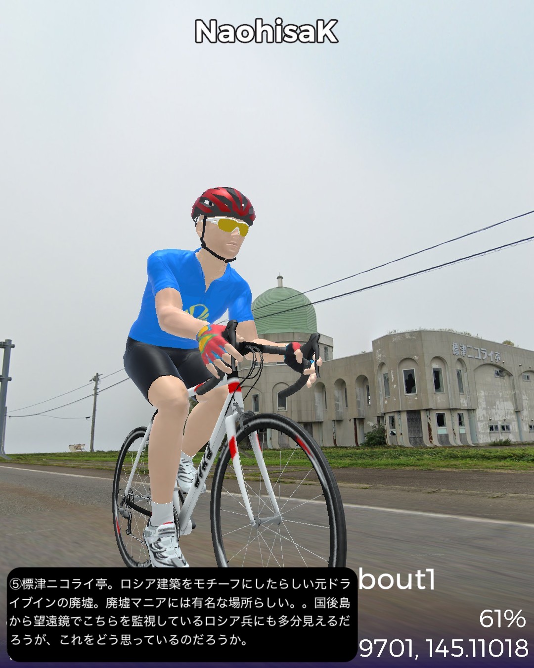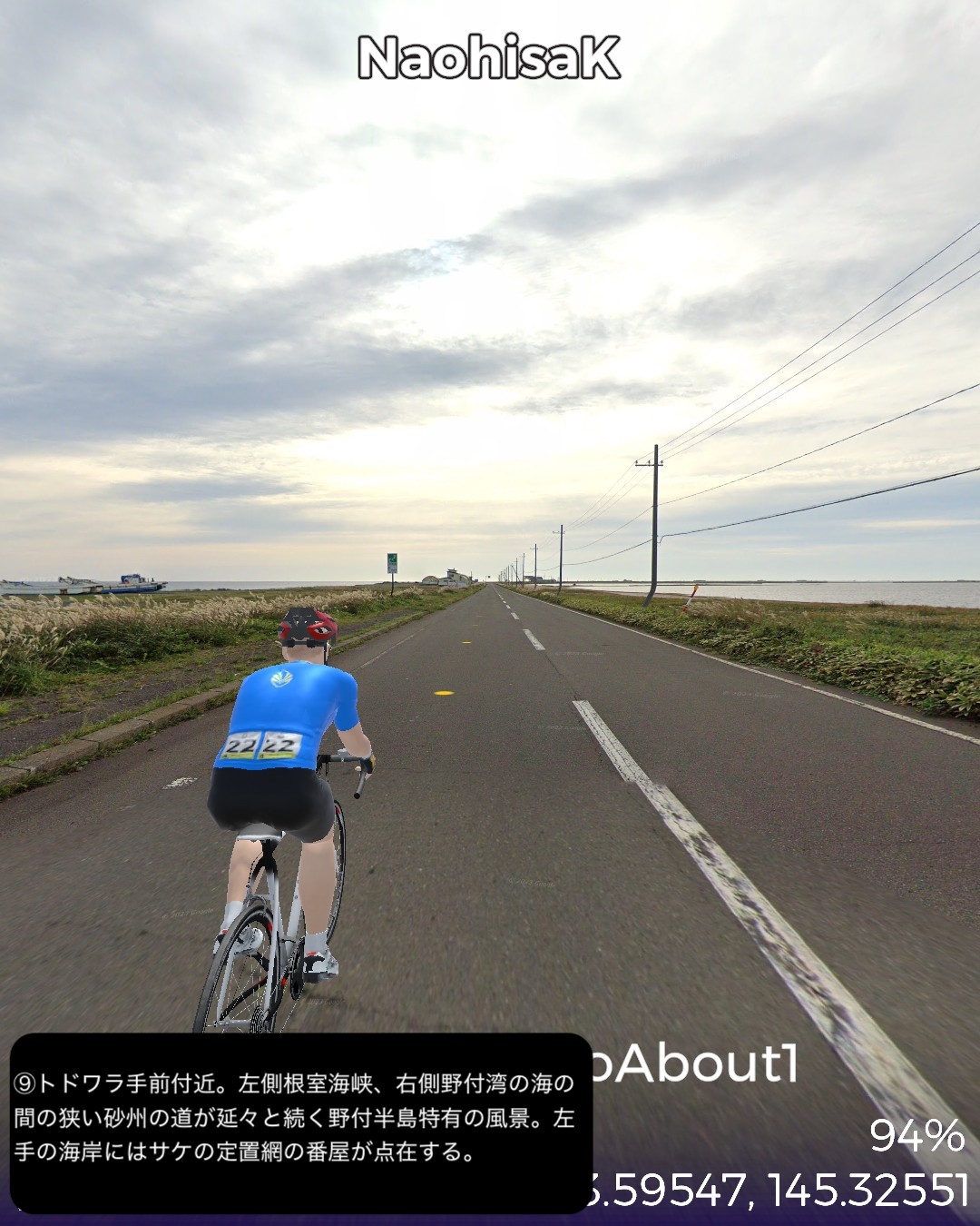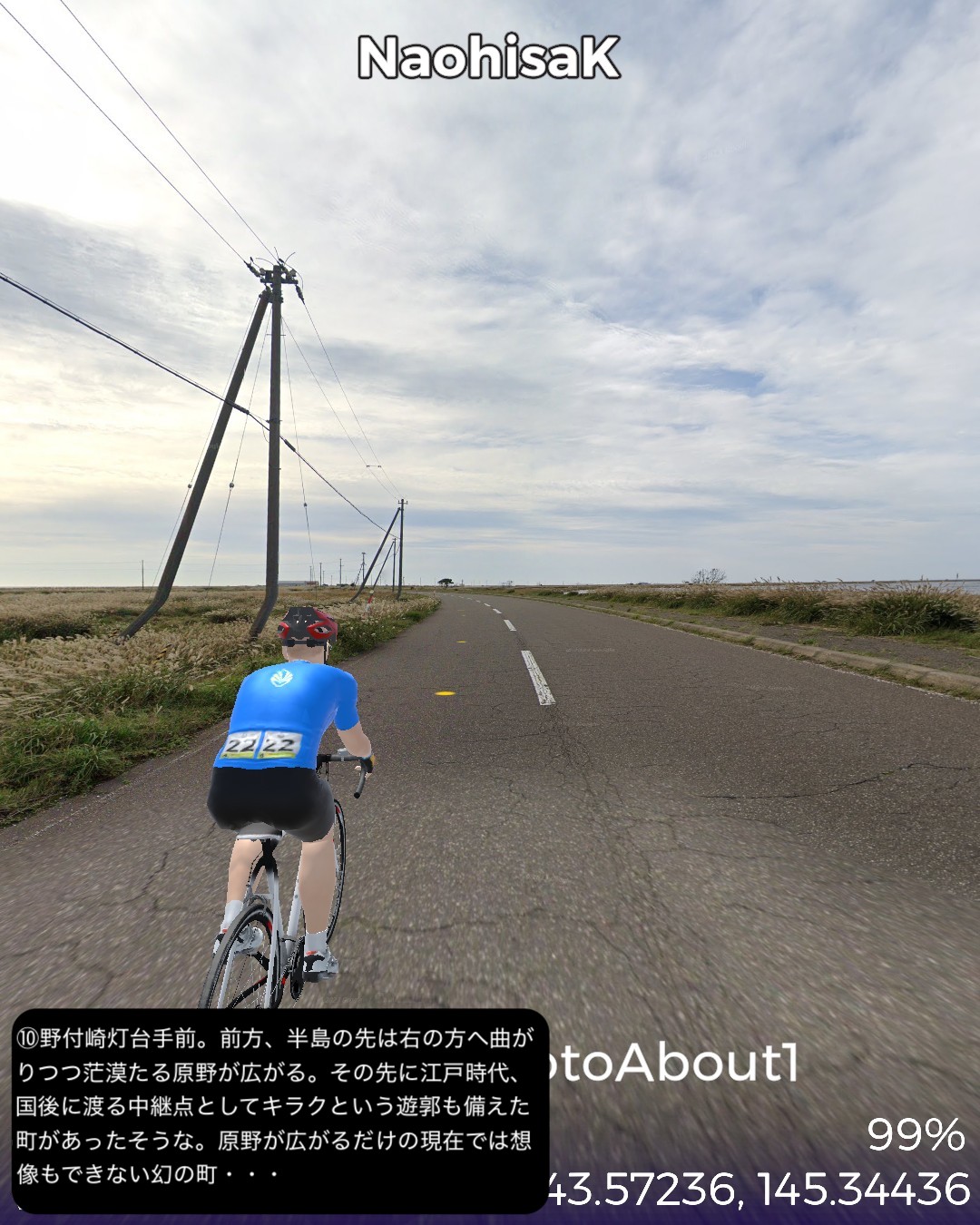 VRサイクリング 知床を抜けていわゆる道東エリアをしばらく2次元的にあちこち回ってみたい。名付けて道東逍遥ルート。「逍遥」とは気ままにあちこちを散歩することとある。散歩ではなくサイクリングであるが「気まま」がキーワードにはなるので当てはめてみる。まずはその1日目。知床の東海岸の中心地羅臼をスタートし、知床半島の東海岸を根本に向けて進む。知床半島を抜けたところで日本有数の鮭の産地標津を通り、桜海老のような野付半島の先端をゴールとする68kmの行程。本日のルートは根室海峡に面した海岸沿いであるが、この海岸ルートを特徴付ける1つは北方領土国後島が常に左手に眺められること。特に標津から野付半島においては国後島と10数kmしか離れておらず手に取るように近くに見える。野付半島は両側を海に挟まれた細長く茫漠たる原野が広がるのみで、サケの定置網の番屋が点在する以外は何もない寂寥感がつのる場所であるが、なんと江戸時代には国後島に渡る中継地として賑わい、遊郭まで備えた幻の町キラクがあったらしい。全く想像すらできないが歴史の浪漫だなあ。もう1つ今回のルートを特徴付けるのはサケの聖地であること。根室海峡に注ぐすべての川はサケ・マスが遡上する川で、毎年秋に繰り返される自然のサイクルでこの地域の人々の営みを1万年に渡って支え続けてきたという。江戸時代には将軍への献上品となるほど高品質さを誇り、そして今もなおサケがこの地域の基幹産業を担っている。標津の町の近くを流れるポー川もそうしたサケが遡上する川の一つだが、その流域には無数の古代住居跡があり遡上するサケで生計を立てていたことが窺える。湿原地帯を狭い水路で無数に蛇行するポー川には名前も含め心惹かれるものがある。この川でカヌーをしてみたいものだ。