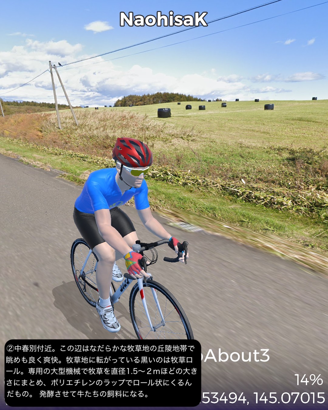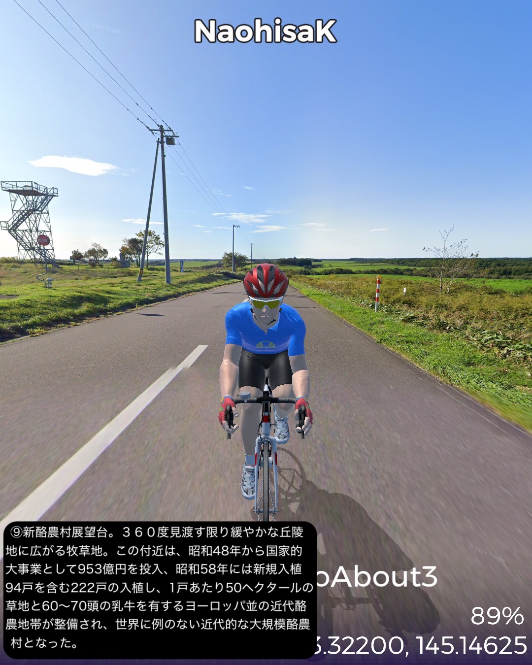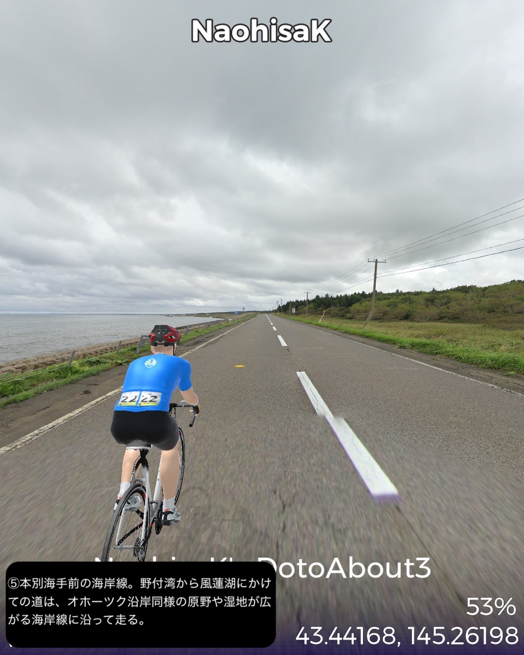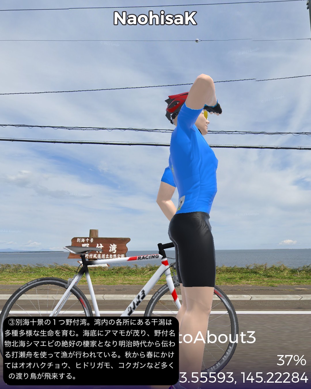 VRサイクリング、道東逍遥ルート 3日目。前回に続き根釧台地をさらにウロウロ。今回は海岸も含め別海町を巡る。中標津市街をスタートし、まず南へ向かい、中標津町の南に隣接する別海町に入ったところでなだらかな丘陵地を東へ進み、野付湾にぶつかったところで海岸線を南へ。尾岱沼、本別海と進み風蓮湖の西端をかすめて再度内陸へ入り、別海町南部の広大な牧草地帯を回って別海市街へ至る85kmの行程。日本で三番目に広いという広大な別海町の東半分を北>東>南とぐるっと回って真ん中へ至るコースとなる。別海町は人口の7倍の乳牛を有し、生乳の生産量日本一というまさに酪農王国。前回の中標津町も十分酪農王国と言って良かったが、規模的にはその上を行っているわけだ。風景としては中標津町同様格子状防風林のグリッドにはハマっているようだが、地形的には丘陵地帯で中標津より凹凸が多く、その分より開放的な眺め。国家プロジェクトの新酪農村事業の中心地域だけあって、牧場の規模が中標津より大きい気がする。尾岱沼から風蓮湖に至る海沿いの原野と湿地帯、自然なままの川の風景も道北、オホーツク海沿岸で馴染み深いが、これぞ北海道という気がしてきた。次回は日本最東端へ到達予定。