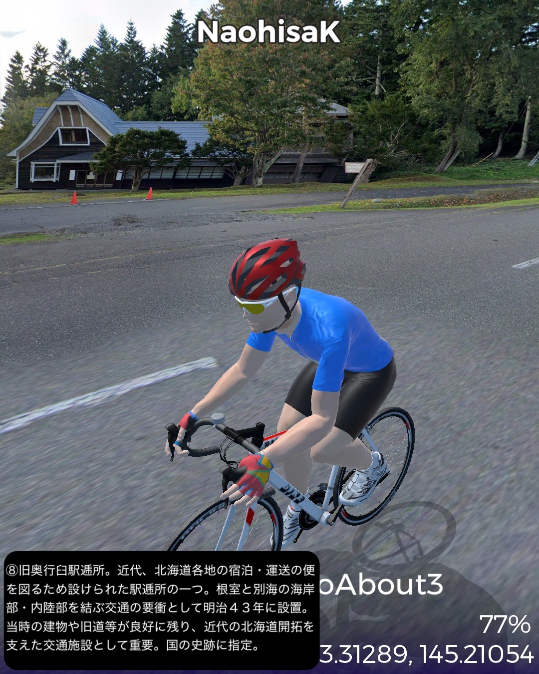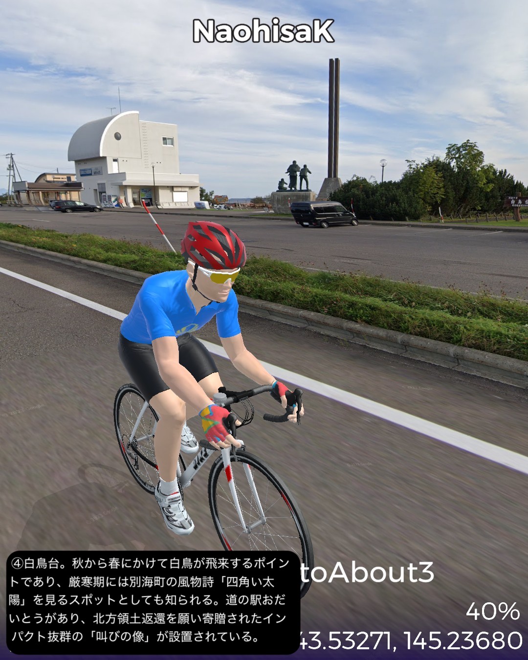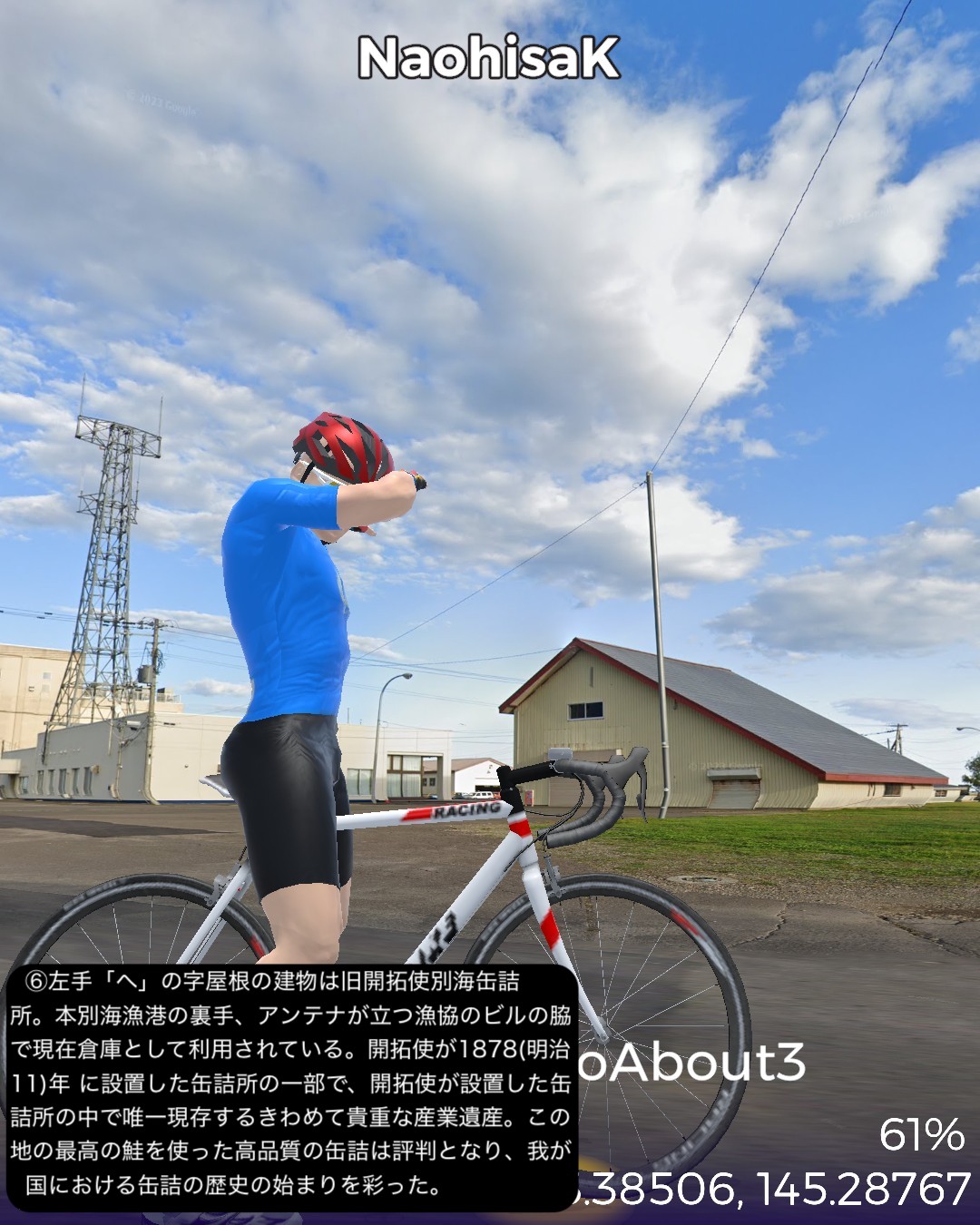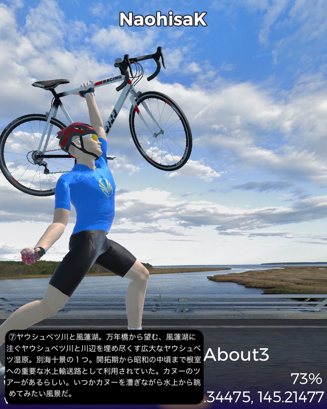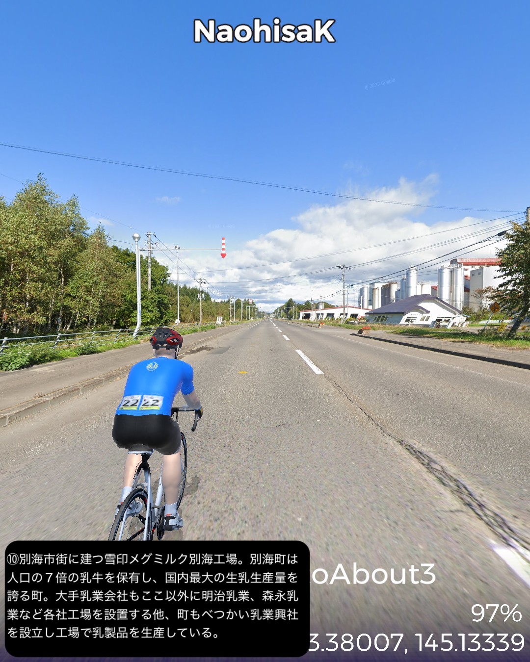 VRサイクリング、道東逍遥ルート 3日目。前回に続き根釧台地をさらにウロウロ。今回は海岸も含め別海町を巡る。中標津市街をスタートし、まず南へ向かい、中標津町の南に隣接する別海町に入ったところでなだらかな丘陵地を東へ進み、野付湾にぶつかったところで海岸線を南へ。尾岱沼、本別海と進み風蓮湖の西端をかすめて再度内陸へ入り、別海町南部の広大な牧草地帯を回って別海市街へ至る85kmの行程。日本で三番目に広いという広大な別海町の東半分を北>東>南とぐるっと回って真ん中へ至るコースとなる。別海町は人口の7倍の乳牛を有し、生乳の生産量日本一というまさに酪農王国。前回の中標津町も十分酪農王国と言って良かったが、規模的にはその上を行っているわけだ。風景としては中標津町同様格子状防風林のグリッドにはハマっているようだが、地形的には丘陵地帯で中標津より凹凸が多く、その分より開放的な眺め。国家プロジェクトの新酪農村事業の中心地域だけあって、牧場の規模が中標津より大きい気がする。尾岱沼から風蓮湖に至る海沿いの原野と湿地帯、自然なままの川の風景も道北、オホーツク海沿岸で馴染み深いが、これぞ北海道という気がしてきた。次回は日本最東端へ到達予定。