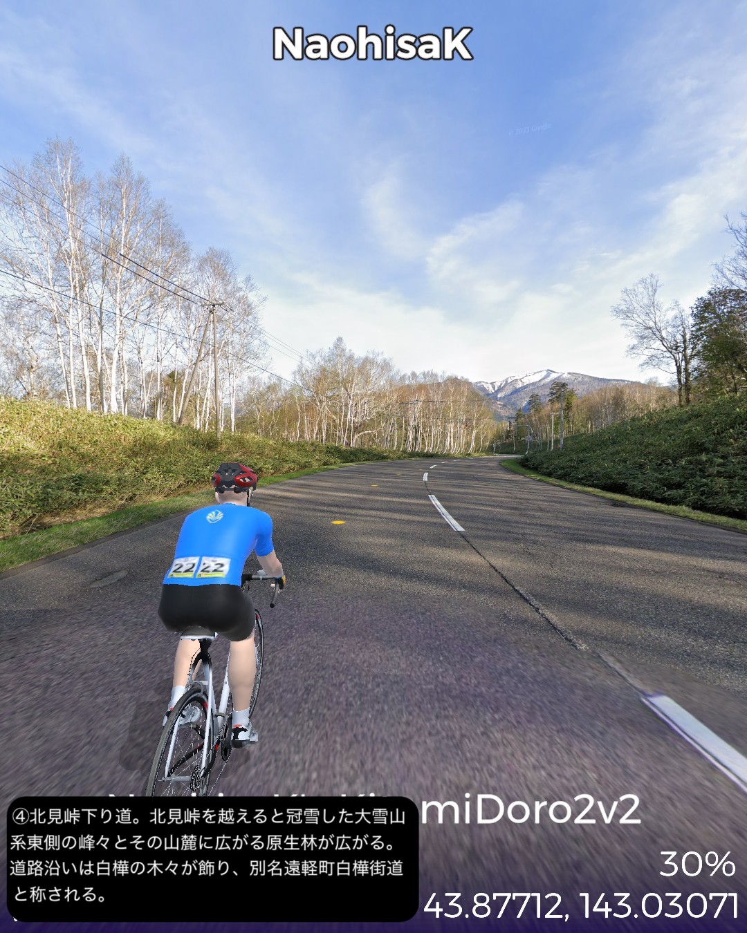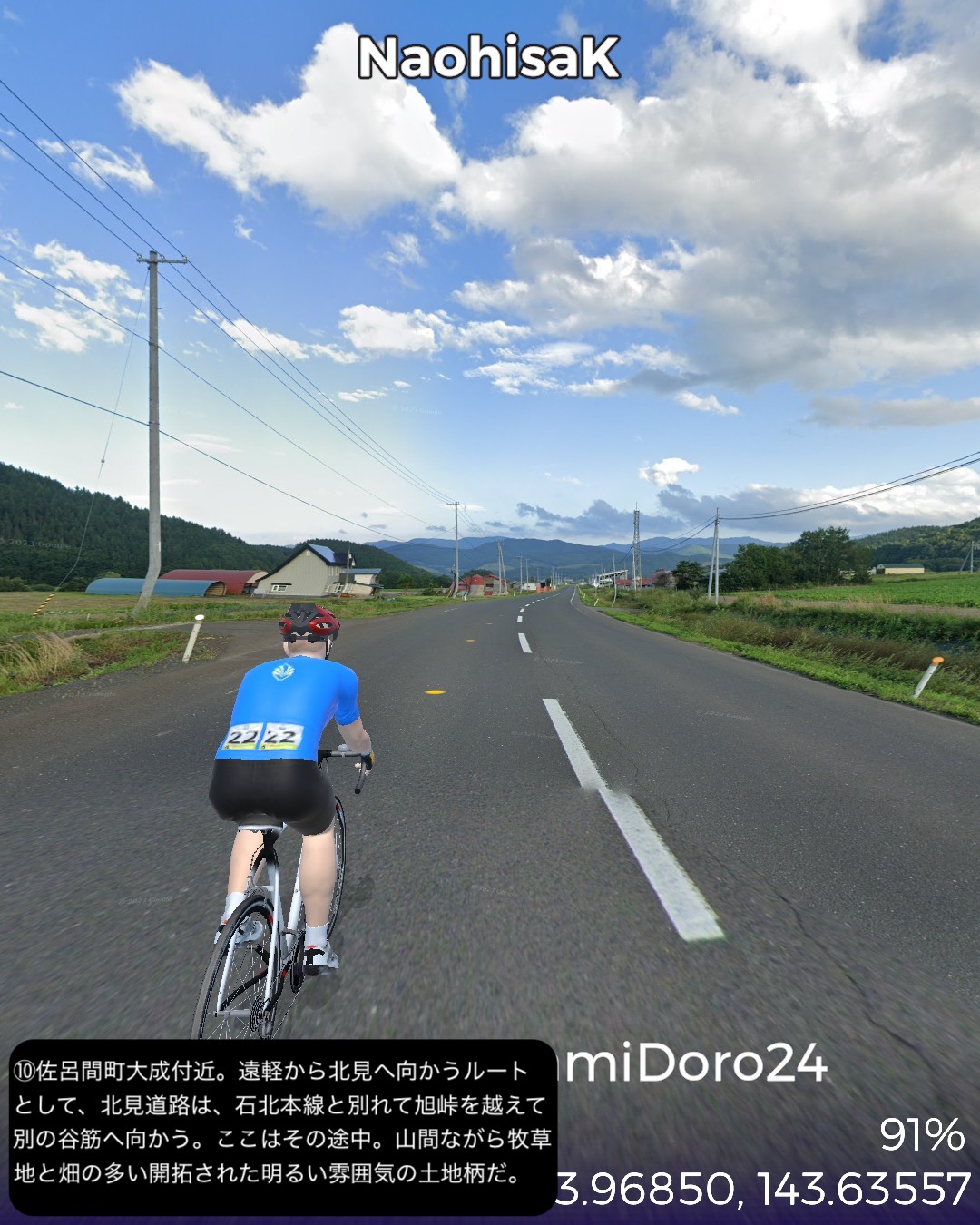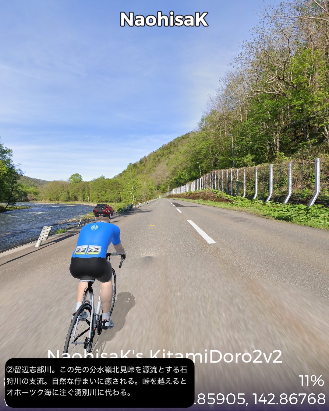 VRサイクリング 北見道路2日目。道央から再度道東へ抜ける峠越えの地味な山間ルート。前回ルートの途中、上川から東北東へ進む。じわじわ登り道を辿ってようやく北見峠を越えて今度はじわじわ下ってゆき白滝、丸瀬布という山間の町を通り過ぎてオホーツク沿岸の湧別平野の奥に位置する地域の中心の町、遠軽で南東へ進路を変えてちょっとした峠を越えた先の佐呂間町栄をゴールとする109kmの久々の長丁場。今回はほとんど名所旧跡も大したビューポイントもない地味目なコース。前半上川から北見峠を登って下った白滝までの30kmほどの道のりはほとんど人家もない原生林、原野に囲まれた谷筋。北見峠を越えるまでは石狩川支流の留辺志部川を辿り、峠を越えた後はオホーツク海に注ぐ湧別川と共に下る。峠の頂上には北見道路開削時に犠牲になった囚人達の慰霊碑があったが、原始の土地柄だけに難工事だったのは想像に難くない。JR石北本線も同じルートで、面白いのは上川・遠軽間に12の駅があったのが、1975年から2006年にかけて間引きに間引かれて今は3駅だけ残った。その結果上川・白滝間は在来線では日本一の駅間距離となった。昔は白滝シリーズとしてマニアには有名な秘境駅の聖地だったが、今や廃駅となった幻の駅の聖地と化したようだ。そもそも過疎な谷筋に12も駅は多すぎたという気がする。遠軽は湧別川に生田原川が合流して湧別平野に流れ込む扇状地に位置する町で、北見道路もJR石北本線も昔開通した交通ルートは湧別川の谷筋から生田原川の谷筋にルートを変える場所となっている。地図で見ると旭川から北見、網走に抜けるルートとしては遠軽を経由するのはどう見てもかなりの遠回りであるが、それでも犠牲者続出の工事でようやく開通したというのは、道央と道東の間に横たわる山地がいかに急峻で複雑な地形であるか推して知るべしということだろう。次回は北見経由で再度網走に到達予定。