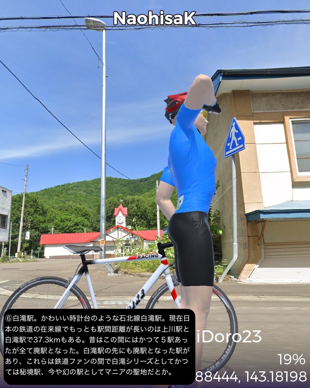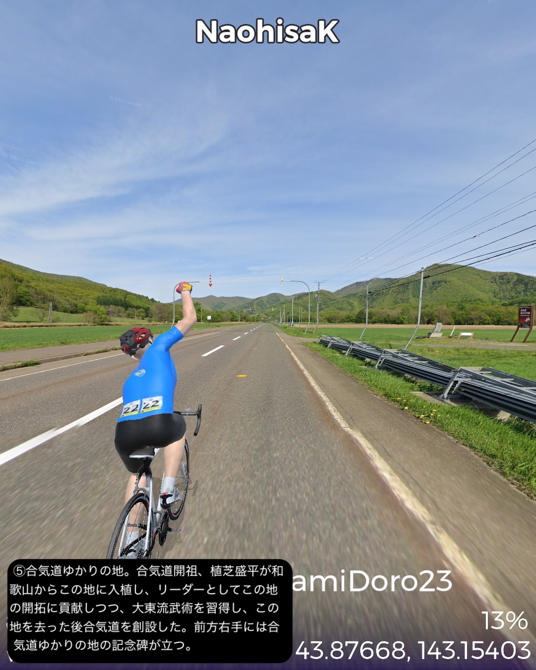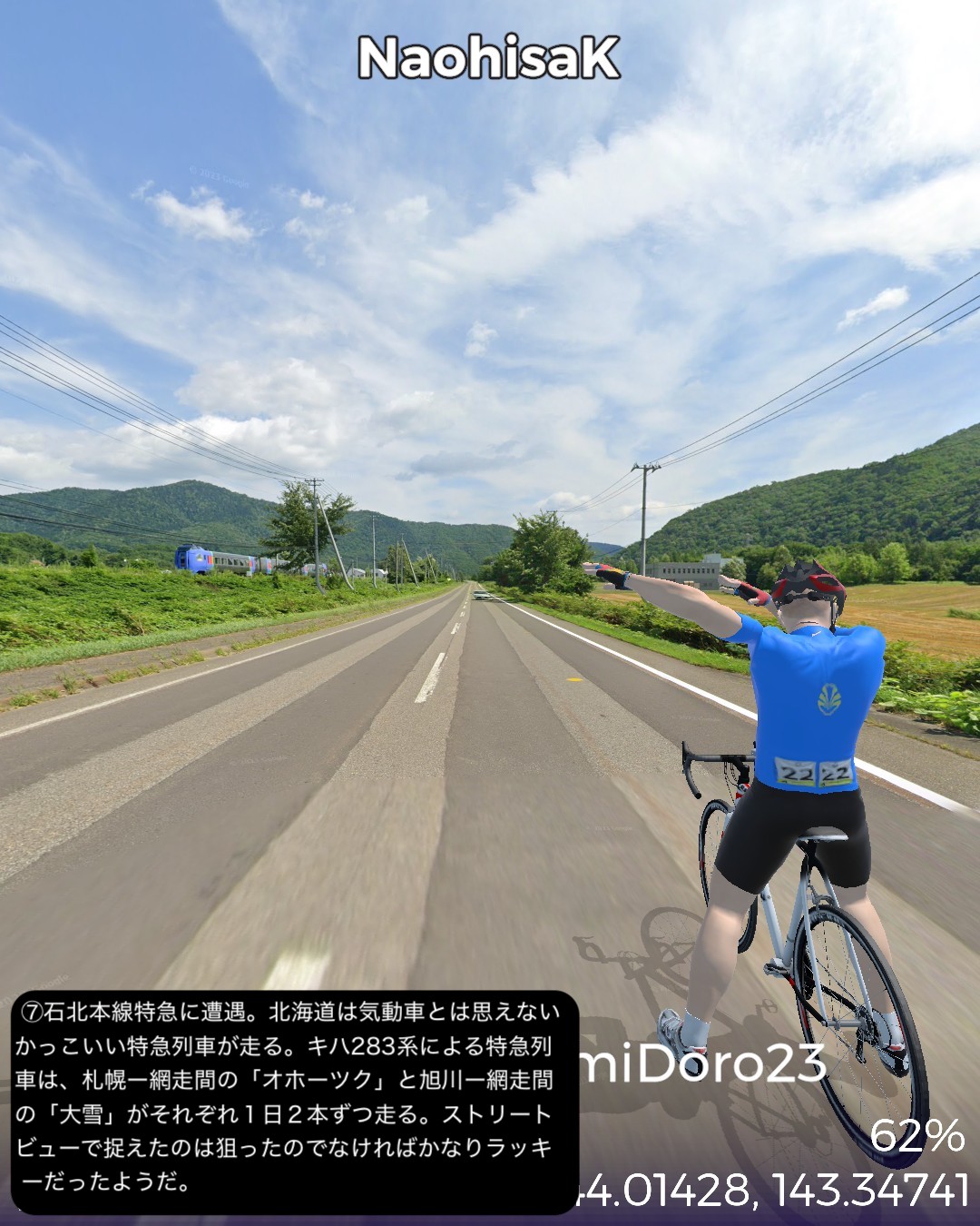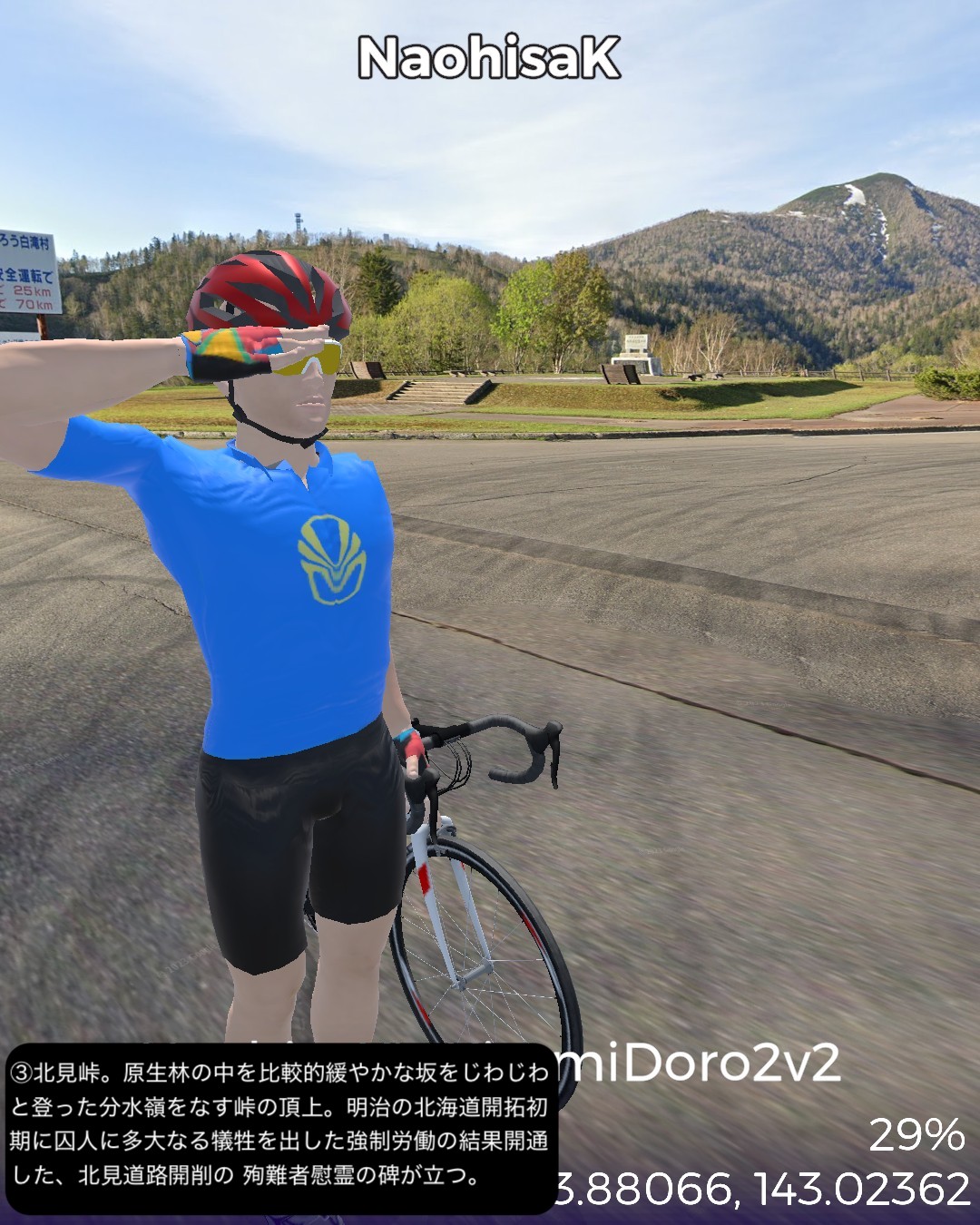 VRサイクリング 北見道路2日目。道央から再度道東へ抜ける峠越えの地味な山間ルート。前回ルートの途中、上川から東北東へ進む。じわじわ登り道を辿ってようやく北見峠を越えて今度はじわじわ下ってゆき白滝、丸瀬布という山間の町を通り過ぎてオホーツク沿岸の湧別平野の奥に位置する地域の中心の町、遠軽で南東へ進路を変えてちょっとした峠を越えた先の佐呂間町栄をゴールとする109kmの久々の長丁場。今回はほとんど名所旧跡も大したビューポイントもない地味目なコース。前半上川から北見峠を登って下った白滝までの30kmほどの道のりはほとんど人家もない原生林、原野に囲まれた谷筋。北見峠を越えるまでは石狩川支流の留辺志部川を辿り、峠を越えた後はオホーツク海に注ぐ湧別川と共に下る。峠の頂上には北見道路開削時に犠牲になった囚人達の慰霊碑があったが、原始の土地柄だけに難工事だったのは想像に難くない。JR石北本線も同じルートで、面白いのは上川・遠軽間に12の駅があったのが、1975年から2006年にかけて間引きに間引かれて今は3駅だけ残った。その結果上川・白滝間は在来線では日本一の駅間距離となった。昔は白滝シリーズとしてマニアには有名な秘境駅の聖地だったが、今や廃駅となった幻の駅の聖地と化したようだ。そもそも過疎な谷筋に12も駅は多すぎたという気がする。遠軽は湧別川に生田原川が合流して湧別平野に流れ込む扇状地に位置する町で、北見道路もJR石北本線も昔開通した交通ルートは湧別川の谷筋から生田原川の谷筋にルートを変える場所となっている。地図で見ると旭川から北見、網走に抜けるルートとしては遠軽を経由するのはどう見てもかなりの遠回りであるが、それでも犠牲者続出の工事でようやく開通したというのは、道央と道東の間に横たわる山地がいかに急峻で複雑な地形であるか推して知るべしということだろう。次回は北見経由で再度網走に到達予定。