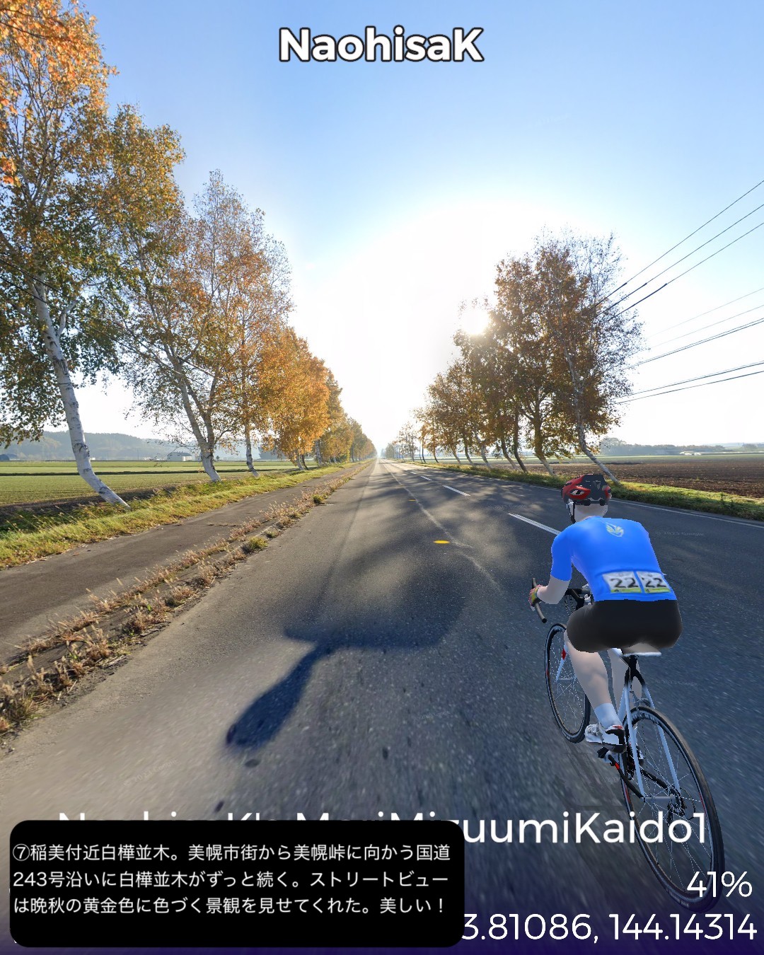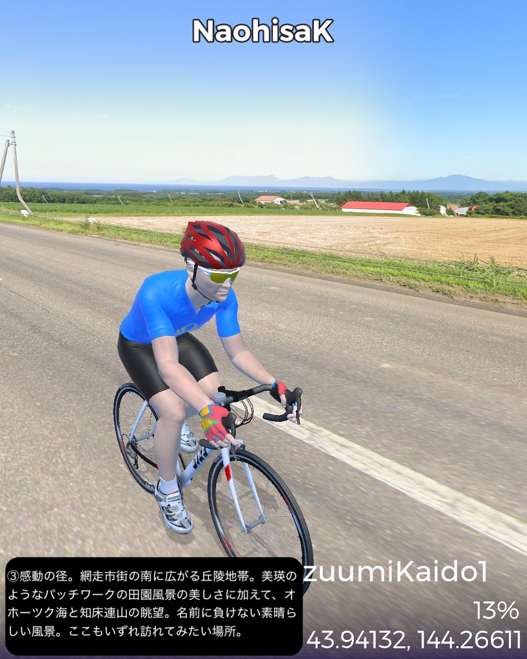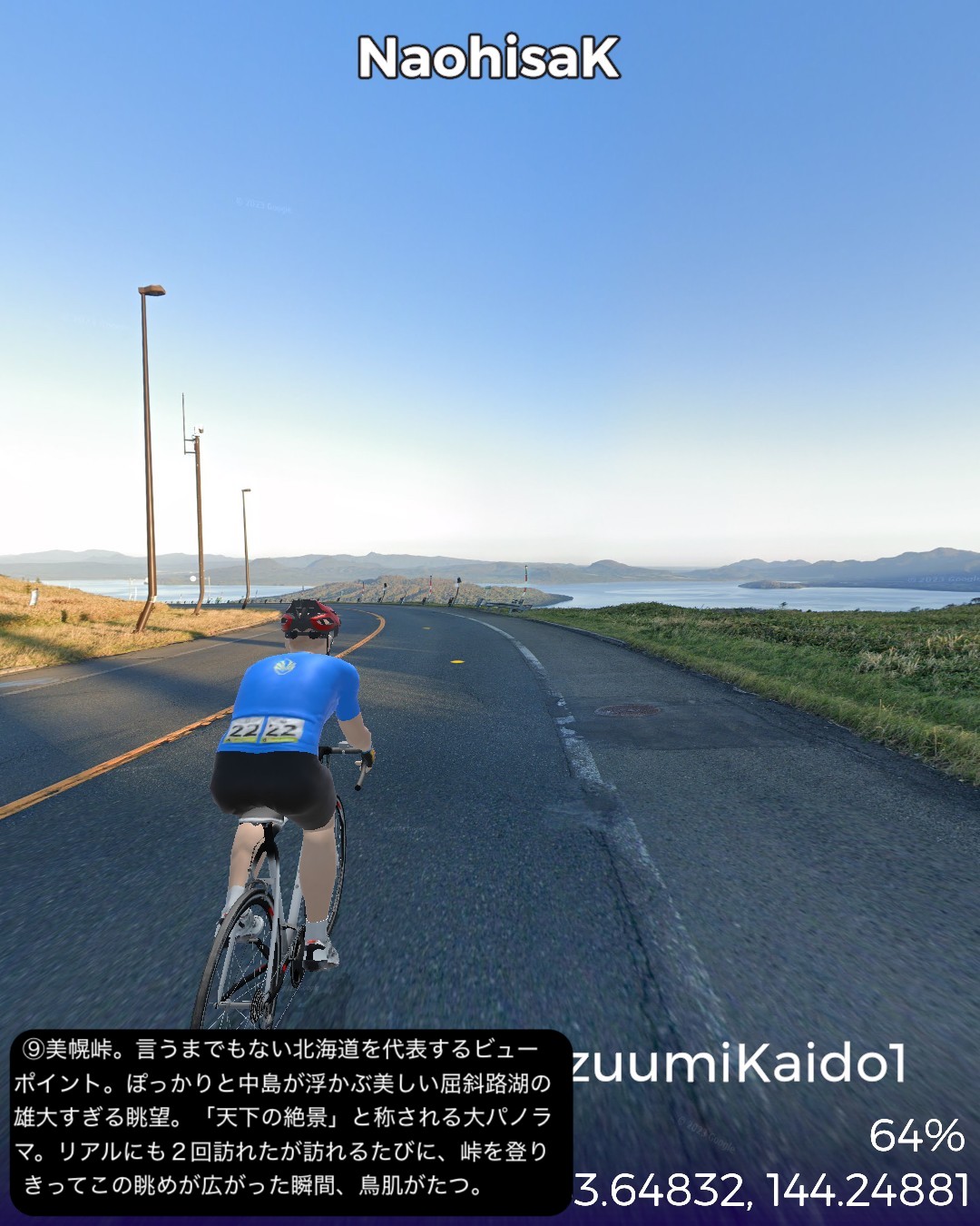 VRサイクリング 今回から勝手に名付けたルート、「森と湖パークウェイ」を進む。パークウェイは国立公園、国定公園を辿るルートを意図する。その1日目は網走国定公園から阿寒摩周国立公園に入るまで。最終的にどこへ向かうかは想像付くと思われるが今のところ明示しないこととする。前回の終点近く網走市街の国道239号から国道39号が分岐する大曲の交差点をスタートし、網走市街裏手の山、網走国定公園の一部天都山に登る。網走監獄、オホーツク流氷館、北方民族博物館、フラワーガーデンはなてんと等様々な施設を通り抜け、天都山に続く尾根伝いに網走湖東岸を南下、途中で眺めが素晴らしい「感動の径」に寄り道しつつ、メルヘンの丘を通り女満別へ。網走湖女満別湖畔に寄ってから国道39号をさらに南下して美幌に至る。ここから白樺並木が続く国道243号を進んで天下の絶景、美幌峠を経て屈斜路湖の南西湖畔に下ったところまでの80kmの行程。前回までの北見国道が昔からの産業用道路で、地味な楽屋通路のようなルートだったのに比べると、今回からは国定公園、国立公園を縦断する北海道観光のメインルートで観るべき場所に溢れた表舞台のルートに切り替わる。実際、天都山、感動の径、メルヘンの丘、網走湖畔、国道243号の白樺並木、そして何といっても天下の絶景との呼び声高い美幌峠と今回は素晴らしいビューに溢れていた。美幌峠はリアルに2回訪れた場所だが、何度来ても峠の頂上まで来て突然開ける屈斜路湖の雄大な眺望に息を呑む。行ったことのない場所としては、感動の径と命名された、網走市街の南に広がる丘陵地帯が美瑛のようなパッチワークの美しい田園風景にプラスしてオホーツク海と知床連山の眺望が開ける素晴らしい場所であった。ここはいずれ是非訪れてみたい場所だ。次回は観光ルートの定石に従って阿寒摩周国立公園を横断する。