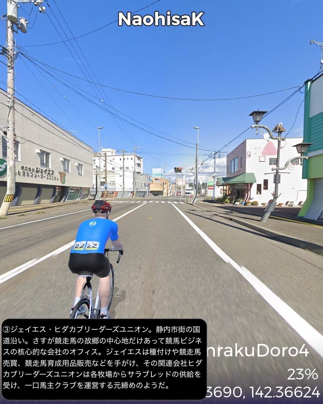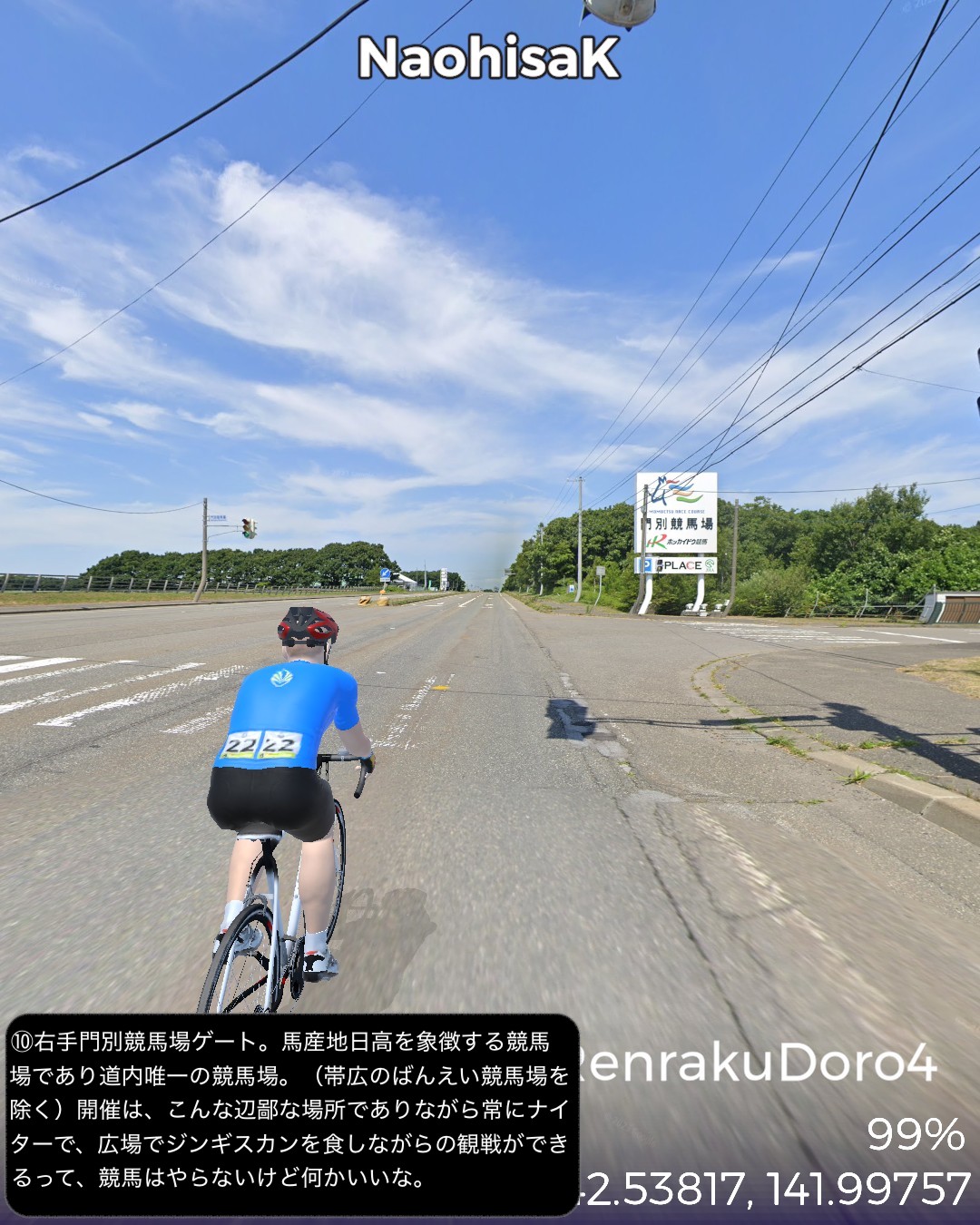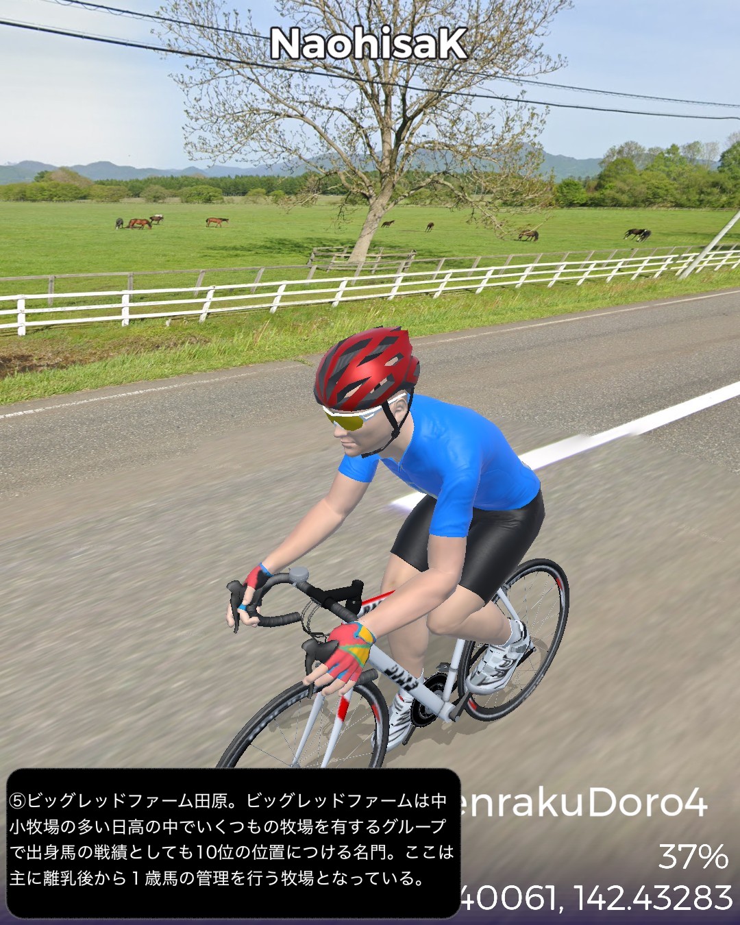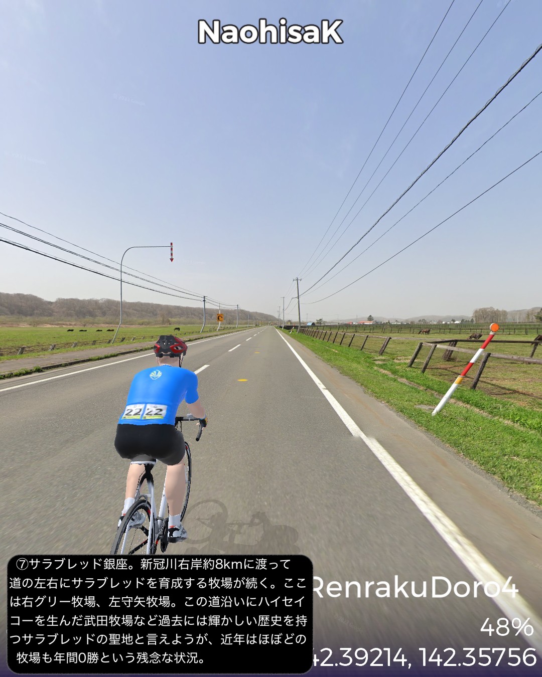 VRサイクリング 日勝連絡道路 4日目。最終日。サラブレッドの故郷を往く、の巻。日高昆布の故郷三石をスタートし、さらに海沿いにひたすら国道235号を北西へひた走る。新日高町の中心静内からはちょっと内陸へ入りシーズンを外した桜の名所二十間道路からサラブレッド銀座へと回り海沿いに戻ると新冠町の市街、そこからさらに海沿いを走り日高町の中心門別を抜けて、町外れにある北海道唯一の競馬場(ばんえい競馬除く)門別競馬場前をゴールとする82kmの行程。日高の地形のパターンは、海岸段丘と町が展開する河口の平地の繰り返し。そのうち静内川と新冠川のもたらす平野に日高のサラブレッド牧場が密集して広がっている。特にサラブレッド銀座と称されるサラブレッド牧場密集ベルト地帯には約8kmに渡って道の両側に木柵で区切られたサラブレッドが草を喰む牧草地が延々と続くのだ。日本でもここだけにしかない風景であろう。この辺からハイセイコーやナリタブライアン等の名馬が生まれたわけであるが、今や日高の地位は凋落しほとんどの勝馬は千歳付近に展開する社台系と称される巨大牧場グループに独占されているようなのだ。サラブレッドと言えば日高だと勝手に思い込んでいたが時代は変わるということかもしれない。
