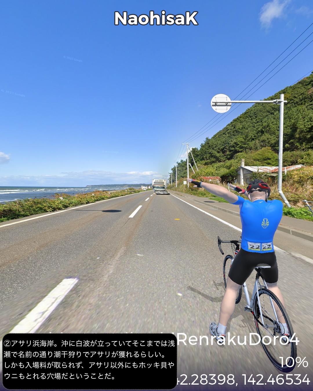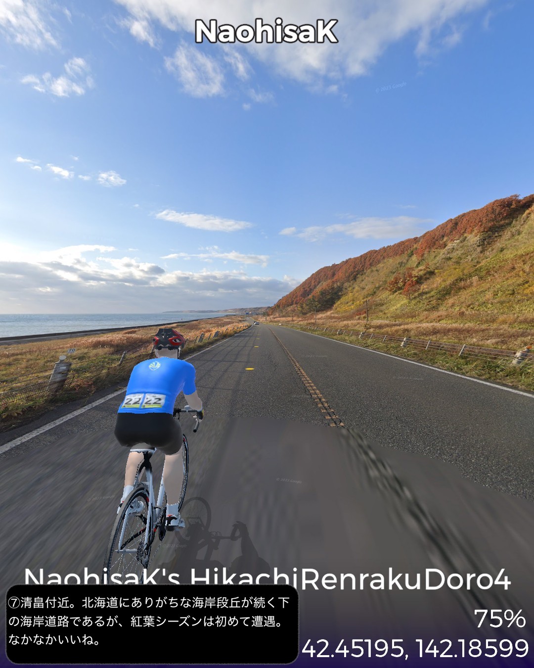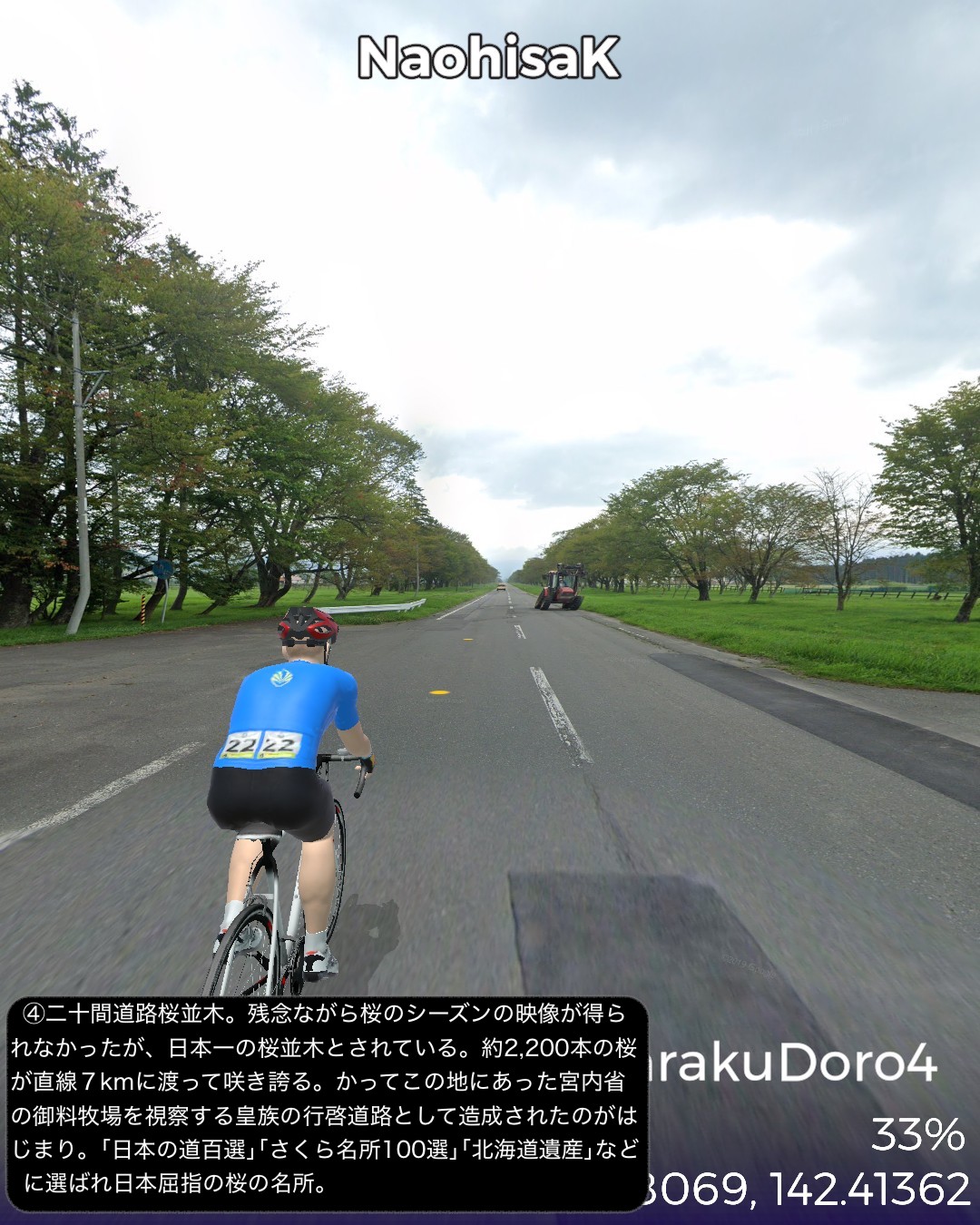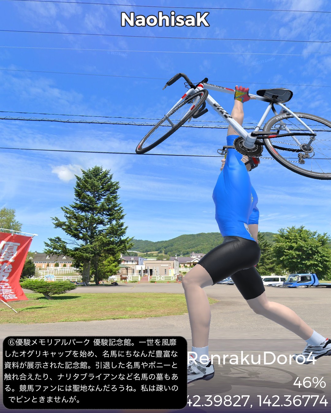 VRサイクリング 日勝連絡道路 4日目。最終日。サラブレッドの故郷を往く、の巻。日高昆布の故郷三石をスタートし、さらに海沿いにひたすら国道235号を北西へひた走る。新日高町の中心静内からはちょっと内陸へ入りシーズンを外した桜の名所二十間道路からサラブレッド銀座へと回り海沿いに戻ると新冠町の市街、そこからさらに海沿いを走り日高町の中心門別を抜けて、町外れにある北海道唯一の競馬場(ばんえい競馬除く)門別競馬場前をゴールとする82kmの行程。日高の地形のパターンは、海岸段丘と町が展開する河口の平地の繰り返し。そのうち静内川と新冠川のもたらす平野に日高のサラブレッド牧場が密集して広がっている。特にサラブレッド銀座と称されるサラブレッド牧場密集ベルト地帯には約8kmに渡って道の両側に木柵で区切られたサラブレッドが草を喰む牧草地が延々と続くのだ。日本でもここだけにしかない風景であろう。この辺からハイセイコーやナリタブライアン等の名馬が生まれたわけであるが、今や日高の地位は凋落しほとんどの勝馬は千歳付近に展開する社台系と称される巨大牧場グループに独占されているようなのだ。サラブレッドと言えば日高だと勝手に思い込んでいたが時代は変わるということかもしれない。