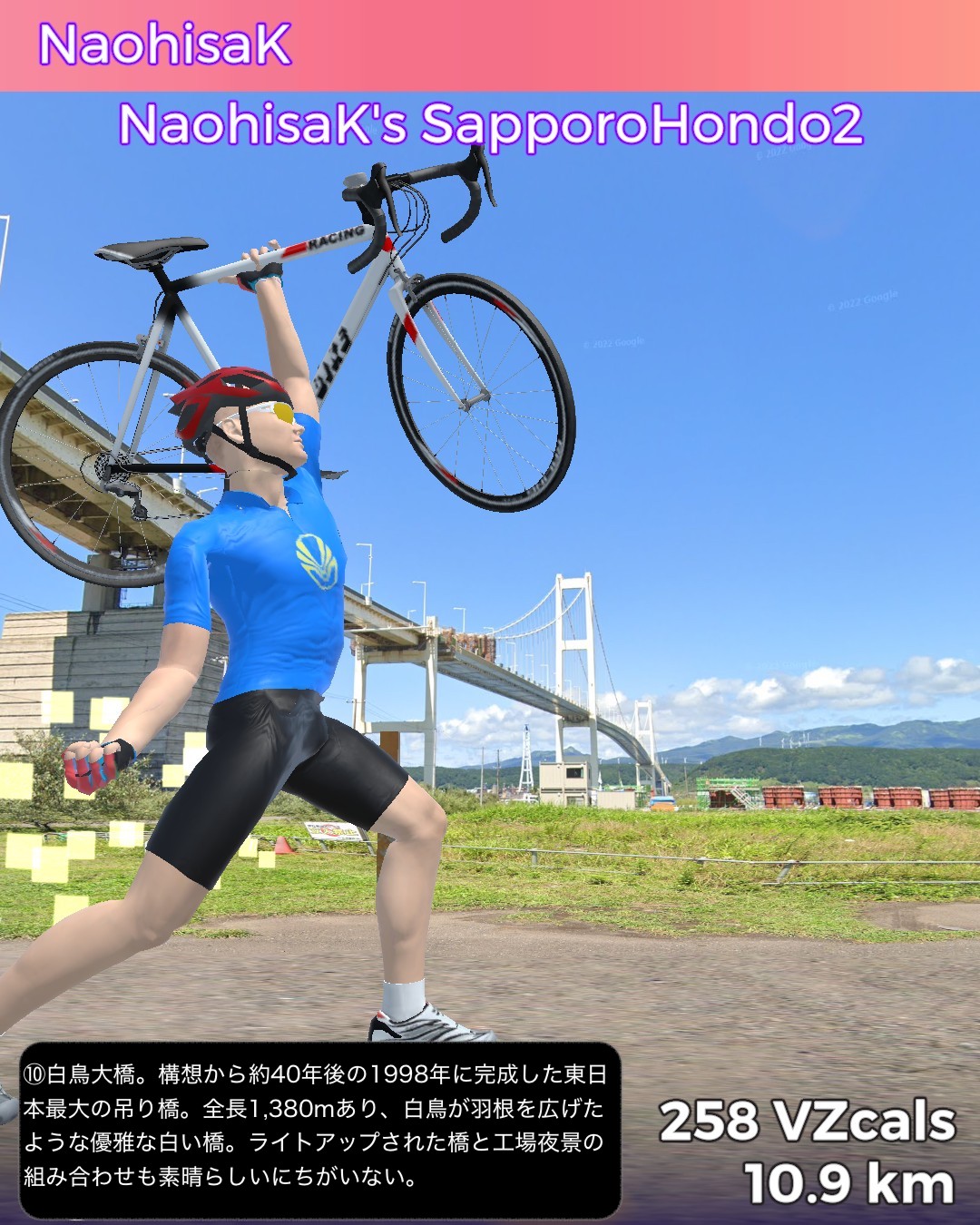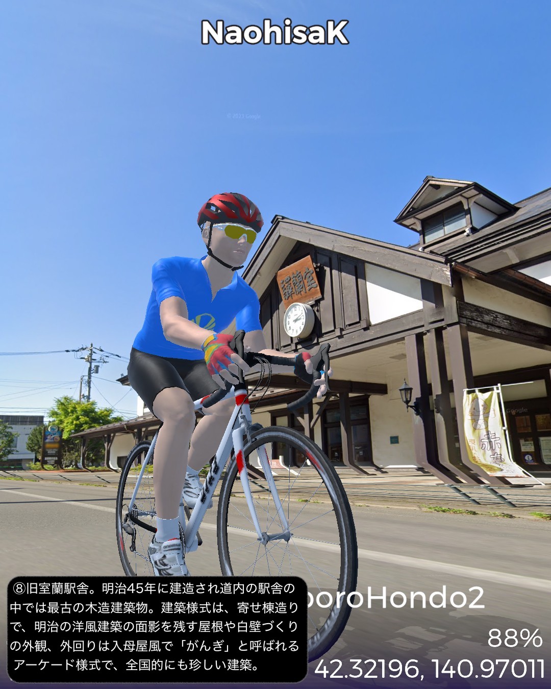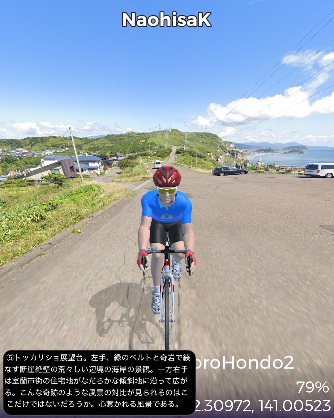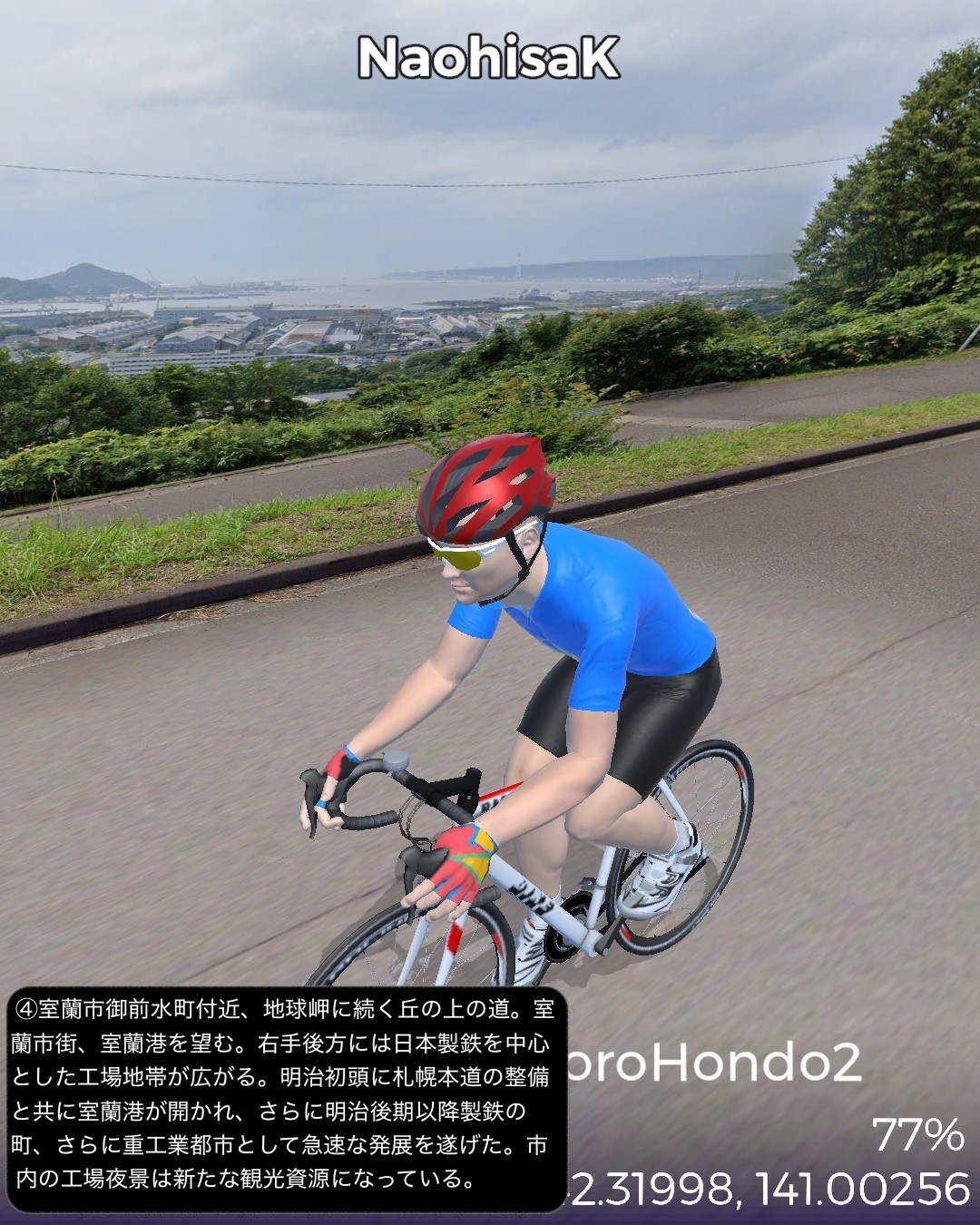 VRサイクリング 札幌本道 2日目。さらに海沿いに室蘭まで進み、室蘭市街を取り巻く絵鞆半島をグルッと巡るの巻。アイヌコタンの町白老を出発し海沿いに進み登別付近で内陸に入り山奥の登別温泉、さらに山奥のカルルス温泉を巡ってまた海辺に戻る。登別市の中心幌別の市街を通り抜けしばらく進むと室蘭。室蘭ではまず絵鞆半島南東の地球岬を目指し、その後室蘭市街を巡り、さらに絵鞆半島の先端絵鞆岬から白鳥大橋のたもとへ到達してゴールとする75kmの行程。今回は登別温泉と室蘭に尽きる。登別温泉は地図で見ると海岸近くのように思えたが、かなり深い山奥に分け入ったところに北海道を代表する大規模な温泉郷が突如出現した。大きな温泉旅館・ホテルが建ち並ぶ奥に地獄谷と呼ばれる火山の火口跡があり、火山ガスの噴出口から噴煙が上がり、多くの種類の温泉を湧出していて各旅館・ホテルに供給されている。泉質は9種類もある世界的にも珍しい「温泉のデパート」と称されるバリエーションと湧出量1日1万トンという豊富な湯量が特徴のようだ。大きな旅館・ホテルが建ち並ぶが山奥の渓谷沿いの温泉郷の様式美もあって魅力的な温泉地であった。倶多楽湖のほうへも行ってみたかったがルートが設定できず残念であった。札幌と函館を結ぶ札幌本道は室蘭で一旦陸路は終端し、室蘭港から内浦湾を横断して森まで海路で進んでいた。室蘭は記憶にないが幼少期多分まだ赤ん坊の頃に家族が半年か1年ほど住んでいた土地らしい。その後訪れたことはなく今回VRで初めて足を踏み入れた。室蘭というと製鉄所で有名な工業都市というイメージがあり行ってみたい場所として挙がることはなかったが、VRでも訪れてみて印象は大きく変わった。室蘭市街を取り巻く山々がそのまま海食崖を形成して険しくダイナミックな絶景の海岸美を見せ、大きな都市の周辺環境としては異例なほど辺境のムードを醸している。一方で室蘭市街は製鉄の町として発展した経緯からヘビーデューティな工業地帯が展開し工場夜景が観光資源になっていつつ、市街地は時代に取り残されたかのようなレトロで落ち着いた街並みがある。何と多層的ですてきな町なんだろうと強く心惹かれるものがあった。ひょっとしたら幼少期の原体験的な潜在記憶を刺激するものもあったかもしれない。いつか訪れたい町がまた1つ増えた。