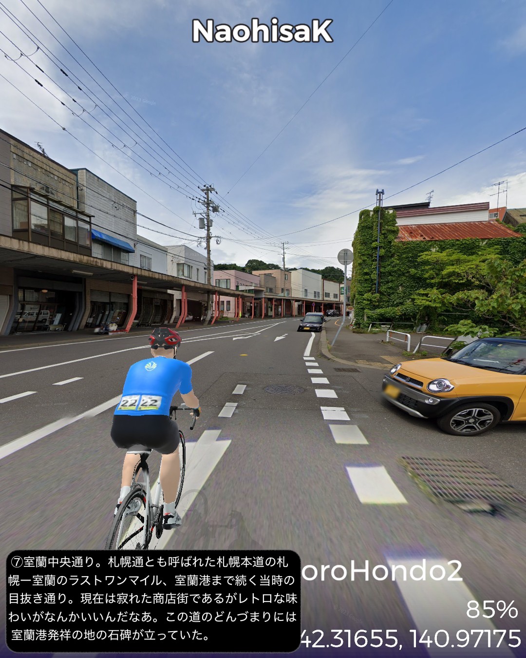 VRサイクリング 札幌本道 2日目。さらに海沿いに室蘭まで進み、室蘭市街を取り巻く絵鞆半島をグルッと巡るの巻。アイヌコタンの町白老を出発し海沿いに進み登別付近で内陸に入り山奥の登別温泉、さらに山奥のカルルス温泉を巡ってまた海辺に戻る。登別市の中心幌別の市街を通り抜けしばらく進むと室蘭。室蘭ではまず絵鞆半島南東の地球岬を目指し、その後室蘭市街を巡り、さらに絵鞆半島の先端絵鞆岬から白鳥大橋のたもとへ到達してゴールとする75kmの行程。今回は登別温泉と室蘭に尽きる。登別温泉は地図で見ると海岸近くのように思えたが、かなり深い山奥に分け入ったところに北海道を代表する大規模な温泉郷が突如出現した。大きな温泉旅館・ホテルが建ち並ぶ奥に地獄谷と呼ばれる火山の火口跡があり、火山ガスの噴出口から噴煙が上がり、多くの種類の温泉を湧出していて各旅館・ホテルに供給されている。泉質は9種類もある世界的にも珍しい「温泉のデパート」と称されるバリエーションと湧出量1日1万トンという豊富な湯量が特徴のようだ。大きな旅館・ホテルが建ち並ぶが山奥の渓谷沿いの温泉郷の様式美もあって魅力的な温泉地であった。倶多楽湖のほうへも行ってみたかったがルートが設定できず残念であった。札幌と函館を結ぶ札幌本道は室蘭で一旦陸路は終端し、室蘭港から内浦湾を横断して森まで海路で進んでいた。室蘭は記憶にないが幼少期多分まだ赤ん坊の頃に家族が半年か1年ほど住んでいた土地らしい。その後訪れたことはなく今回VRで初めて足を踏み入れた。室蘭というと製鉄所で有名な工業都市というイメージがあり行ってみたい場所として挙がることはなかったが、VRでも訪れてみて印象は大きく変わった。室蘭市街を取り巻く山々がそのまま海食崖を形成して険しくダイナミックな絶景の海岸美を見せ、大きな都市の周辺環境としては異例なほど辺境のムードを醸している。一方で室蘭市街は製鉄の町として発展した経緯からヘビーデューティな工業地帯が展開し工場夜景が観光資源になっていつつ、市街地は時代に取り残されたかのようなレトロで落ち着いた街並みがある。何と多層的ですてきな町なんだろうと強く心惹かれるものがあった。ひょっとしたら幼少期の原体験的な潜在記憶を刺激するものもあったかもしれない。いつか訪れたい町がまた1つ増えた。