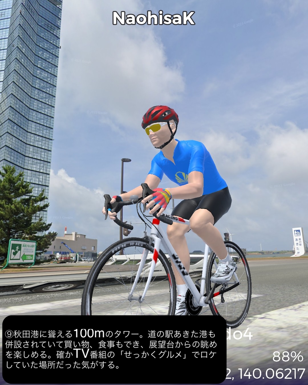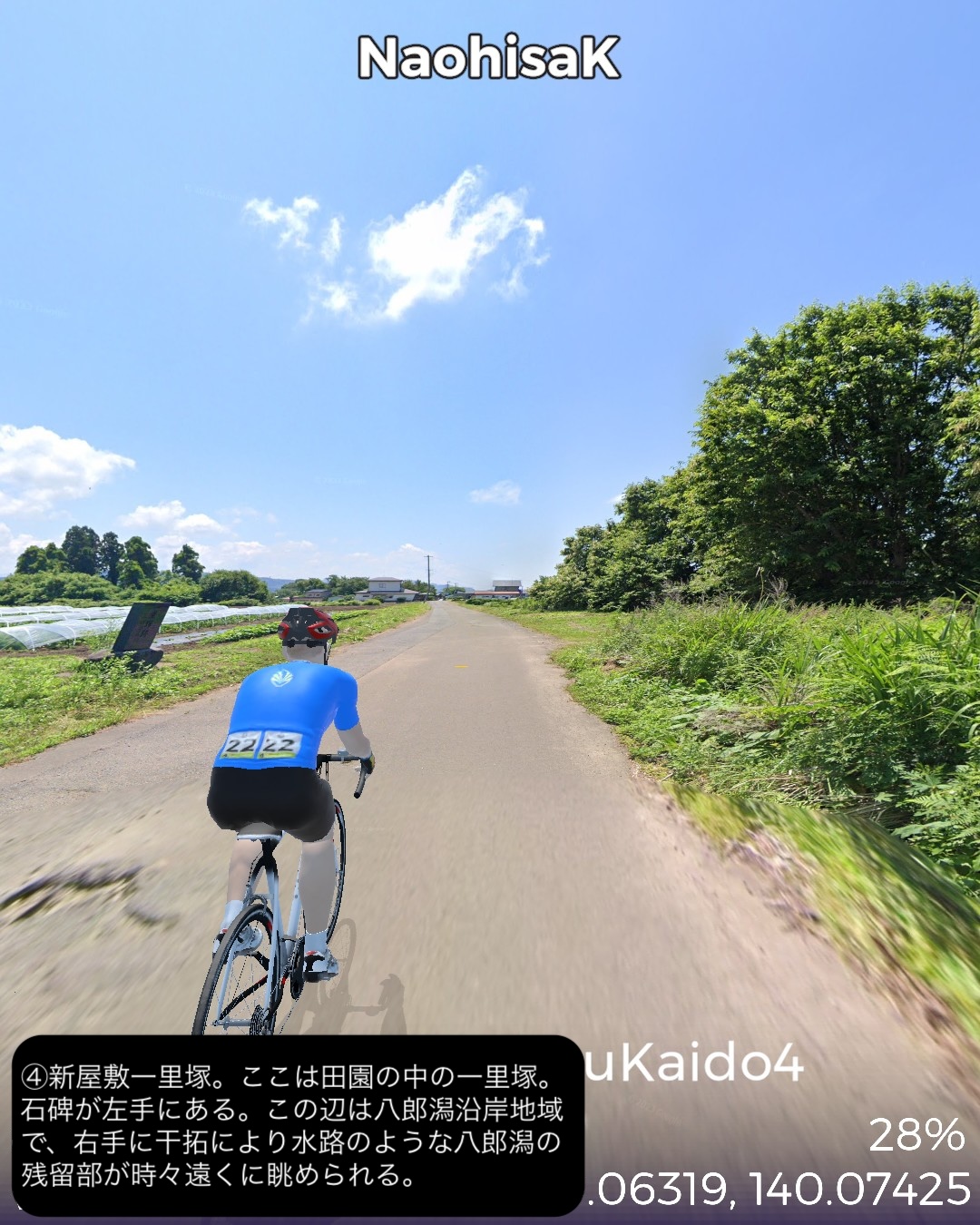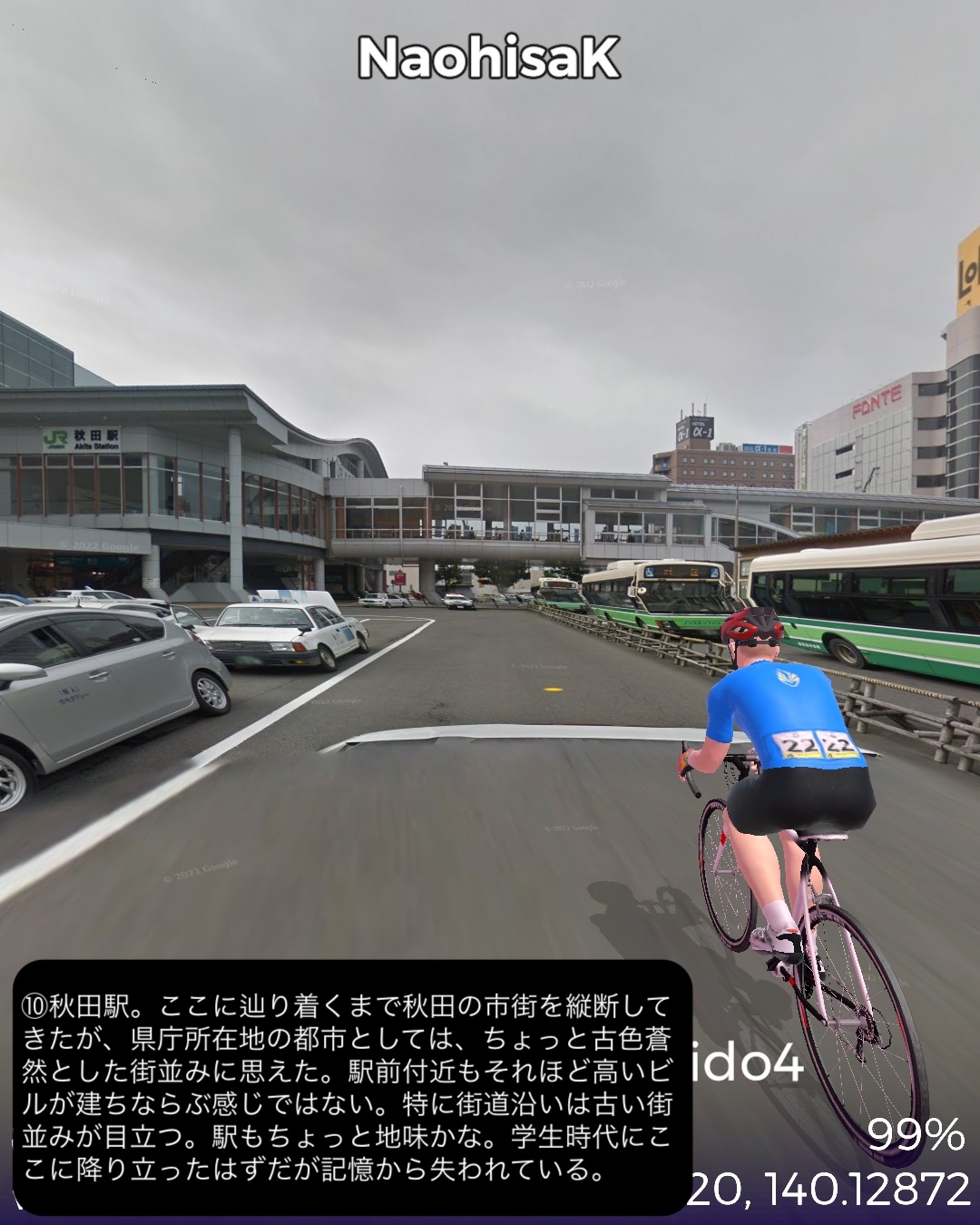 VRサイクリング 羽州街道4日目。八郎潟沿岸を抜けて秋田へ到着の巻。前回ゴールの東能代駅の手前からスタートし南へ向かう。ちょっと山間に入った城下町檜山宿を経て豊岡宿、森岡宿と進んだところで八郎潟東岸に入り鹿渡宿、一日市宿、大川宿、下虻川宿、大久保宿を次々と通り過ぎて秋田港に位置する土崎湊宿を経て県庁所在地の秋田市街を進んで秋田駅をゴールとする65kmの行程。今回も国道7号と同様の道筋ながら交差しつつ巧妙に並行する旧道ルートがメイン。通り過ぎた宿場の数は多いが、特に古い街並みが保存された宿場らしい街並みではなく、かつ豊岡宿から先はほぼ街道沿いに家並が途切れることはなく、もはやどこが宿場だったのか判然としない状況で進んでいった。逆に言うと、北の果てとも言えるロケーションではあるが、昔から繁栄が続いてきた街道筋とも言える。名所・史跡・絶景など特筆すべきロケーションに乏しかったが、旧街道というのは、あのLong & Winding Roadな風情だけで気分がいいものだ。ところでルートのかなりの部分は八郎潟の沿岸なのだが、干拓が終了した現在ではせいぜい細い水路が残っている程度で、その水路ですら眺められる場所はなく大きな湖の存在の気配は皆無と言って良かった。秋田は街道筋を伝ってきた限りでは、県庁所在地としては異例なほど古めかしく、ちょっとレトロな中ぐらいの都市という印象を受けた。学生時代に一度秋田駅を降りたって街を歩いたはずなのだがビジュアルの記憶は全くなく、今回VRで訪れて記憶を刺激することもなかった。