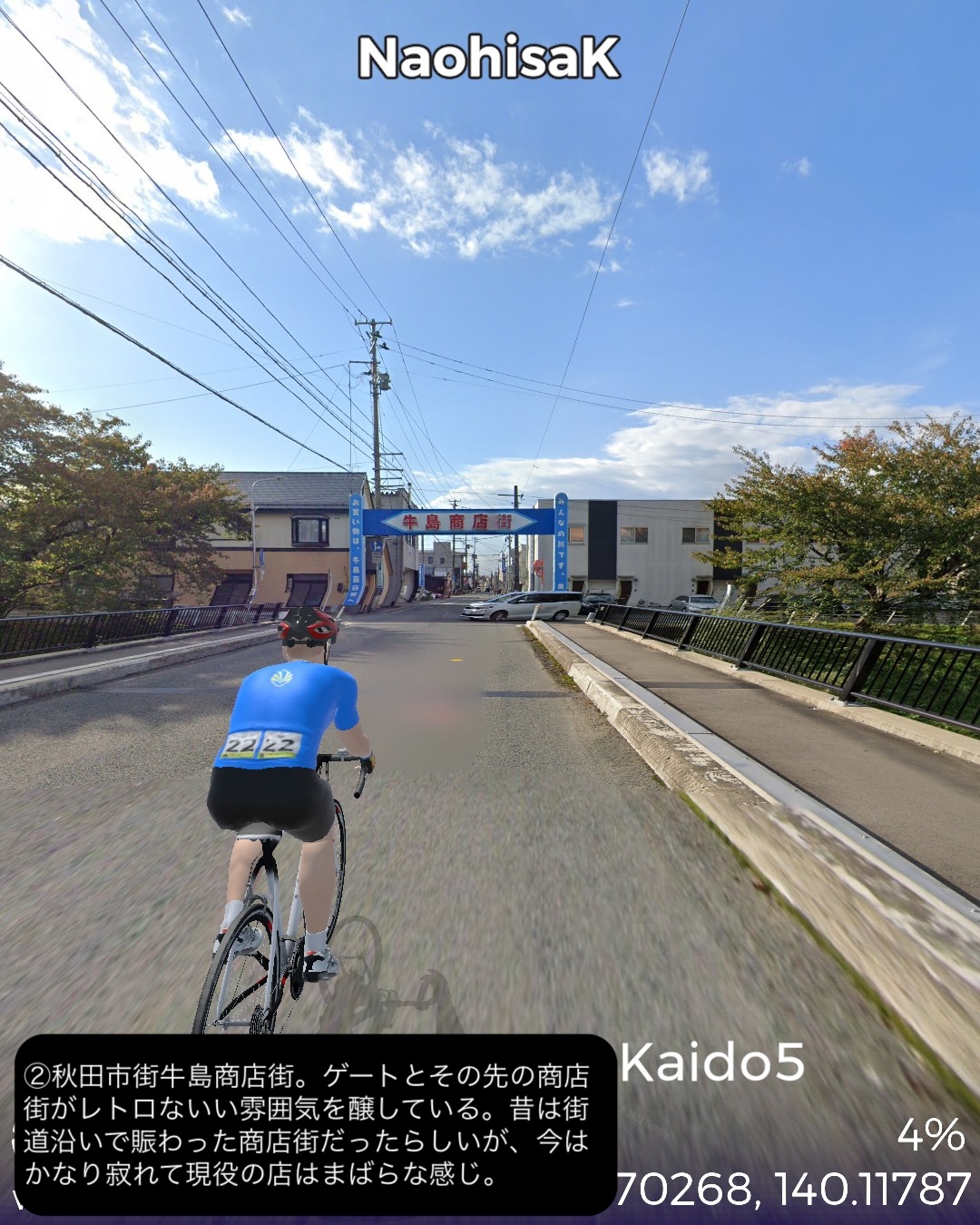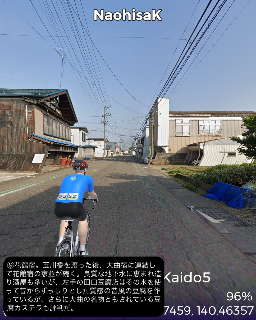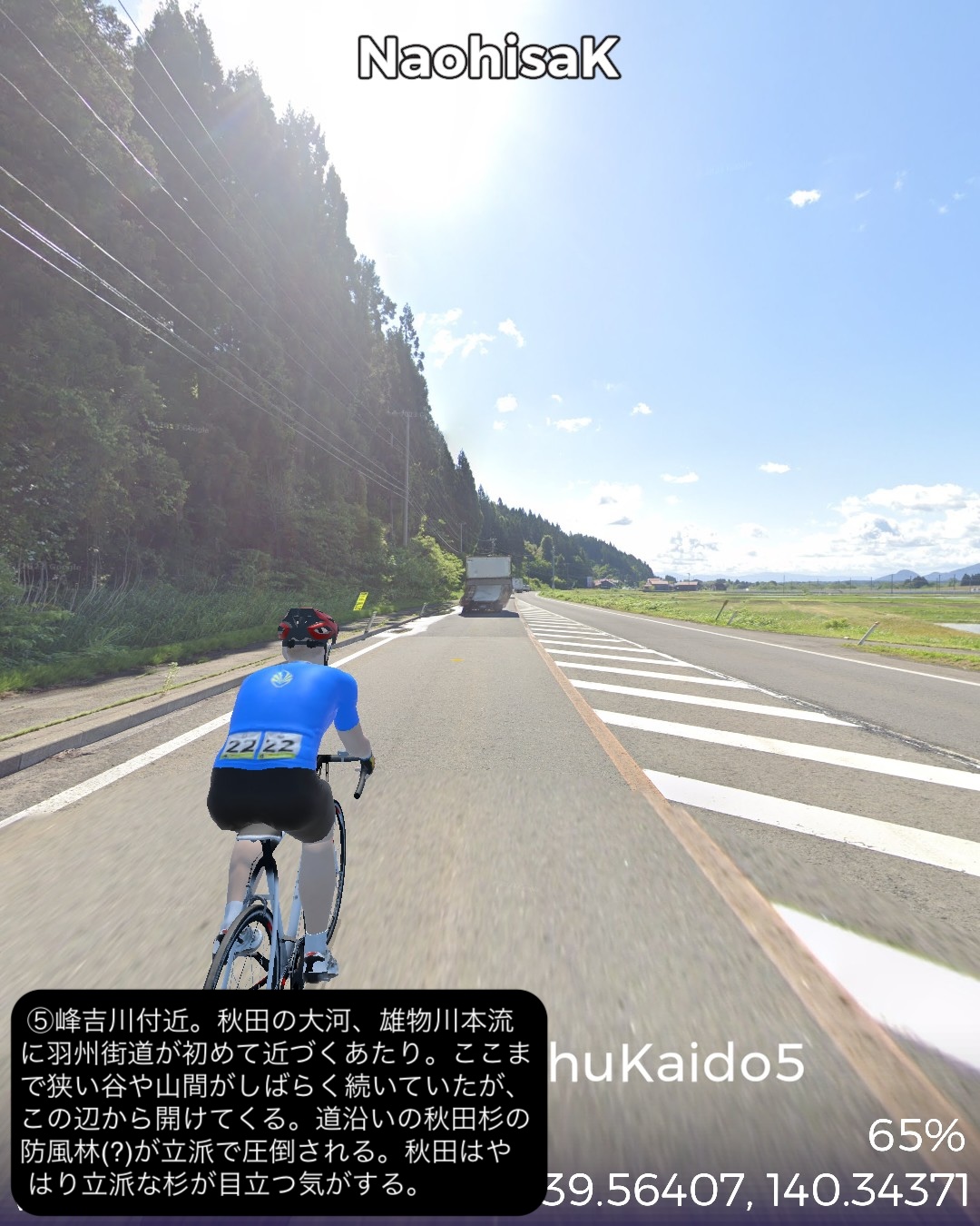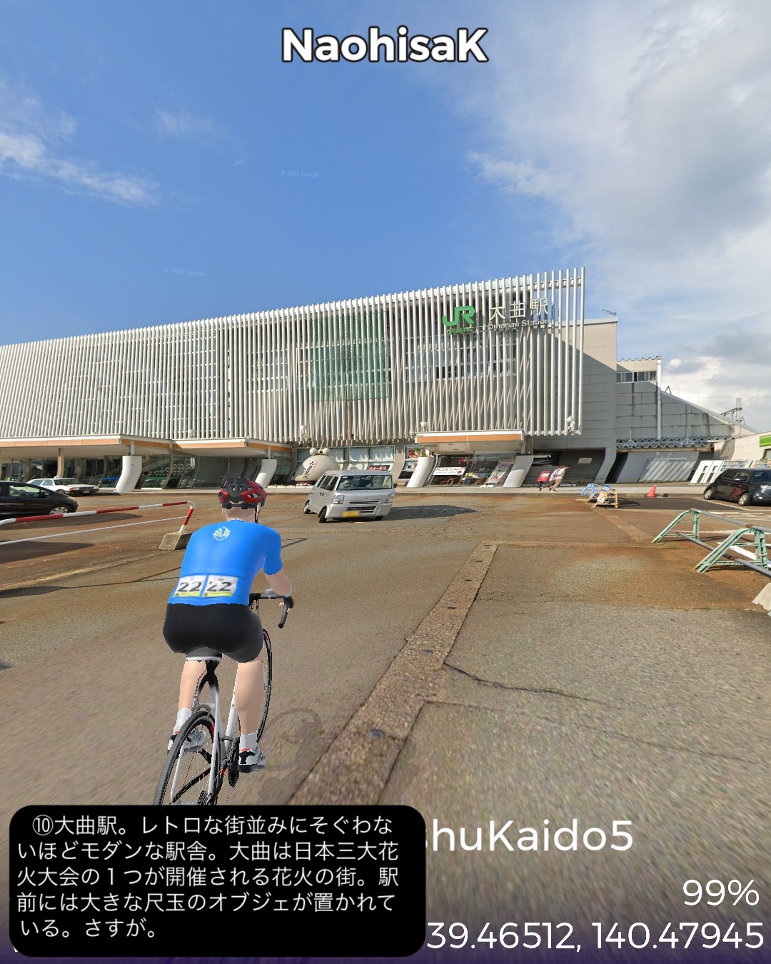 VRサイクリング 羽州街道 5日目。秋田からJR奥羽本線に沿ったルートで南東へ進路を取ってまた内陸へ進む。秋田市街中心部旭川に沿った久保田宿をスタートし、国道13号とこれに絡む旧道を切り替えながら雄物川水系の谷に沿って豊島宿、和田宿、境宿、上淀川宿、刈和野宿、北楢岡宿、神宮寺宿、花館宿と進み、大館宿のある大館駅をゴールとする57kmの行程。今回も名所旧跡、絶景ポイントに乏しい地味なルートではあったが、昔ながらの旧街道らしい長閑な田園、里山、山間の風景と情緒にあふれた宿場町を楽しめた。和田宿には武家屋敷ぽい家並が見られ、調べてみると隣接する椿台という地に城が築かれて城下町を建設したことと関係がありそうだ。その椿台は戊辰戦争の中の秋田戦争で秋田藩の最終防衛ラインとして大攻防戦が繰り広げられた場所。ここでの勝利が戊辰戦争の転機となったようだ。秋田戦争というのは初めて知ったが、新政府側についた秋田藩が、周囲の奥羽越列藩同盟の諸藩から裏切り者として攻め込まれ領内至るところが戦場となり、結果的に秋田藩内の町村の4割が焼き払われたという教科書には書かれていない悲劇があった。最終的に勝利したものの失ったものは大きく新政府からの補償はほとんどなかったという。これだけの悲惨な過去がありながらここまでの秋田県内の道程では特に関連史跡は見当たらなかったし、調べてもほとんど残っていないようなのは不思議だ。記念館ぐらい建てても良さそうなものなのに。話は脱線したが、刈和野宿は防御のため道が鍵型になっていたりカーブしたりして蔵造りの商家や古い木造の家屋が点在して宿場らしい雰囲気を醸していた。神宮寺宿は現在は国道から外れた静かな旧道沿いにちょっとくたびれたような家並が残っているだけだが、雄物川の川舟の交通の要所でもあり賑わっていたらしい。今回の終点大曲宿の1つ手前花館宿は次の大曲宿と一体化して古い商家が散見される。特に良質な地下水に恵まれて、それを利用した造り酒屋や豆腐屋などが目立つ。名産品として豆腐カステラというスイーツが豆腐屋で売られているらしい。終点の大曲宿は日本三大花火大会の1つが開催される街として知られる。モダンな大曲駅の駅舎の前には大きな尺玉のオブジェが置かれていた。