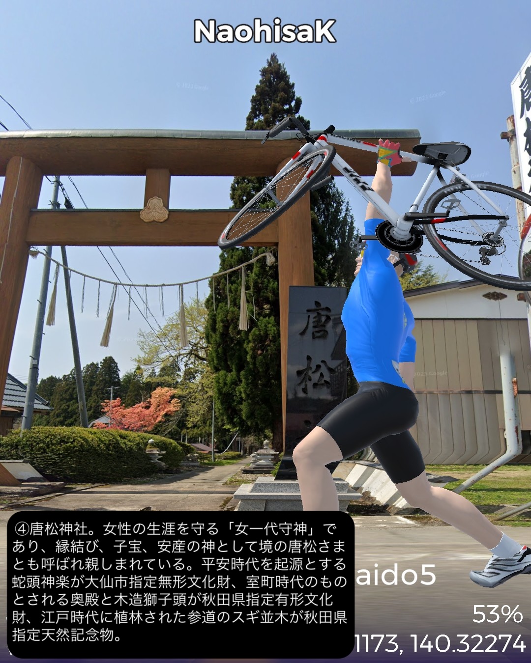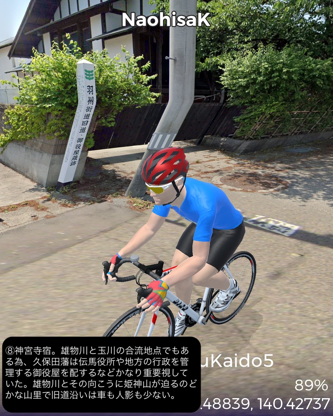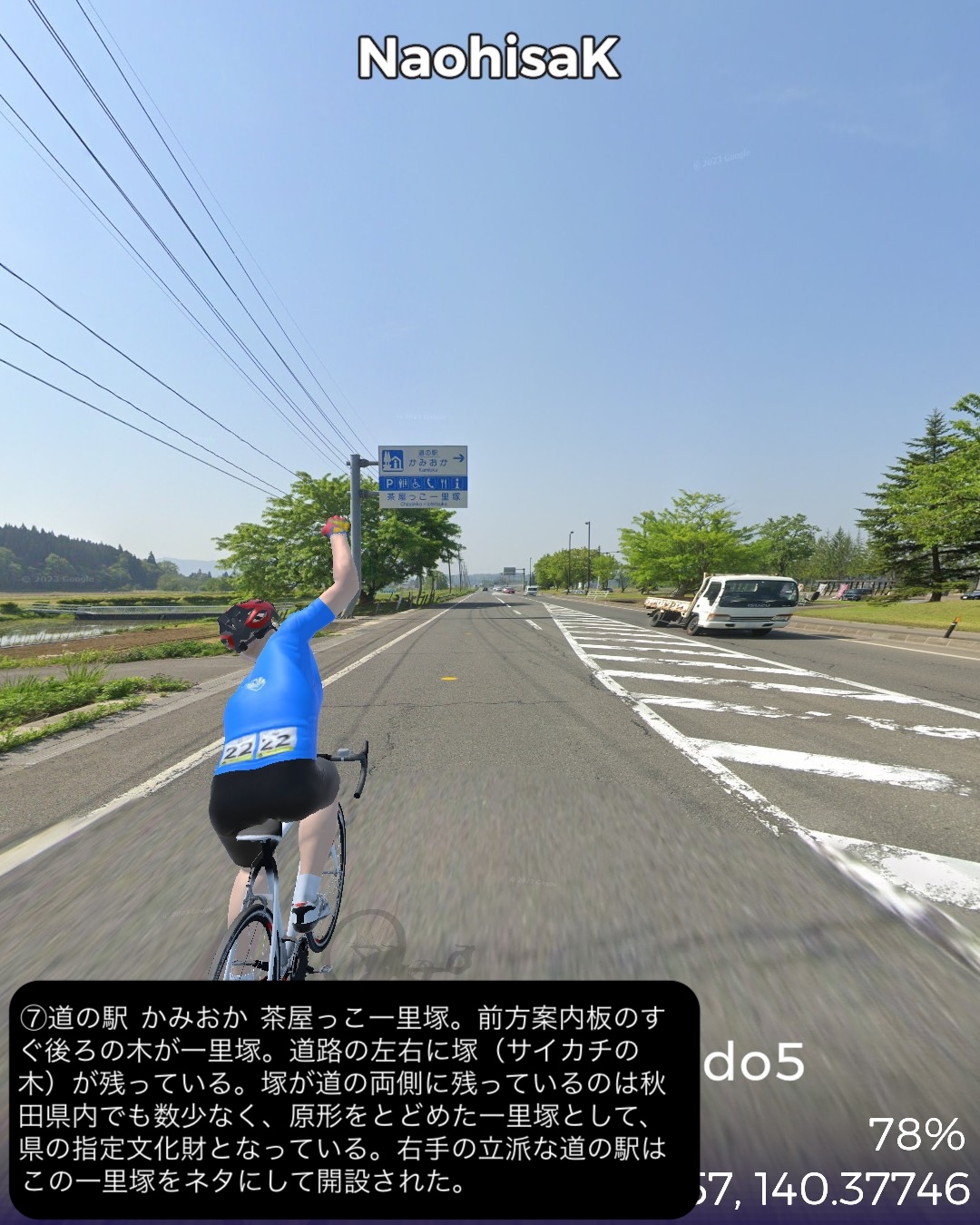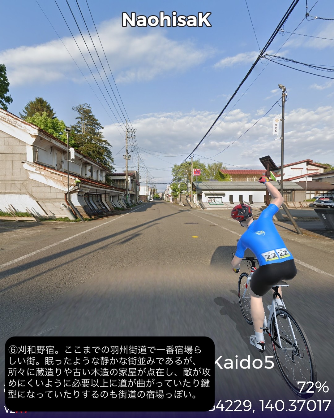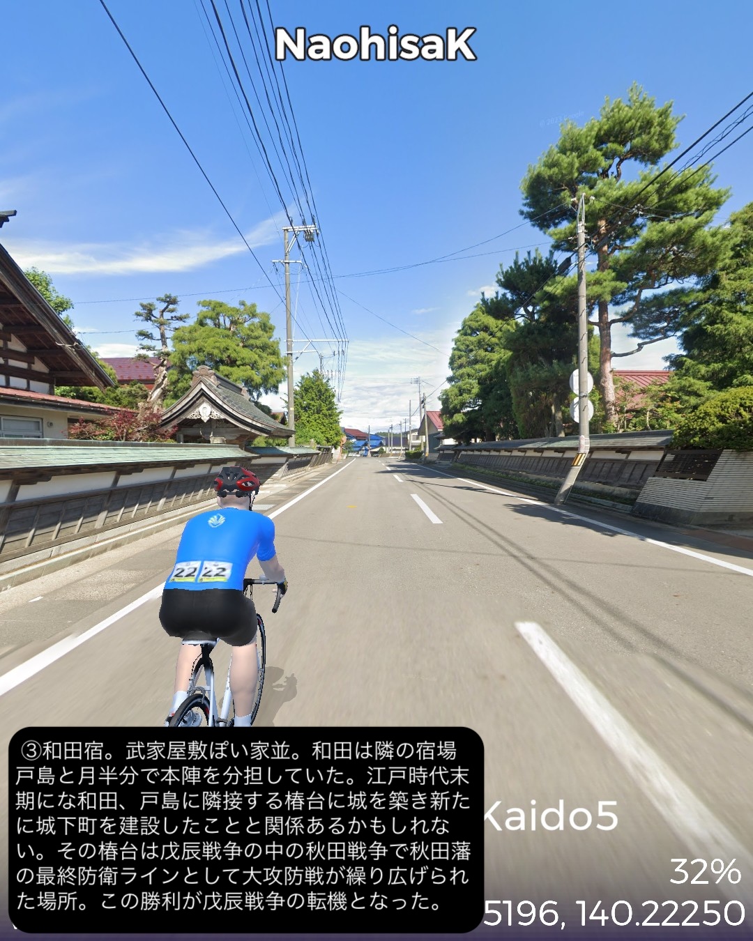 VRサイクリング 羽州街道 5日目。秋田からJR奥羽本線に沿ったルートで南東へ進路を取ってまた内陸へ進む。秋田市街中心部旭川に沿った久保田宿をスタートし、国道13号とこれに絡む旧道を切り替えながら雄物川水系の谷に沿って豊島宿、和田宿、境宿、上淀川宿、刈和野宿、北楢岡宿、神宮寺宿、花館宿と進み、大館宿のある大館駅をゴールとする57kmの行程。今回も名所旧跡、絶景ポイントに乏しい地味なルートではあったが、昔ながらの旧街道らしい長閑な田園、里山、山間の風景と情緒にあふれた宿場町を楽しめた。和田宿には武家屋敷ぽい家並が見られ、調べてみると隣接する椿台という地に城が築かれて城下町を建設したことと関係がありそうだ。その椿台は戊辰戦争の中の秋田戦争で秋田藩の最終防衛ラインとして大攻防戦が繰り広げられた場所。ここでの勝利が戊辰戦争の転機となったようだ。秋田戦争というのは初めて知ったが、新政府側についた秋田藩が、周囲の奥羽越列藩同盟の諸藩から裏切り者として攻め込まれ領内至るところが戦場となり、結果的に秋田藩内の町村の4割が焼き払われたという教科書には書かれていない悲劇があった。最終的に勝利したものの失ったものは大きく新政府からの補償はほとんどなかったという。これだけの悲惨な過去がありながらここまでの秋田県内の道程では特に関連史跡は見当たらなかったし、調べてもほとんど残っていないようなのは不思議だ。記念館ぐらい建てても良さそうなものなのに。話は脱線したが、刈和野宿は防御のため道が鍵型になっていたりカーブしたりして蔵造りの商家や古い木造の家屋が点在して宿場らしい雰囲気を醸していた。神宮寺宿は現在は国道から外れた静かな旧道沿いにちょっとくたびれたような家並が残っているだけだが、雄物川の川舟の交通の要所でもあり賑わっていたらしい。今回の終点大曲宿の1つ手前花館宿は次の大曲宿と一体化して古い商家が散見される。特に良質な地下水に恵まれて、それを利用した造り酒屋や豆腐屋などが目立つ。名産品として豆腐カステラというスイーツが豆腐屋で売られているらしい。終点の大曲宿は日本三大花火大会の1つが開催される街として知られる。モダンな大曲駅の駅舎の前には大きな尺玉のオブジェが置かれていた。
