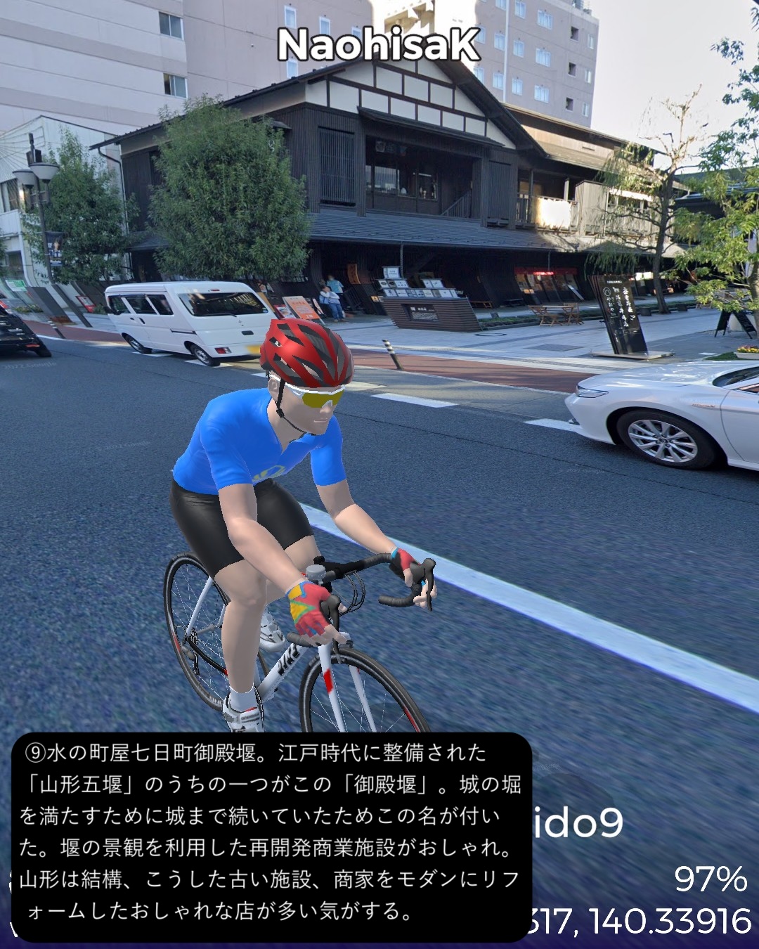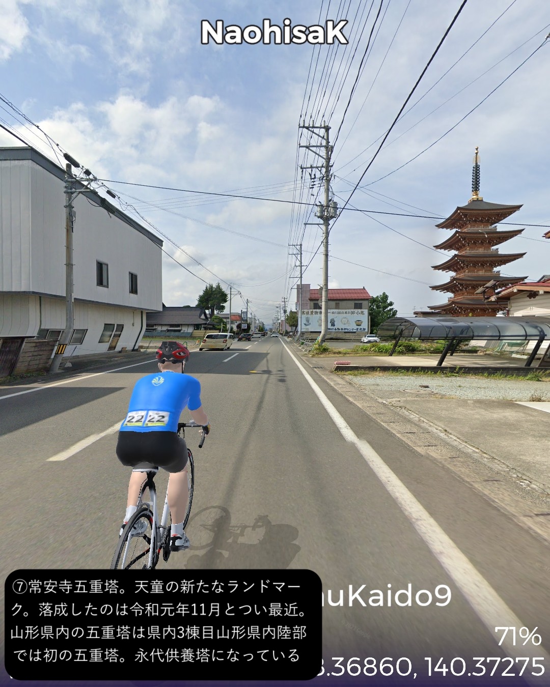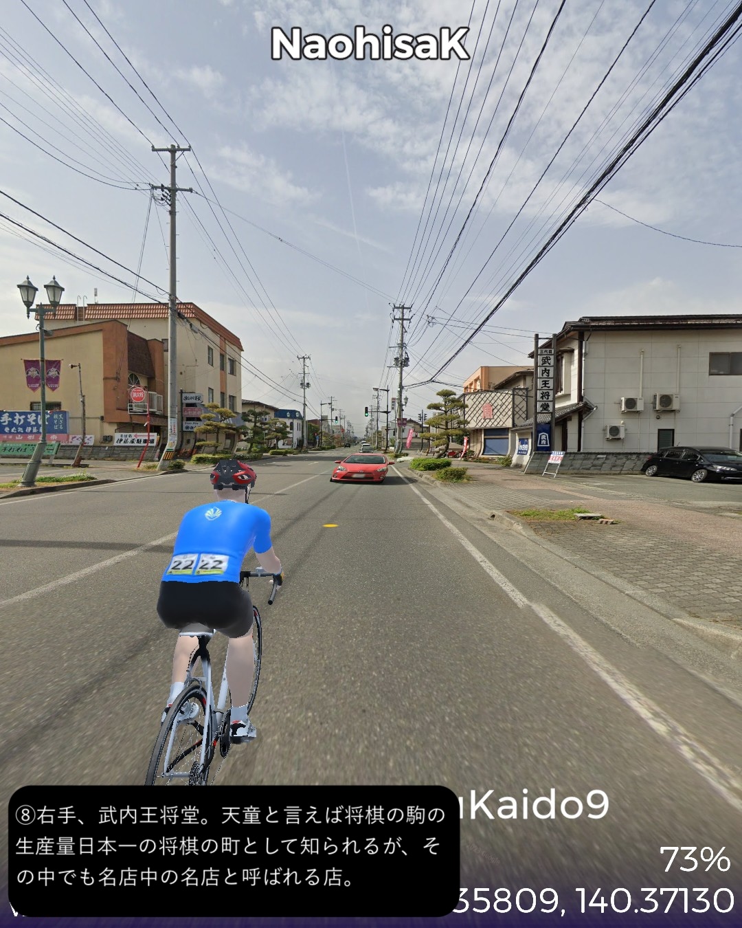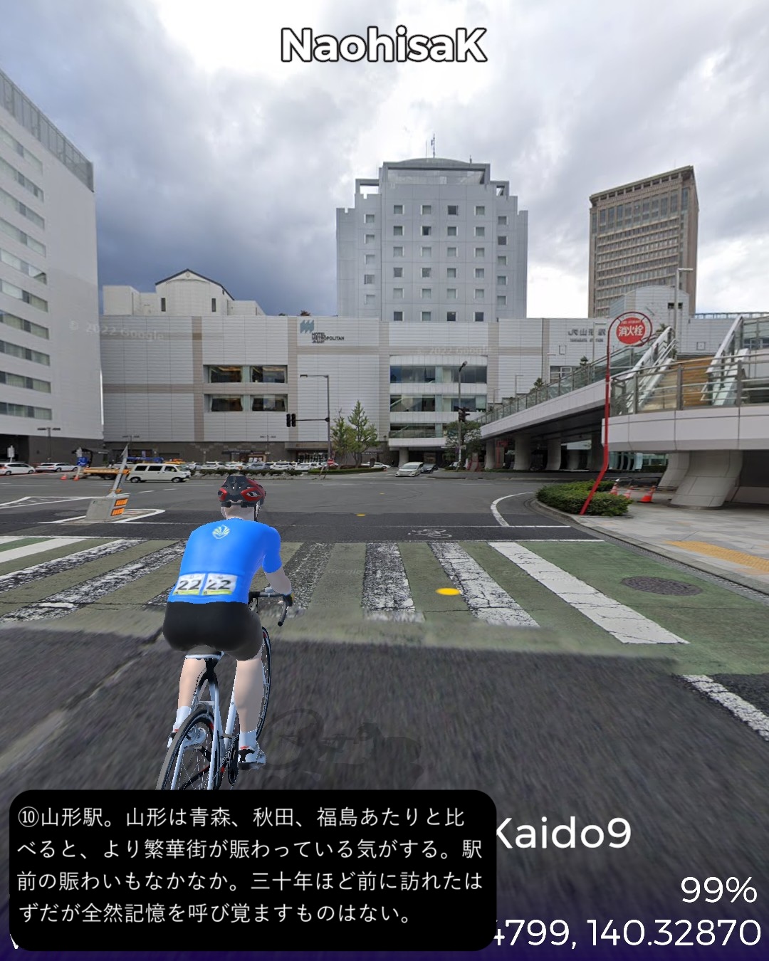 VRサイクリング、羽州街道 9日目。山形県中央部をさらに南下して山形市に至るの巻。スイカと花笠音頭の町尾花沢宿をスタートし、南へ進む。村山の手前でちょっと寄り道モードで西の最上川に向かい、最上川の川下りの現場を確認し、東沢バラ公園もついでに立ち寄った後街道へ戻り、村山市街にある楯岡宿、六田宿を経て、将棋の町天童宿。そしてゴールの県庁所在地山形宿に至る57kmの行程。最上川は前回のルートでも通ったが、どこで見ても同じぐらいの適度な川幅と水量を湛えて、適度に蛇行しつつ周囲の山野の自然に溶け込んでゆったりと流れて見飽きない美しさがある。日本三急流の1つと称されるが、ここまで見てきた場所ではそれほどの急流には見えずゆったり流れているような気がする。最上川下りはずっと下流の最上峡と2箇所で行われているが、どちらも川下りとしては人気が高いようだ。天童は将棋の町のエビデンス的なものはほとんど見かけなかった。それよりは街道沿いのしっとりと情緒ある上品な街並みが印象に残った。特に古い街並みが保存されているわけではないが、点在する古い家屋や商家と新しい建築物も伝統の枠を外さない感じがそういう印象に繋がっているのかもしれない。一方で山形は思ったより大きな都市で、仙台、盛岡には負けるけど、青森、秋田、福島よりモダンで賑わいのある都会という印象を受けた。三十年ほど前に訪れた時は県庁所在地にしては寂れた町という印象であったが、それから変わったのか。古い商家の内装をリニューアルして新しくしたようなおしゃれな店を多く見かけた。さて次回は羽州街道最終回。