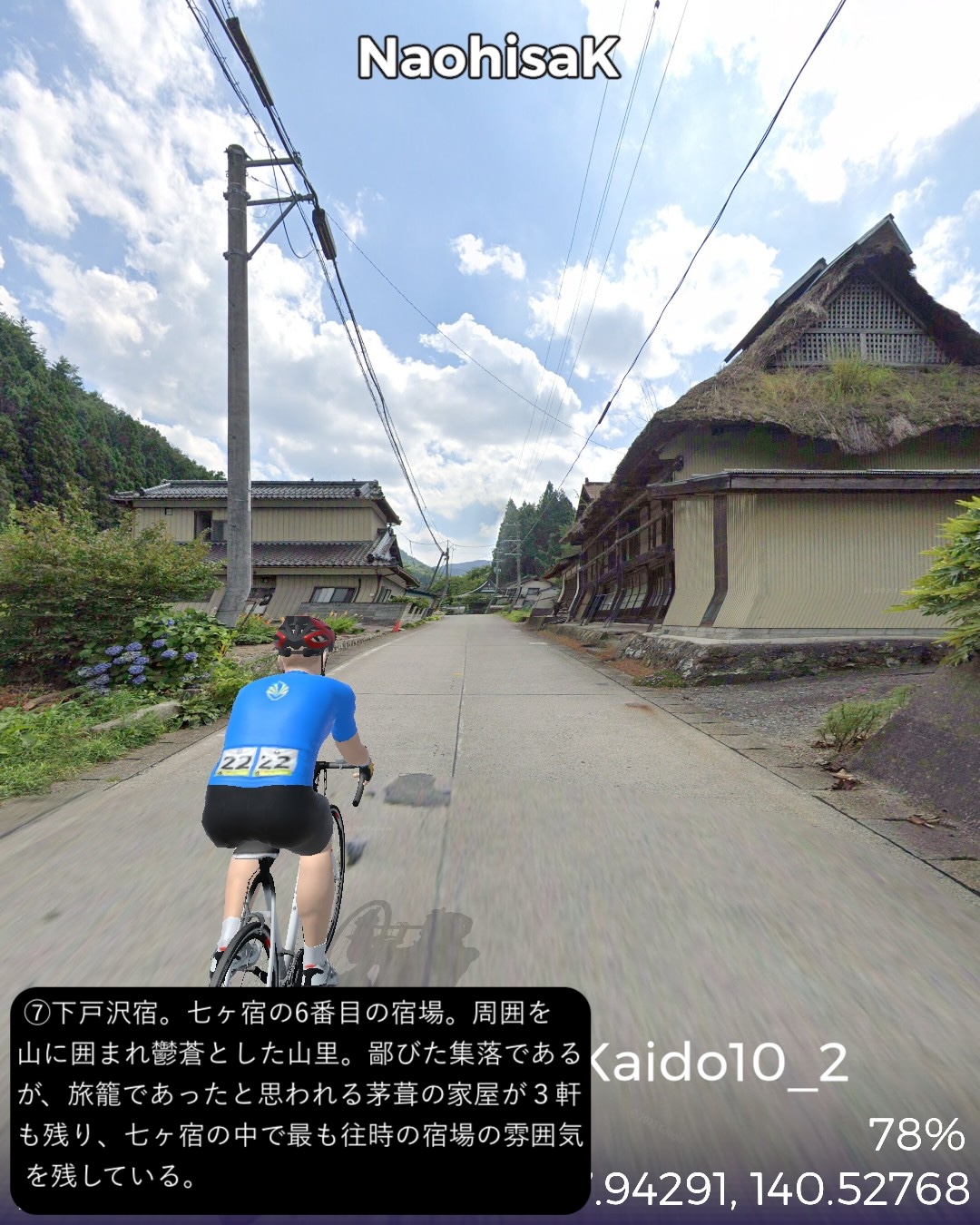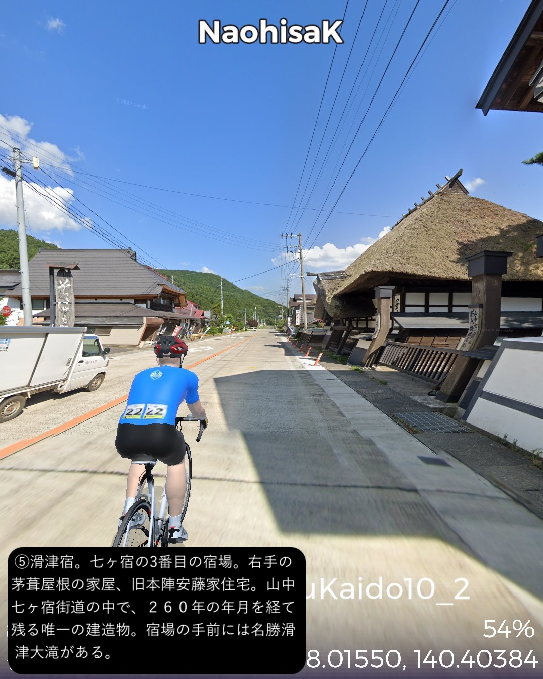 VRサイクリング 羽州街道 10日目。いよいよ羽州街道最終日。山形盆地から南蔵王山麓の山間を抜けて福島盆地に下る。山形市街をスタートしてまず南隣の城下町上山宿を巡り、ここから進行方向を南西方向へ転じて山間へ分け行ってゆく。楢下宿を経て金山峠を越えて七ヶ宿と呼ばれる、7つの宿場が連なる山間の地域を抜けて最後に小坂峠を越えて、小坂宿を通り、奥州街道との分岐点、桑折追分へ至る75kmの行程。山間ルートは結構単調で退屈なことが多いがなかなか羽州街道の最後を飾る面白い旅路であった。まず上山宿。古い家並が残る街道の宿場町の雰囲気もあるが、模擬天守ながら町に溶け込んだ上山城がデンと高台に聳え、武家屋敷通りもあり城下町の属性も備える。それにプラスして奥羽三楽郷と讃えられる名高い温泉地でしっぽりとした旅館街も広がっている。そしてこれらが箱庭のようにコンパクトに収まっているのが他では見られない特徴的な佇まいを感じるのだ。初めて訪れたつもりであったが、三十年ほど前青春18切符で2日間の行き当たりばったりの旅をした時にこの上山駅に暗くなってから降り立って上山城まで歩いたことを急に思い出した。上山からの山間ルートには多くの宿場が設置されていたが、結構現代にも街道の宿場としての痕跡が残る集落が多くてなかなか楽しめた。特に金山峠を越えて宮城県に入った七ヶ宿町はその名の通り、街道沿いに7つの宿場が数kmごとに設置されて、それぞれ違う雰囲気を漂わせつつ、どの宿場も、旅籠だったと思われる茅葺きの伝統的な家屋が結構残っていたりして、全体としてこの地区で、昔の山間の街道の雰囲気を感じることができて良かった。さて福島付近まで戻ってきて次にどこへ進むかは次回のお楽しみ。