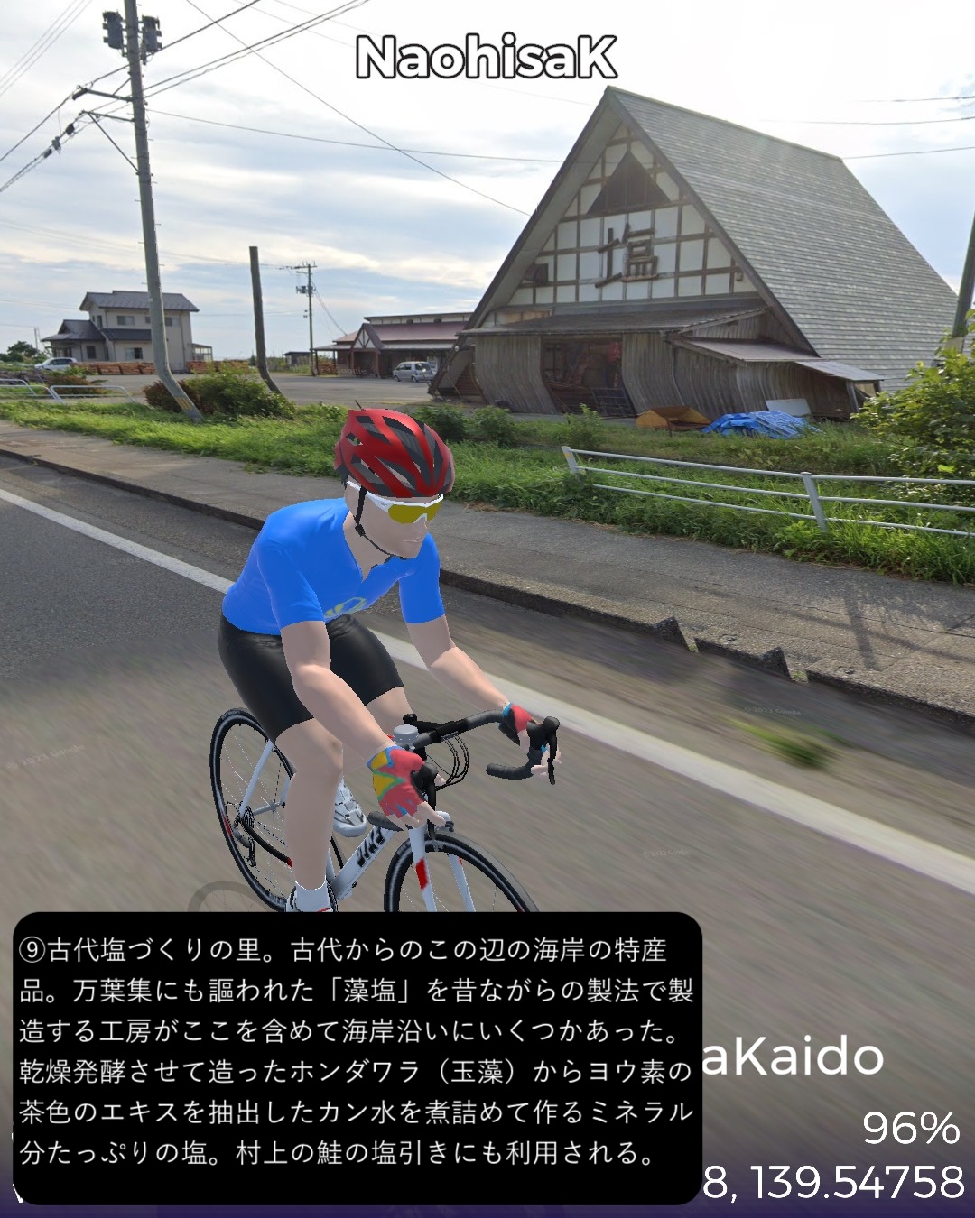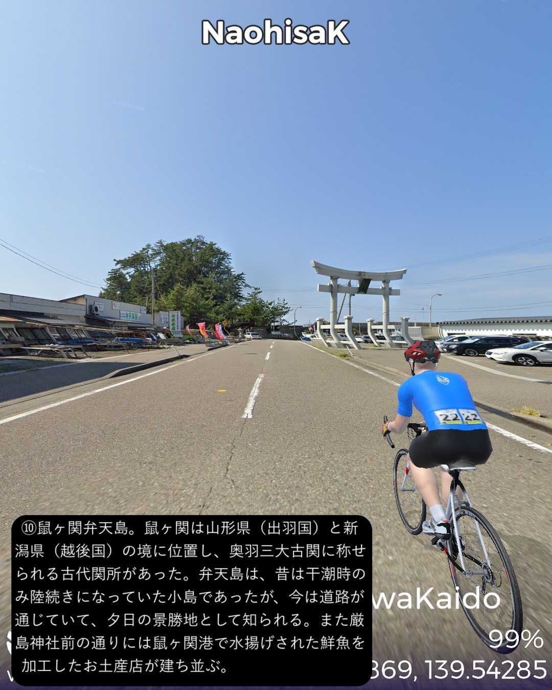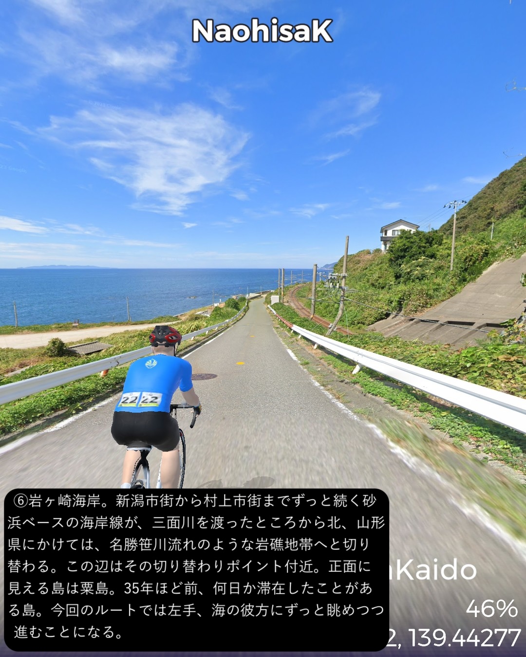 VRサイクリング 越後米沢街道 2日目と越後出羽街道をまとめて走る。久々の海岸走り。新潟県北部の日本海沿岸を往くの巻。越後米沢街道、山間から平野に出たところの宿場下関宿をスタートし、荒川沿いにさらに進み、花立宿を過ぎ、神林付近からちょっと寄り道モードで、海岸に出て、岩船港と瀬波温泉をお経由して越後米沢街道の終点城下町村上市街に辿り着く。ここから越後出羽街道に入り、さらに海岸沿いに北へ進み、早くも越後出羽街道の終点、山形県(出羽国)との境、鼠ヶ関に到達する74kmの行程。北海道以来久々の海岸の道。そして見事な程の観光ドライブルート。35年ほど前、理由は忘れたが傷心の旅に出た私は、村上駅からバスで瀬波温泉経由で岩船港へ、そこからフェリーで粟島へ渡ってしばらく滞在した。その粟島も今回の海岸沿いの道、左手の海に浮かんでいて、なかなか懐かしくも若干感傷的な気分になった。村上は非常に魅力に溢れる町であることを今回初めて知った。城下町として、城址や武家屋敷の残る武士のエリアと伝統的な町屋造りの商家が至る所に建ち並ぶ商人のエリアがしっかり現代に残り、歴史的な重みが半端なく感じられる街並みであった。また、古代から市内を流れる三面川を遡上する鮭漁が盛んで、その孵化技術で古くから世界の最先端を行き、さらに鮭の多彩な加工法、調理法、料理を生み出してきた鮭の町としてステータスが独自の魅力を醸しているのが素晴らしい。もう1度村上駅に降り立って、今度は是非じっくり街歩きをして鮭料理に舌鼓を打ちたいものだ。そう言えば皇后雅子様の小和田家は村上藩士だったというネタもあったっけ。村上市街の北の海岸線もまた素晴らしかった。笹川流れと呼ばれる、日本海の荒波の侵食によってできた奇岩、岩礁、洞窟などが続き、日本有数の透明度を誇る海岸がずっとゴールの鼠ヶ関まで続く。日本海に落ちる夕日の名所としても知られている。自然の魅力という点では北海道の方が優っているかもしれないが、ここらには古代から続く「藻塩」という海藻のエキスをふんだんに含む手作業の塩造りの伝統があり、それが村上の鮭の塩引きに利用されてご当地の統合された伝統になってゆくところが素晴らしい。さてさらに次回も日本海沿岸北上は続く。