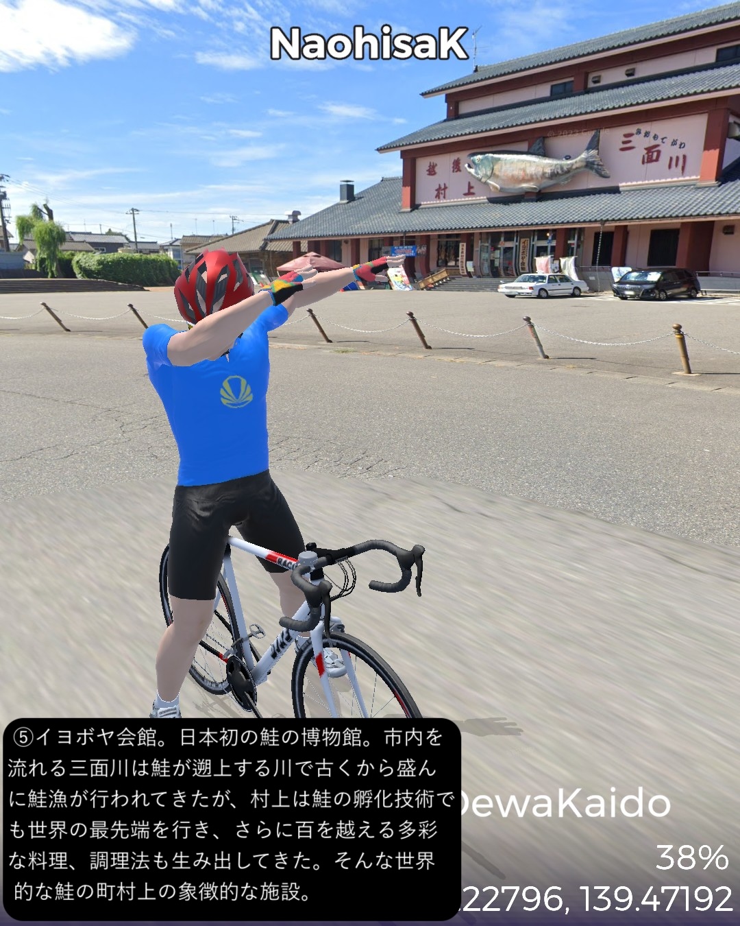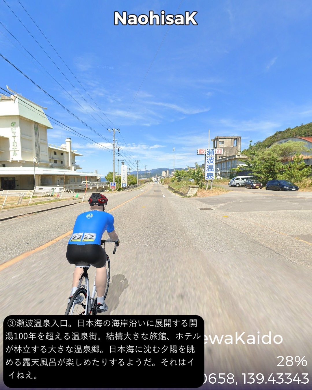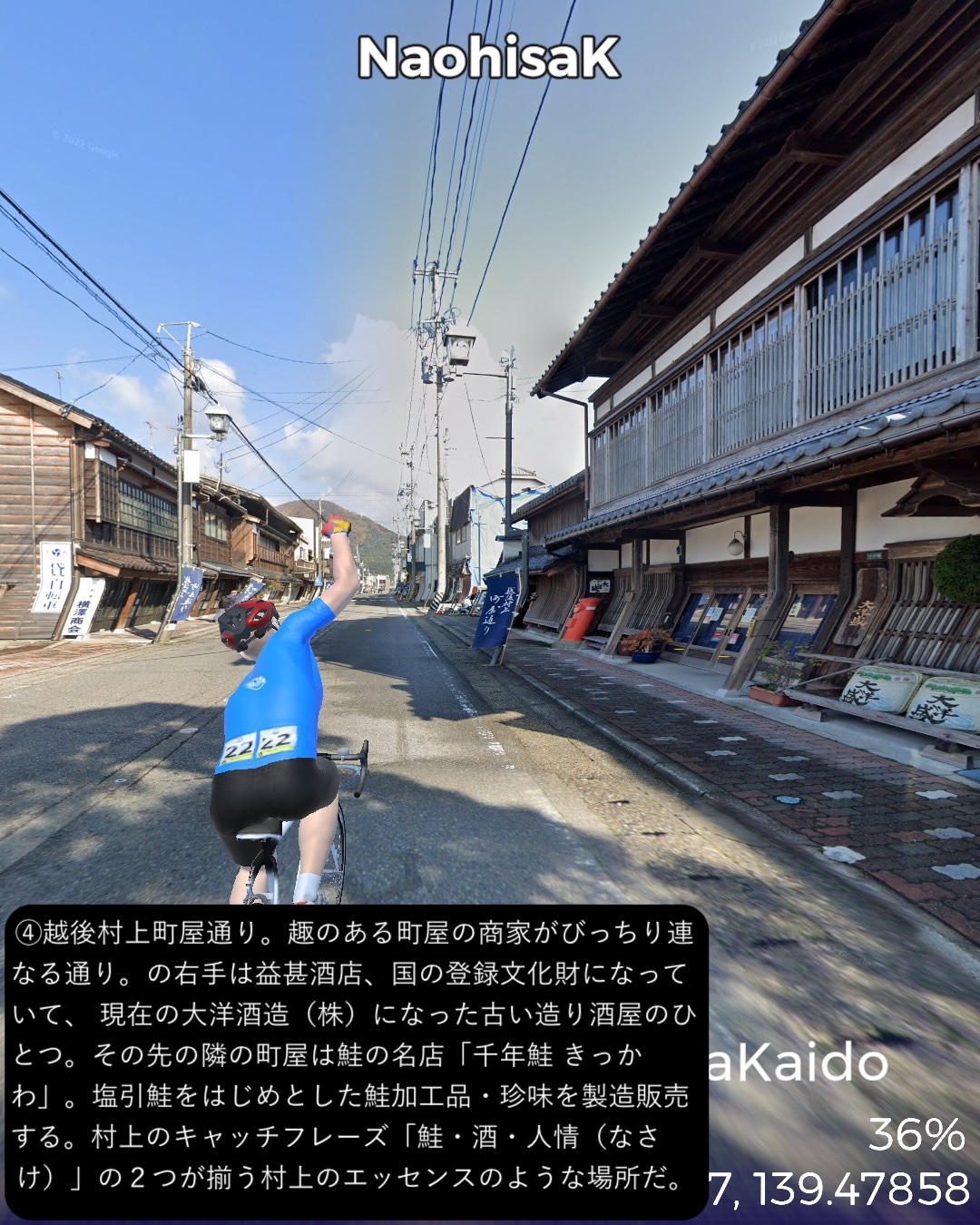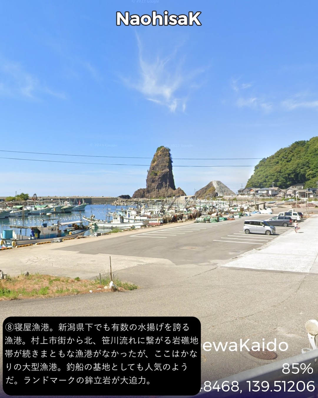 VRサイクリング 越後米沢街道 2日目と越後出羽街道をまとめて走る。久々の海岸走り。新潟県北部の日本海沿岸を往くの巻。越後米沢街道、山間から平野に出たところの宿場下関宿をスタートし、荒川沿いにさらに進み、花立宿を過ぎ、神林付近からちょっと寄り道モードで、海岸に出て、岩船港と瀬波温泉をお経由して越後米沢街道の終点城下町村上市街に辿り着く。ここから越後出羽街道に入り、さらに海岸沿いに北へ進み、早くも越後出羽街道の終点、山形県(出羽国)との境、鼠ヶ関に到達する74kmの行程。北海道以来久々の海岸の道。そして見事な程の観光ドライブルート。35年ほど前、理由は忘れたが傷心の旅に出た私は、村上駅からバスで瀬波温泉経由で岩船港へ、そこからフェリーで粟島へ渡ってしばらく滞在した。その粟島も今回の海岸沿いの道、左手の海に浮かんでいて、なかなか懐かしくも若干感傷的な気分になった。村上は非常に魅力に溢れる町であることを今回初めて知った。城下町として、城址や武家屋敷の残る武士のエリアと伝統的な町屋造りの商家が至る所に建ち並ぶ商人のエリアがしっかり現代に残り、歴史的な重みが半端なく感じられる街並みであった。また、古代から市内を流れる三面川を遡上する鮭漁が盛んで、その孵化技術で古くから世界の最先端を行き、さらに鮭の多彩な加工法、調理法、料理を生み出してきた鮭の町としてステータスが独自の魅力を醸しているのが素晴らしい。もう1度村上駅に降り立って、今度は是非じっくり街歩きをして鮭料理に舌鼓を打ちたいものだ。そう言えば皇后雅子様の小和田家は村上藩士だったというネタもあったっけ。村上市街の北の海岸線もまた素晴らしかった。笹川流れと呼ばれる、日本海の荒波の侵食によってできた奇岩、岩礁、洞窟などが続き、日本有数の透明度を誇る海岸がずっとゴールの鼠ヶ関まで続く。日本海に落ちる夕日の名所としても知られている。自然の魅力という点では北海道の方が優っているかもしれないが、ここらには古代から続く「藻塩」という海藻のエキスをふんだんに含む手作業の塩造りの伝統があり、それが村上の鮭の塩引きに利用されてご当地の統合された伝統になってゆくところが素晴らしい。さてさらに次回も日本海沿岸北上は続く。