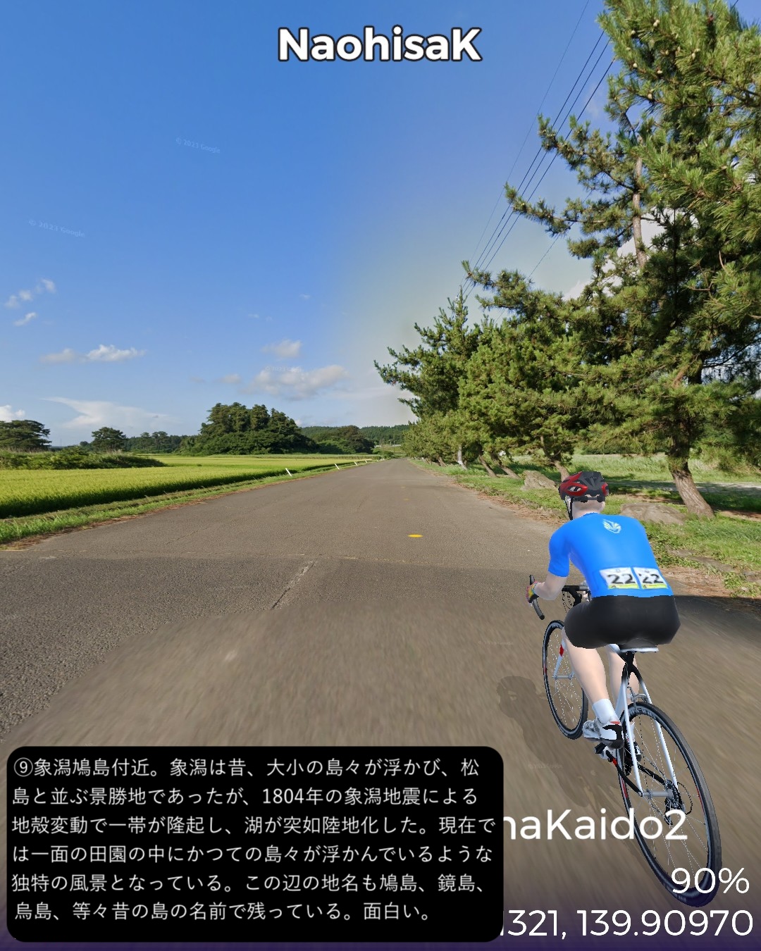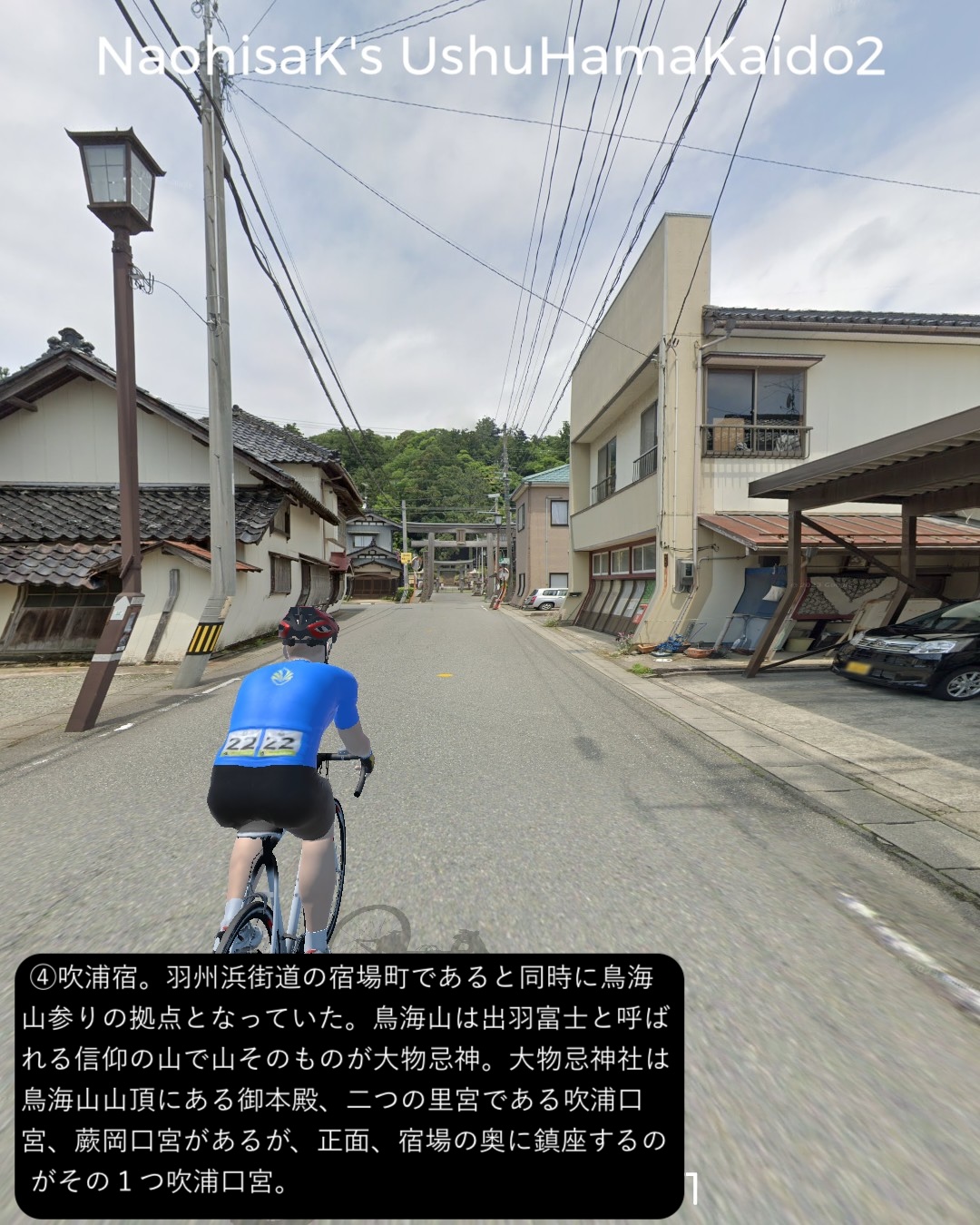 VRサイクリング 羽州浜街道 2日目。鳥海山麓を巡り山形県から秋田県へ進むの巻。最上川水運と北前船の一大基地的湊町、酒田宿をスタート。いくつかの市内の史跡を巡った後街道に沿って北上して、信仰の山、鳥海山参りの拠点となった吹浦宿から寄り道モード全開で鳥海ブルーラインというドライブコースで鳥海山の五号目を経由して秋田県側の上浜付近に下り街道へ戻る。街道をたどって象潟宿、ここでちょっとだけ寄り道で街道東側の昔の象潟湖の島々をめぐった後街道に戻り金浦宿まで進む79kmの行程。ゴールはちょっと街道を外れるが金浦出身の南極探検家白瀬中尉を記念した白瀬南極探検隊記念館とした。羽州浜街道はスタート地点の村上とゴールの秋田は行ったことがあるが、その間のルートはリアルに足を踏み入れたことのない未知のルートであり、その中にある鳥海山はちょっと憧れの山でもあった。海沿いの県境に聳える2000mを超える美しい単独の峰は、前回の新潟県から山形県に入ったあたりから見え隠れし、本街道では存在感のある山である。その中腹5号目まで登ると、秋田県側から山形県にかけての日本海のまっすぐな海岸線がはるか下界で向こうからこっちまでずっと伸びていて、多分、国内の他では見られない眺望が素晴らしかった。 霊峰として信仰対象となった鳥海山は、大物忌神のやどる出羽国一宮として、また薬師如来を本地とする霊場として繁栄してきた。本街道も大名行列だけでなく、参拝の道としても利用されてきたのであろう。もう1つ松尾芭蕉が奥の細道ツアーで最北の最終目的地とした象潟。元々は象潟湖という湖に、鳥海山の噴火によって形成された浮かぶ無数の島々が浮かぶ、松島と並ぶ景勝地で、芭蕉にとっても憧れの地であったようだ。芭蕉が訪れた後の江戸時代後期の象潟地震の地殻変動で湖が陸地化し、現在では田園地帯に昔の島々が浮かんでいるかのような独特の風景を生み出している。こんな場所があるとは初めて知った次第。さて次回は再度秋田へ到達予定。