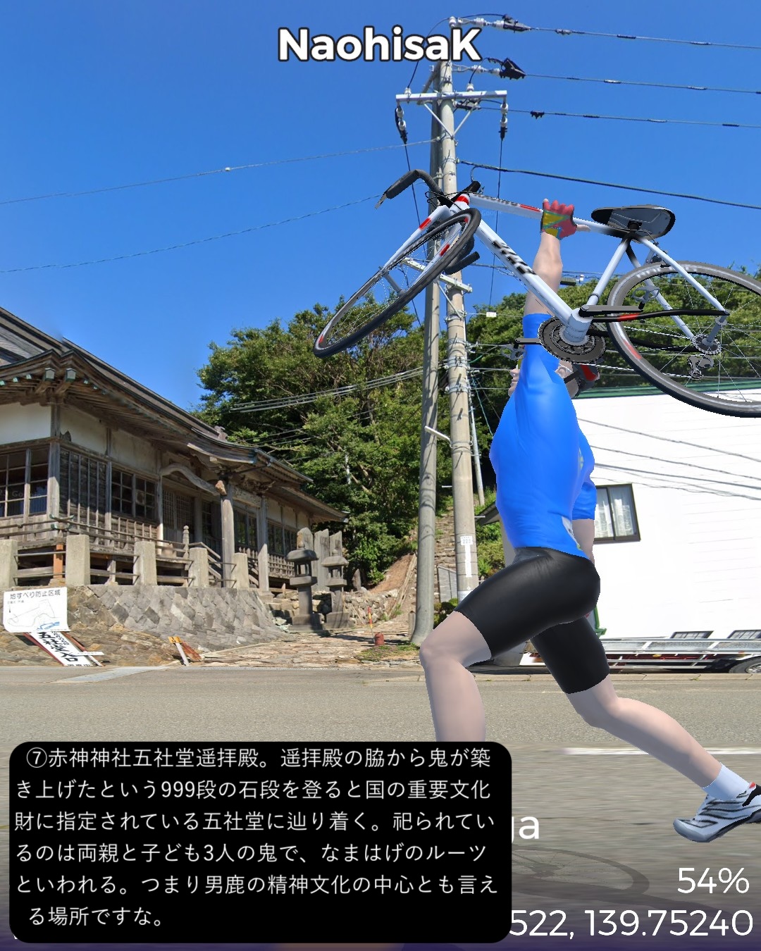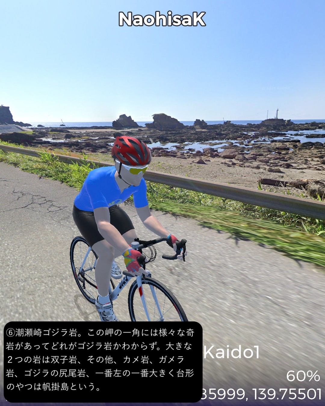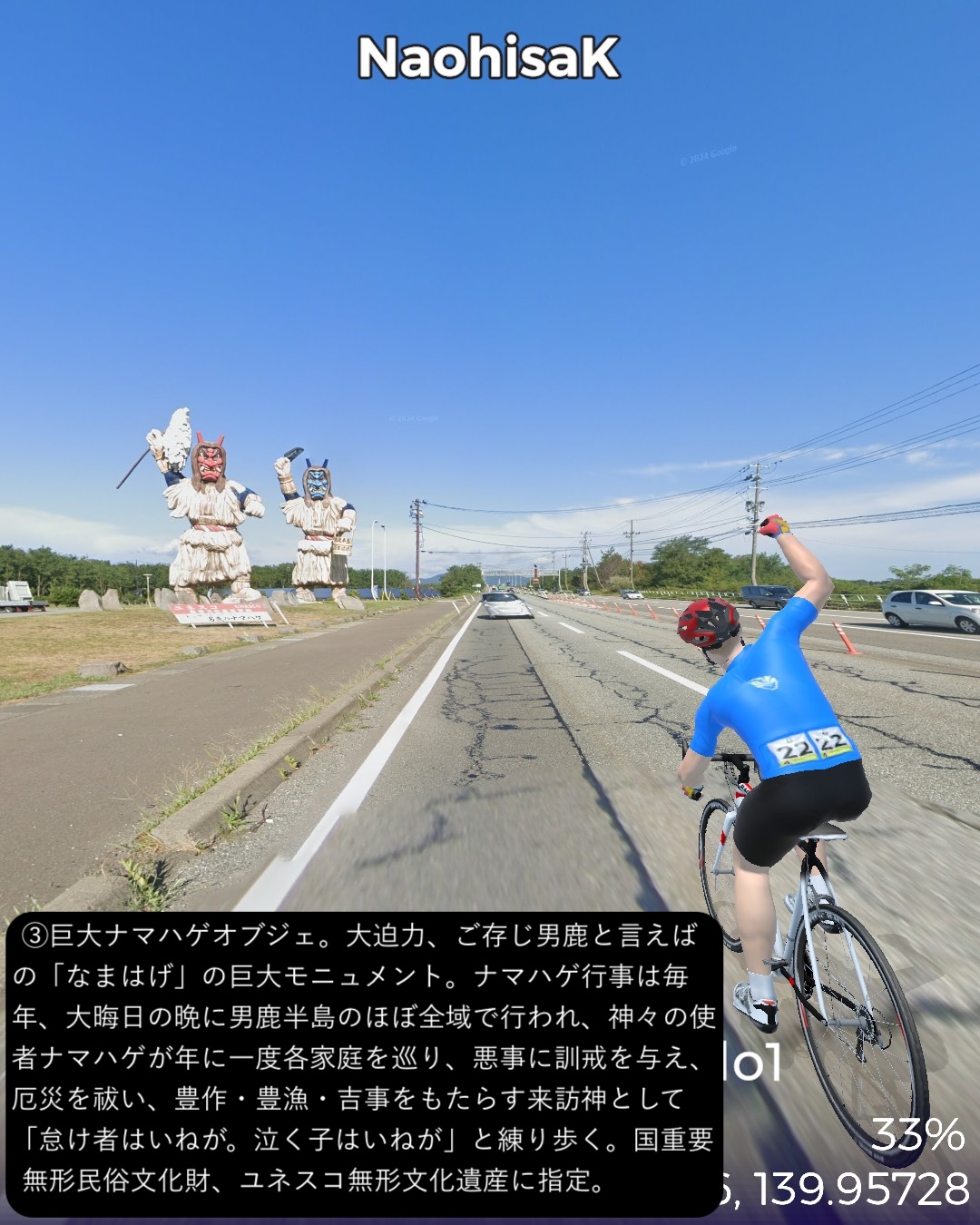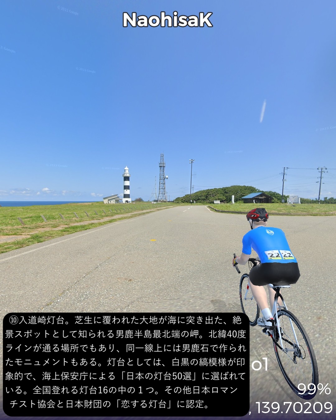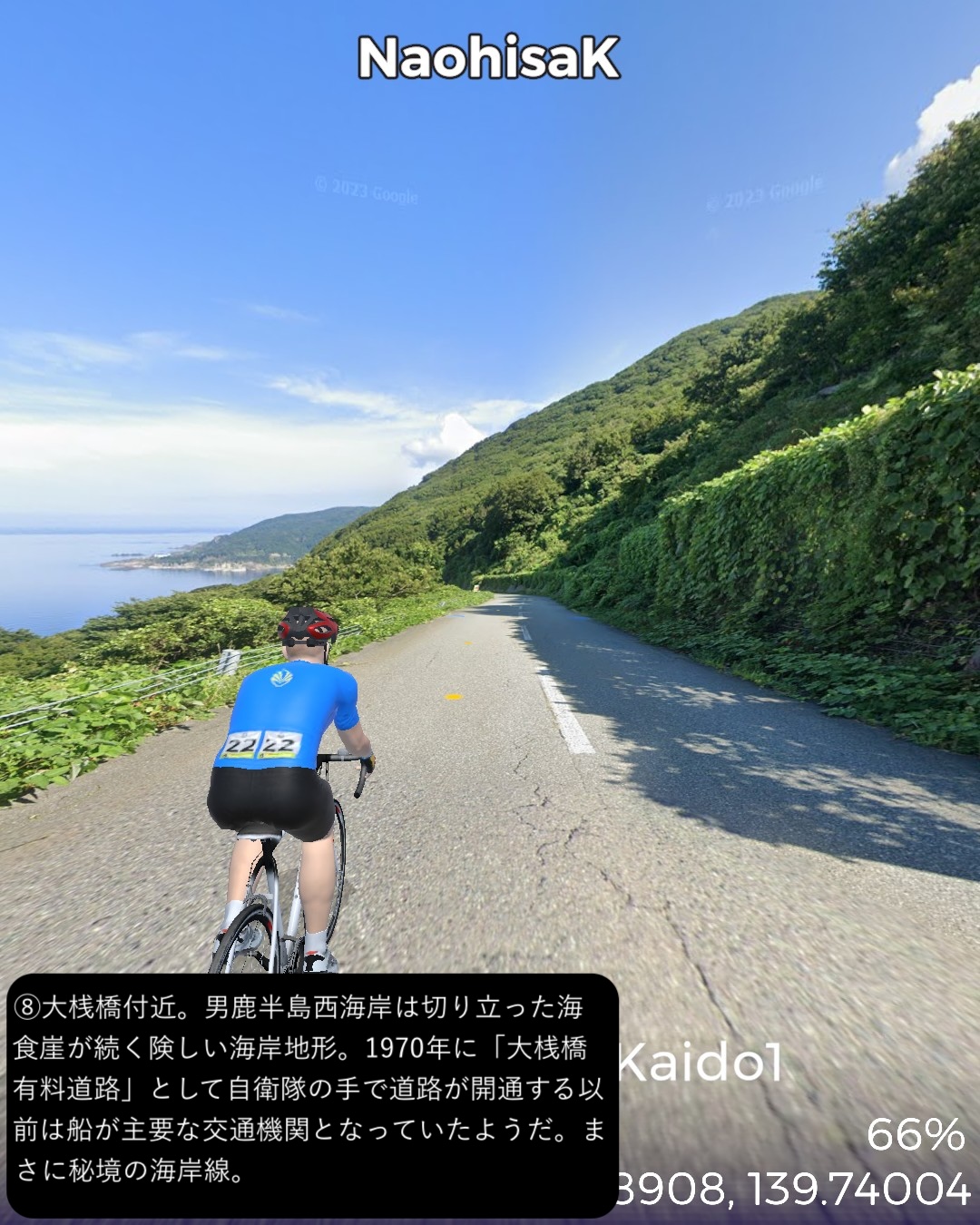 VRサイクリング 男鹿街道 1日目。秋田から男鹿半島先端まで海岸伝いにぐるっと周遊編。秋田市街中心部赤レンガ館通りをスタートし、羽州街道と男鹿街道の追分まで、久保田城址のある千秋公園や土崎付近など秋田市街の旧跡を訪ねつつ、以前通った羽州街道とは異なるルートで辿る。追分から男鹿街道に入り、まずは八郎潟と日本海に挟まれた平野を進む。八郎潟調整池と日本海を結ぶ船越水道を越えると寒風山などの男鹿半島の山々が近づいてくる。JR男鹿線の終着駅男鹿駅のある船川の街並みを過ぎるて鄙びた漁村の入江と岬をいくつか巡り、門前からは海食崖の複雑な男鹿半島西海岸の海岸線に沿って崖の上の眺めの良い道を北へ進む。昔の火口湖が丸い入江となっている戸賀からちょっと内陸に入り八望台の眺望を楽しんでさらに海岸線を北へ進み灯台のある半島の先端、入道崎に至る86kmの行程。男鹿街道はいくつか枝分かれしているが、今回はそのうちの1つ、追分から男鹿船川までの道。その先は街道を外れ、特に門前から先の西海岸は現代に整備された道を行った。男鹿半島は大学四年の冬の東北旅行で訪れてユースホステルに宿泊したのはは確かだがビジュアルな記憶がない。入道崎も行ったはずだが記憶を刺激するものはなかった。冬の景色だから違うというのもあるだろう。よって男鹿半島は初めて訪れたような感覚であったが、海岸風景が想像以上に素晴らしかった。秋田までの羽州浜街道の若干退屈な海岸風景と比べると変化に富み、海と海岸線の美しさが違う。絶景もふんだんにあった。男鹿というと「ナマハゲ」が思い出されるが、半島南西端の町門前の山の中、鬼が作ったとされる999段の石段を登った上にある国の重要文化財、赤神神社五社堂はなんと鬼が神として祀られていて、それが「ナマハゲ」のルーツになっているという。鬼が神となって悪さをする者、怠け者を戒め、家に取り憑く魔物を追い払うというちょっと過激な信仰のスタイルになっているのも、北の半島の厳しい自然に立ち向かうために必要だったのかもしれない。次回も男鹿半島の旅は続く。