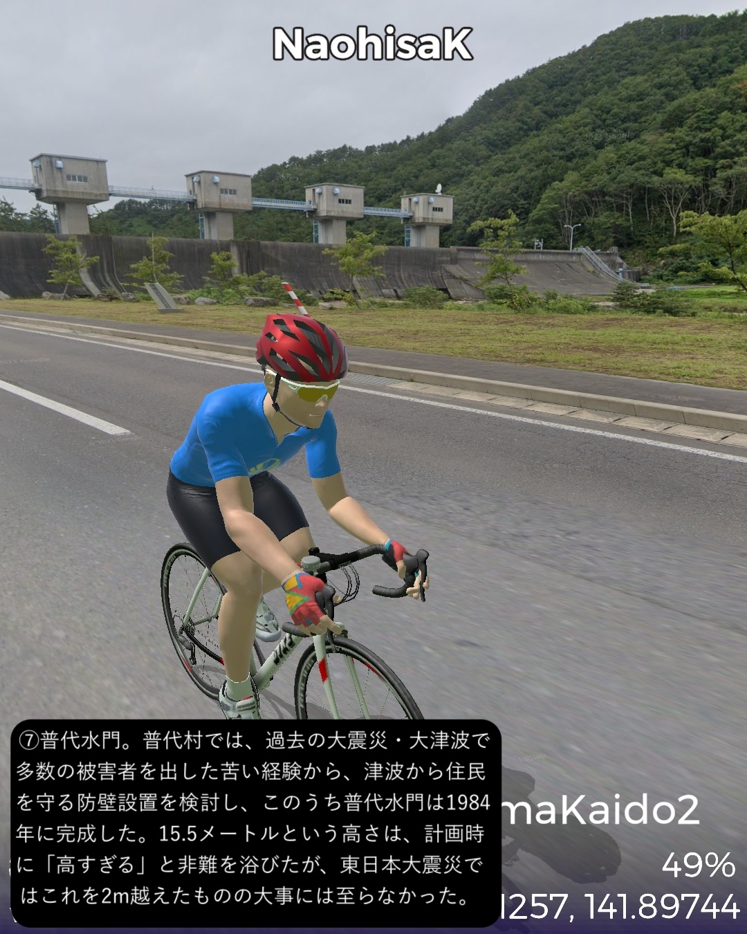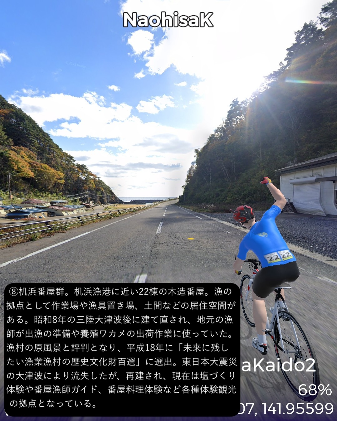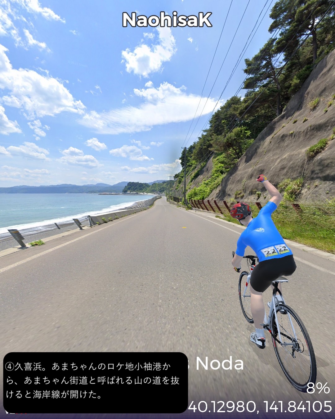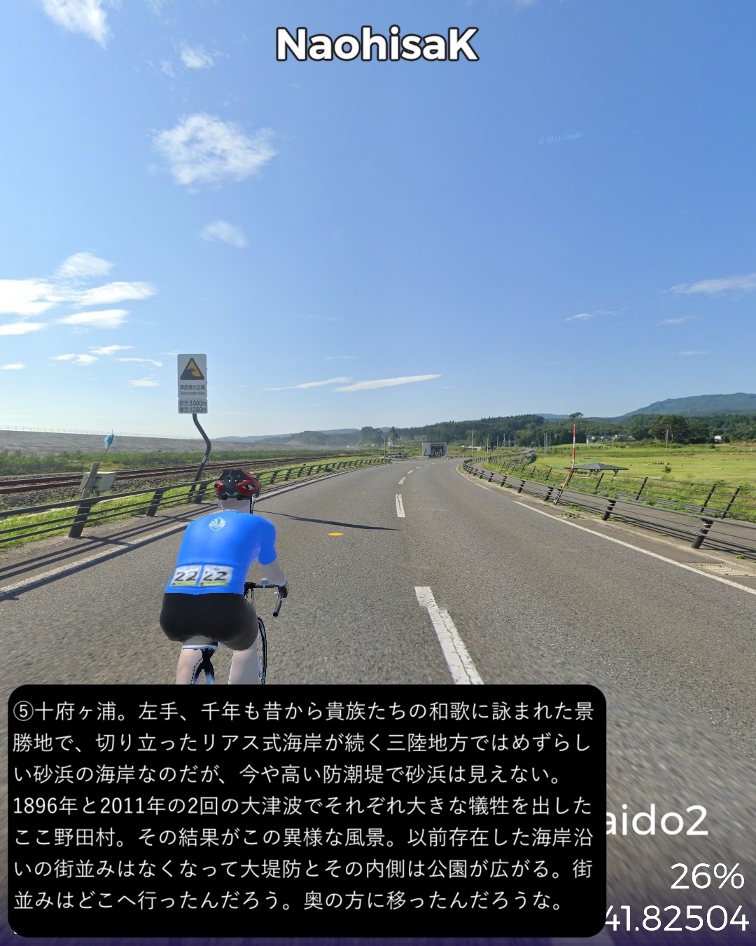 VRサイクリング 三陸浜街道 2日目。「あまちゃん」の舞台となったいわゆる北三陸の海岸線沿いに南下。JR八戸線の終着駅であり、あまちゃんでは北三陸駅となった久慈駅をスタートし、海岸沿いに「あまちゃん」のメインロケ地となった小袖海岸を経て、巨大な防潮堤と消えた集落が違和感を呼ぶ野田村を過ぎ、リアス式海岸を辿ったり、断崖の上の段丘上を走ったりを交互に繰り返しているうちに普代村、田野畑村を通りすぎ、岩泉竜泉洞が奥にある町岩泉小本をゴールとする75kmの行程。「あまちゃん」の聖地巡礼が今回の1つのテーマ。ドラマの印象では北三陸駅のある久慈市街から夏ばっぱの住んでいる海岸の集落まで遠くなさそうであったが、どうしてどうして小袖海岸は結構遠く秘境と言って良い場所だった。その分海岸線は奇岩が林立し、ウニ等の生育条件には良さそうだ。ドラマで何度も出てくる白い灯台のある防波堤もあり、「あまちゃん」のメインロケ地として聖地化しているようだが、そんなにたやすく人が押しかける観光地になるには秘境すぎる。あの賑やかなキャラがここに大勢住んでいることは到底想像できない過疎地でありました。もう1つのテーマは三陸海岸を南下してゆくにつれ明確になってくる。それは東日本大震災の爪痕。野田村に位置する十府ヶ浦は千年も昔から貴族たちの和歌に詠まれた景勝地で、切り立ったリアス式海岸が続く三陸地方ではめずらしい美しい砂浜の海岸のはずであるが、今や高い防潮堤が浜を覆い、また被害を受けた街並みは消えて防潮堤の内側にはだだっ広い防災公園になっている。他の海沿いの漁港や浜も同様で、防潮堤が海岸線を囲い、海岸線沿いは家並も薄く殺風景。集落は段丘の上に展開しているパターンが多く見られた。本来、美しいリアス式海岸が続く国立公園地帯だけに残念。また断崖絶壁の絶景が見られる北山崎など、ダイナミックな海岸美が見えるビューポイントはルートを設定できないことが多くそれも残念だったが、ところどころで海岸美の実力は垣間見えた。次回は宮古に到着しさらに先へ進む予定。
