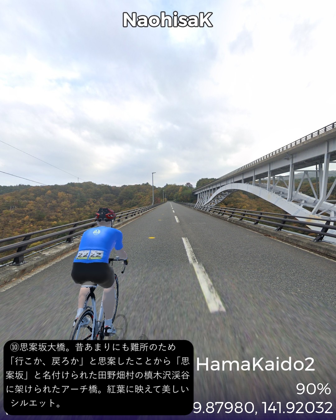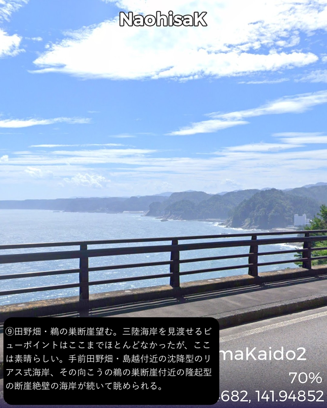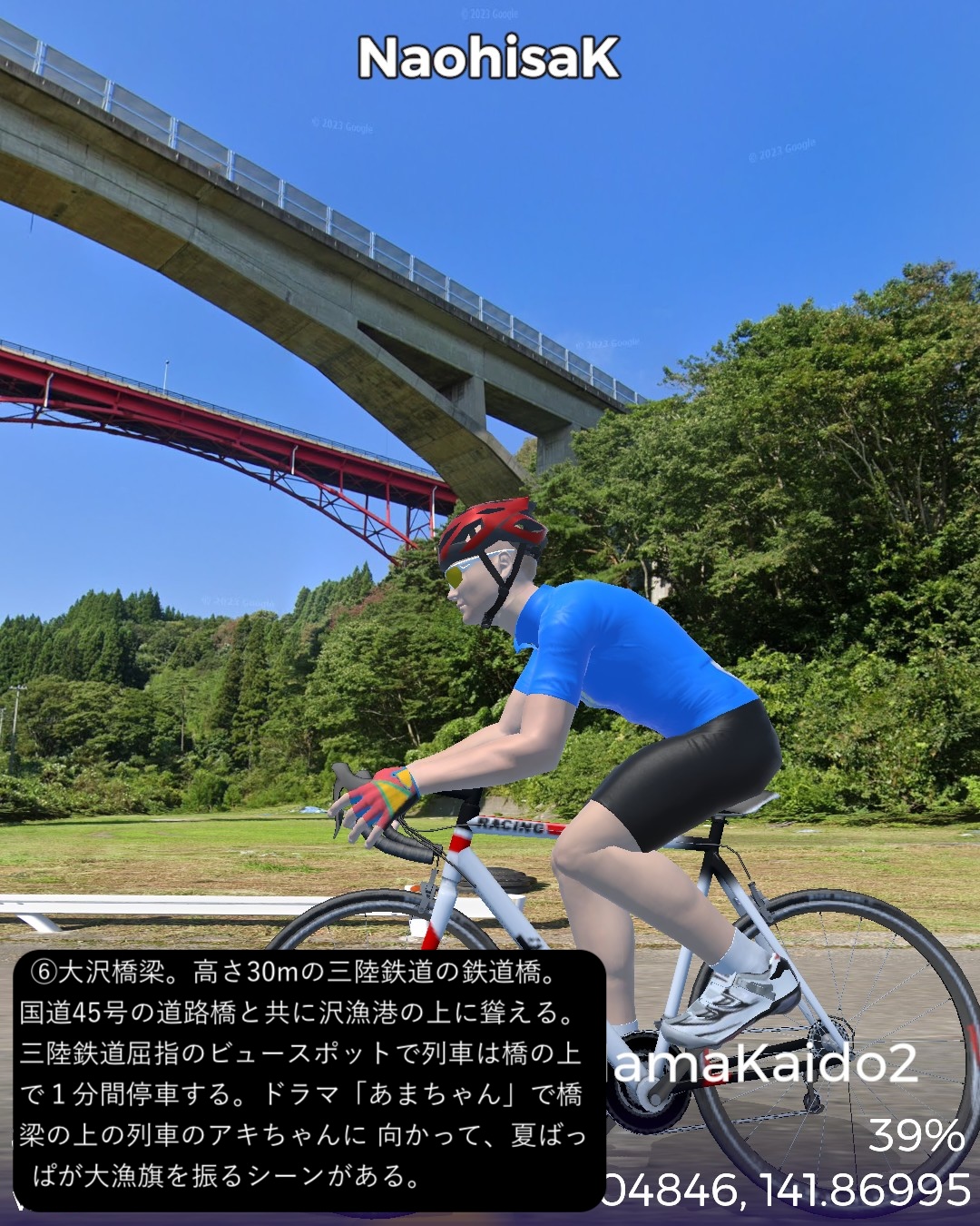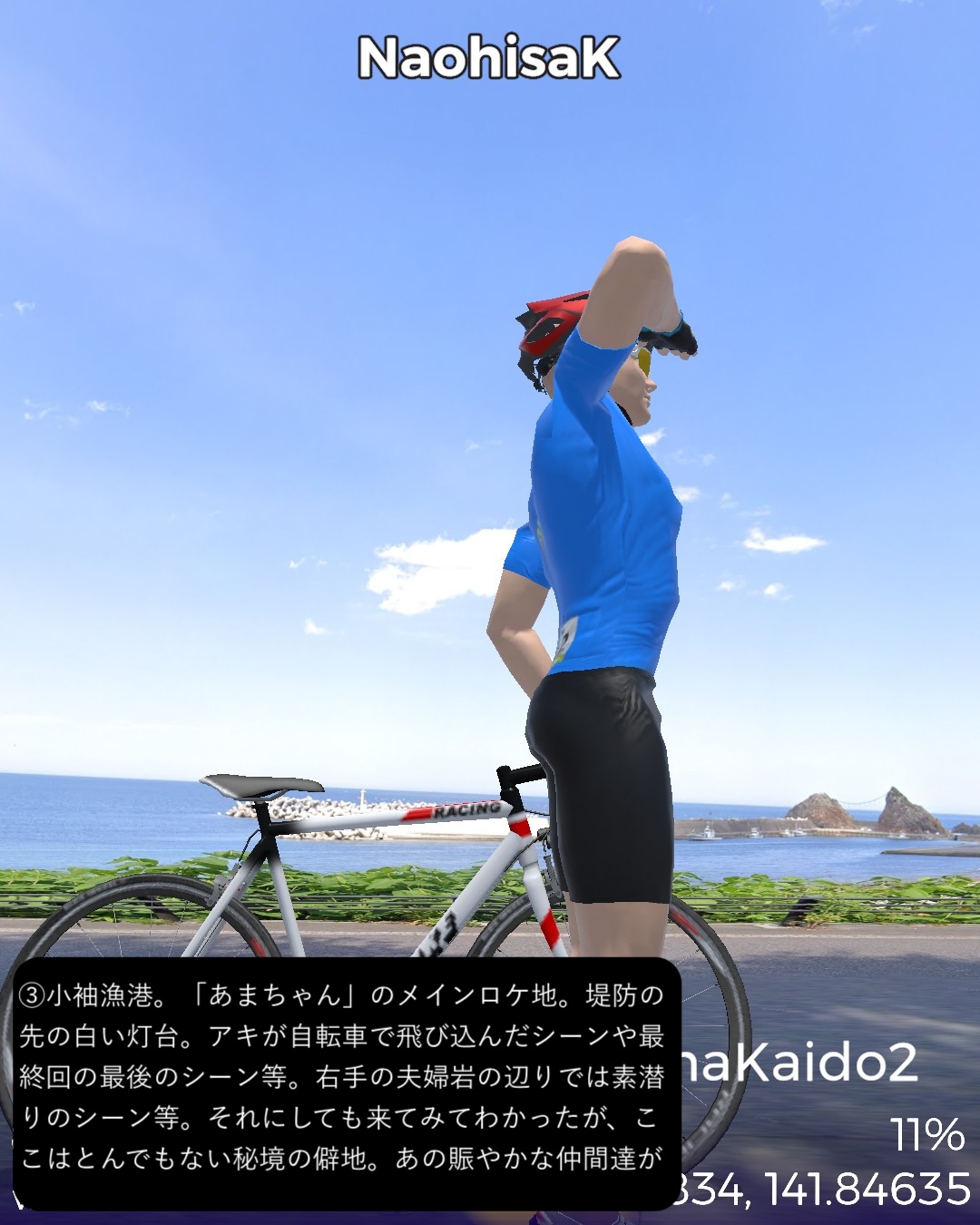 VRサイクリング 三陸浜街道 2日目。「あまちゃん」の舞台となったいわゆる北三陸の海岸線沿いに南下。JR八戸線の終着駅であり、あまちゃんでは北三陸駅となった久慈駅をスタートし、海岸沿いに「あまちゃん」のメインロケ地となった小袖海岸を経て、巨大な防潮堤と消えた集落が違和感を呼ぶ野田村を過ぎ、リアス式海岸を辿ったり、断崖の上の段丘上を走ったりを交互に繰り返しているうちに普代村、田野畑村を通りすぎ、岩泉竜泉洞が奥にある町岩泉小本をゴールとする75kmの行程。「あまちゃん」の聖地巡礼が今回の1つのテーマ。ドラマの印象では北三陸駅のある久慈市街から夏ばっぱの住んでいる海岸の集落まで遠くなさそうであったが、どうしてどうして小袖海岸は結構遠く秘境と言って良い場所だった。その分海岸線は奇岩が林立し、ウニ等の生育条件には良さそうだ。ドラマで何度も出てくる白い灯台のある防波堤もあり、「あまちゃん」のメインロケ地として聖地化しているようだが、そんなにたやすく人が押しかける観光地になるには秘境すぎる。あの賑やかなキャラがここに大勢住んでいることは到底想像できない過疎地でありました。もう1つのテーマは三陸海岸を南下してゆくにつれ明確になってくる。それは東日本大震災の爪痕。野田村に位置する十府ヶ浦は千年も昔から貴族たちの和歌に詠まれた景勝地で、切り立ったリアス式海岸が続く三陸地方ではめずらしい美しい砂浜の海岸のはずであるが、今や高い防潮堤が浜を覆い、また被害を受けた街並みは消えて防潮堤の内側にはだだっ広い防災公園になっている。他の海沿いの漁港や浜も同様で、防潮堤が海岸線を囲い、海岸線沿いは家並も薄く殺風景。集落は段丘の上に展開しているパターンが多く見られた。本来、美しいリアス式海岸が続く国立公園地帯だけに残念。また断崖絶壁の絶景が見られる北山崎など、ダイナミックな海岸美が見えるビューポイントはルートを設定できないことが多くそれも残念だったが、ところどころで海岸美の実力は垣間見えた。次回は宮古に到着しさらに先へ進む予定。