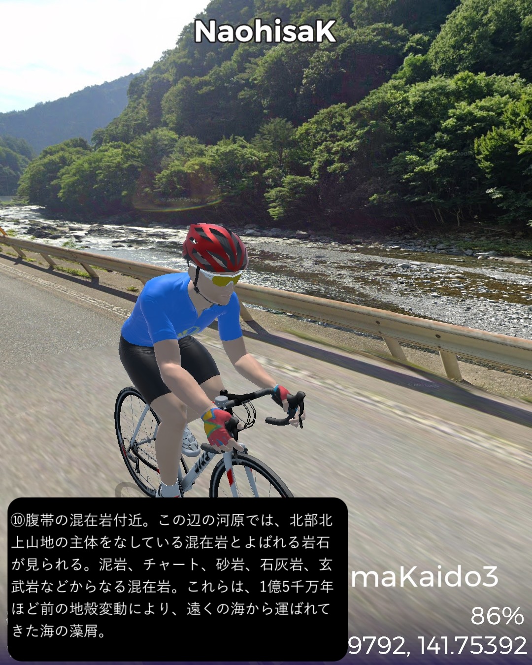VRサイクリング 三陸浜街道3日目+宮古街道1日目として、三陸海岸を宮古まで南下した後、JR山田線に沿って西へ方向転換して盛岡を目指す。神秘の地底湖龍泉洞への玄関口岩泉小本を出発し、陸中海岸をさらに南下。ただし海岸段丘地帯であるためほとんど海の見えないルート。奇岩三王岩のある田老を経て、陸中海岸を代表する景観、浄土ヶ浜付近を抜けて漁港都市宮古に辿り着く。ここまでが三陸浜街道。街道はさらに海岸伝いに南へと続くが、今回のルートはここから閉伊川沿いに西へ向かう宮古街道に切り替わって山へ入ってゆく。閉伊川の渓谷美を堪能しつつ進み川井をゴールとする82kmの行程。距離が長い割にこれといったビューポイントや史跡に欠けるルートとなった。三王岩や浄土ヶ浜は残念ながら拝めるポイントがなく、海岸の景色はむしろ本来優美なビーチ女遊戸海岸の裏に聳える日本で2番目に高い防潮堤や、万里の長城と呼ばれる巨大で堅牢な防潮堤を築きながら、それを乗り越えた東日本大震災の津波被害により震災遺構のたろう観光ホテルだけが寂しく残る田老漁港などの心に刺さる殺伐とした風景の印象が強い。中学の修学旅行と大学四年冬の東北旅行で宮古・田老付近を2度訪れて、心に残ったはずの大自然への感動はどこへいったのだろう。宮古街道は単調ではあるが閉伊川を遡ってゆくルート。うねうねと曲がりくねった川を辿って行くと共に高くはないが深い山々の中に分け入ってゆく。中流域に来ると「腹帯の混在岩」と呼ばれる泥岩、チャート、砂岩、石灰岩、玄武岩などの様々な岩が河原に見られるようになる。これらは1億5千万年ほど前の地殻変動により、遠くの海から運ばれてきた海の藻屑で、三陸の大地の構成を端的に示すものらしい。次回は再度盛岡へ辿り着く予定。