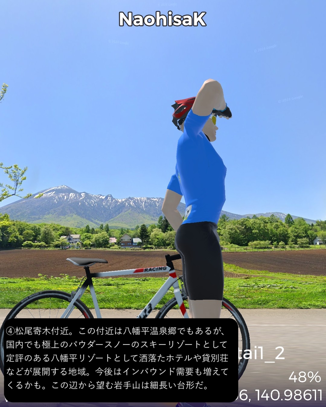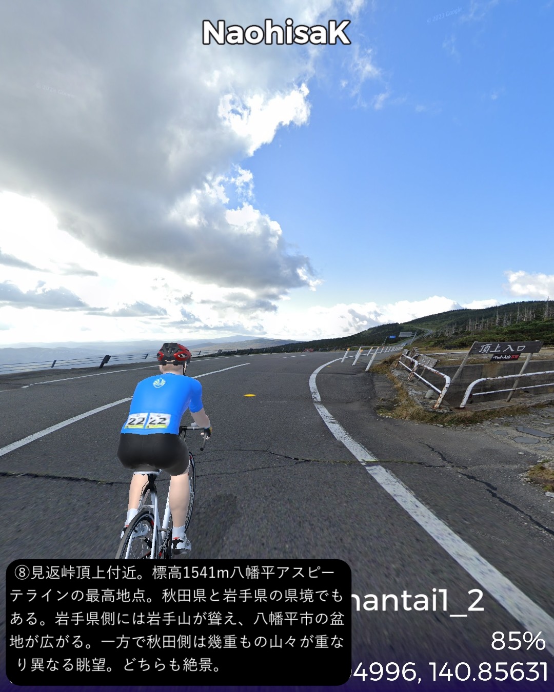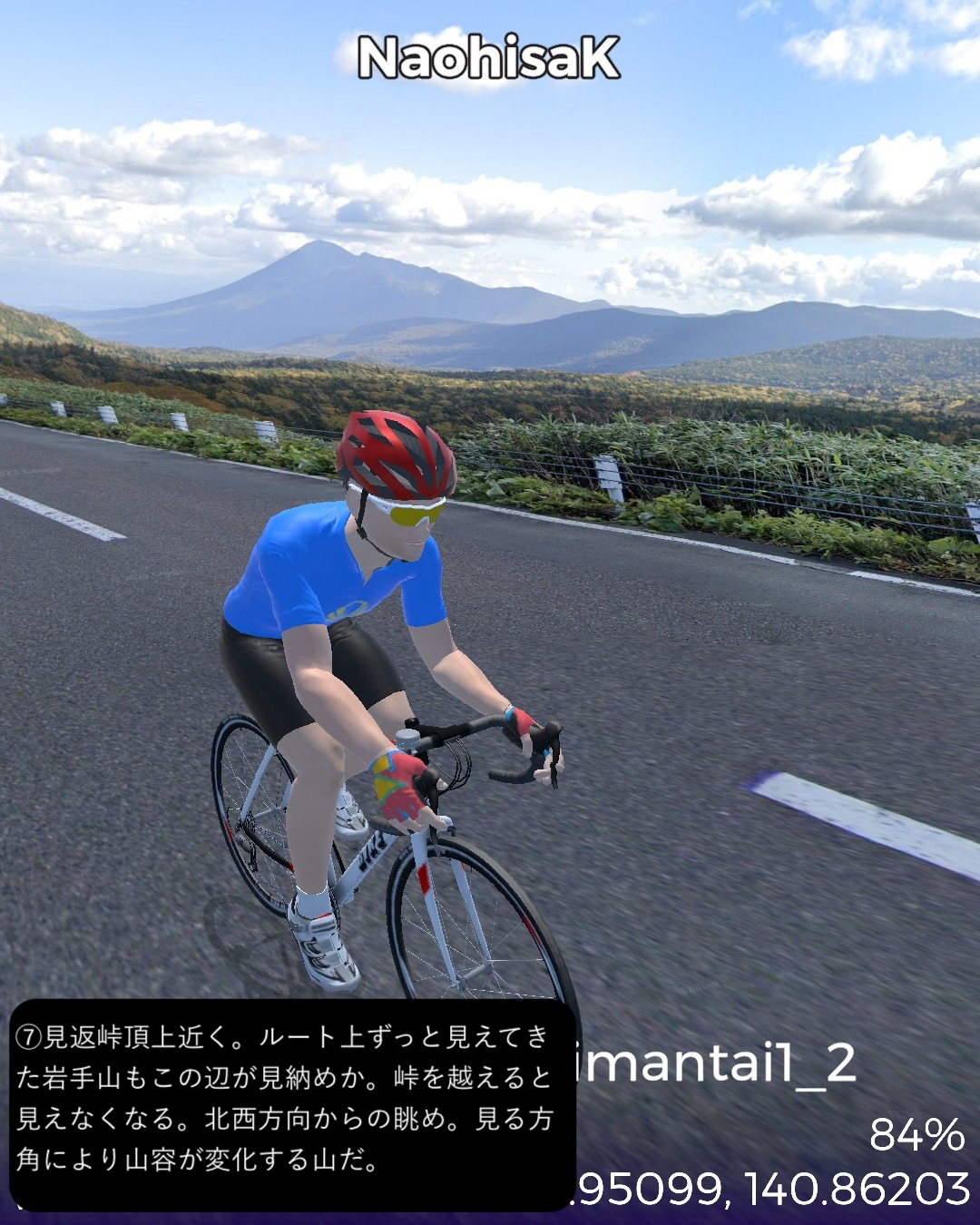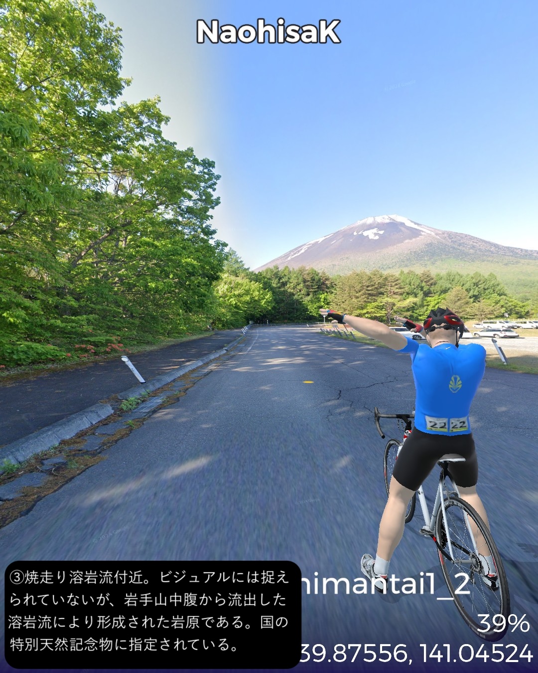 VRサイクリング 八幡平山系をグルッと巡る観光ルートを行ってみる。名付けて八幡平ラウンド、その1日目。盛岡駅を出発し、最初は鹿角街道、といっても片道2車線の国道282号を進む。滝沢を過ぎ西根まで行ったところで、岩手山の溶岩流の焼走りを経由して八幡平温泉のある八幡平リゾート付近へと進み、そこから八幡平アスピーテラインというドライブウェイに入る。標高1500m越えの八幡平山頂に近い見返峠を越え秋田県に入り後生掛温泉をゴールとする69kmの行程。今回のルートは見返峠を越えるまで岩手県のシンボル岩手山を視野に入れつつ、その南東側から反時計回りに北西側までグルッとめぐることになった。岩手山は廻るに連れて山容が変化する山であるが、やはり盛岡市街方面から望む形がシンプルに均整が取れていて最も美しく感じた。八幡平は昔スキーで地域の外れの安比高原に行ったことはあるが、中心地域には足を踏み入れたことがなく長らく訪れたい場所の1つにノミネートされたままの場所だった。今回VRで訪れてみて、国立公園に指定されているだけあって岩手山を含めて山の風景が素晴らしいところだと認識した。蒸ノ湯温泉や後生掛温泉といった秘湯もそそられる。いずれ訪れてみたい場所だなあ。(VRサイクリングを進めるにつれ訪れたい場所がオーバーフローしつつあるのを感じているが)