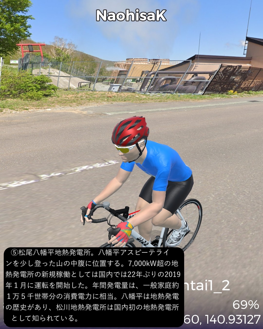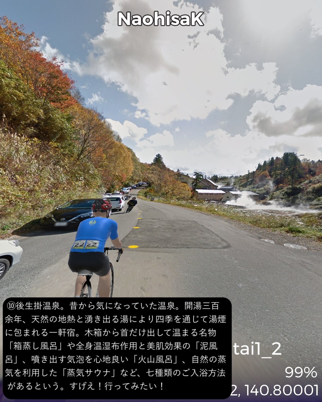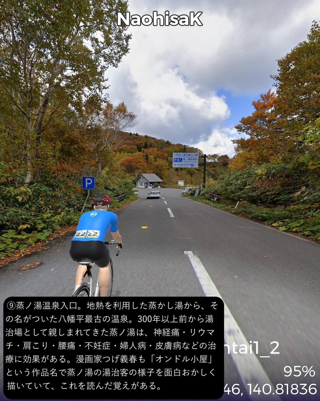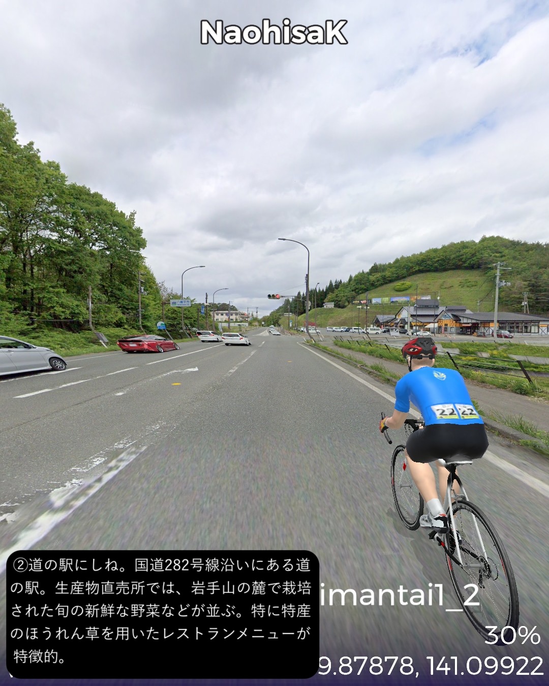 VRサイクリング 八幡平山系をグルッと巡る観光ルートを行ってみる。名付けて八幡平ラウンド、その1日目。盛岡駅を出発し、最初は鹿角街道、といっても片道2車線の国道282号を進む。滝沢を過ぎ西根まで行ったところで、岩手山の溶岩流の焼走りを経由して八幡平温泉のある八幡平リゾート付近へと進み、そこから八幡平アスピーテラインというドライブウェイに入る。標高1500m越えの八幡平山頂に近い見返峠を越え秋田県に入り後生掛温泉をゴールとする69kmの行程。今回のルートは見返峠を越えるまで岩手県のシンボル岩手山を視野に入れつつ、その南東側から反時計回りに北西側までグルッとめぐることになった。岩手山は廻るに連れて山容が変化する山であるが、やはり盛岡市街方面から望む形がシンプルに均整が取れていて最も美しく感じた。八幡平は昔スキーで地域の外れの安比高原に行ったことはあるが、中心地域には足を踏み入れたことがなく長らく訪れたい場所の1つにノミネートされたままの場所だった。今回VRで訪れてみて、国立公園に指定されているだけあって岩手山を含めて山の風景が素晴らしいところだと認識した。蒸ノ湯温泉や後生掛温泉といった秘湯もそそられる。いずれ訪れてみたい場所だなあ。(VRサイクリングを進めるにつれ訪れたい場所がオーバーフローしつつあるのを感じているが)