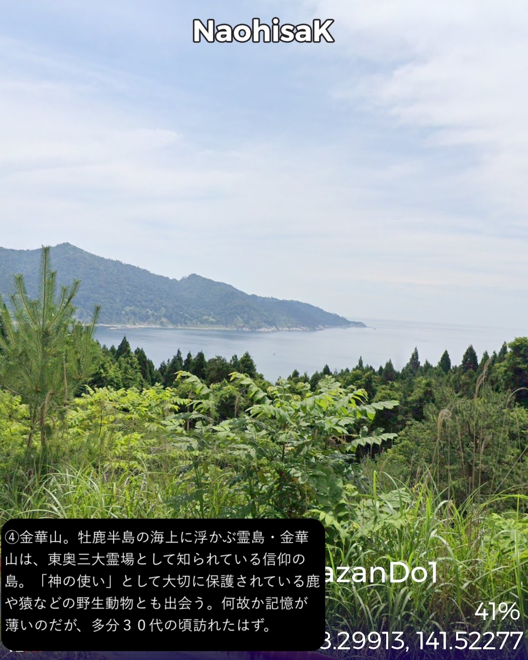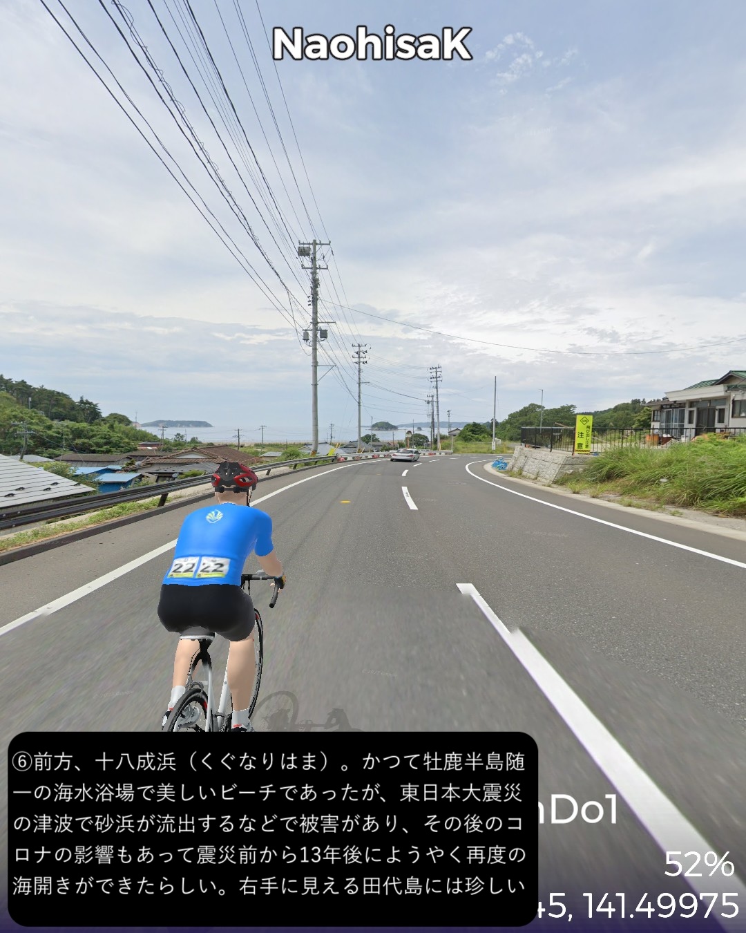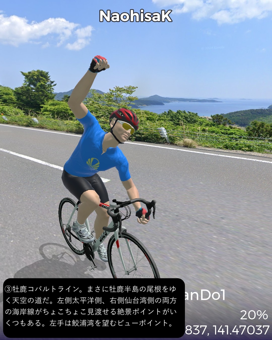 VRサイクリング 今回はリアス式海岸のなれの果てのような複雑な海岸線を極めた牡鹿半島一周編。東日本大震災の津波による廃墟から本来の漁業基地としてのステータスを取り戻した女川を出発し、しばらく牡鹿半島の北東部の海岸をなぞった後、細長い牡鹿半島の背骨となる尾根伝いの絶景のドライブウェイ、牡鹿コバルトラインをずんずん進み、半島先端の先に浮かぶ霊島、金華山を拝んだ後、昔の捕鯨基地鮎川港に下り、この辺から金華山への巡礼の街道、金華山道を辿って、牡鹿半島西海岸をなぞりながら北へ折り返してゆく。牡鹿半島の北西の根本の町、というより仙台のベッドタウン、宮城県第二の都市、石巻に至る71kmの行程。牡鹿半島の海上に浮かぶ霊島、金華山は恐山、出羽三山と並ぶ奥州三大霊場として知られる信仰の島。また金が国内で最初に発掘された場所とも言われて、その中心、金華山黄金山神社は金運のパワースポットとしても崇められ、古くから巡礼の対象となっていたようだ。その巡礼路が仙台から石巻を経由して牡鹿半島先端部に至る金華山道。次回にかけてその巡礼の帰り道を辿る。30代の頃、青春18切符でちょっと行ってみたい場所として牡鹿半島を目指し、女川駅からバスで今回走った牡鹿コバルトラインを通り鮎川まで行き、ここの民宿に泊まって次の日にフェリーで金華山に渡ったのだが、金華山のビジュアルな記憶がない。鮎川の民宿で聞いた、昔鯨取りとして捕鯨船に乗っていた民宿のオヤジの壮絶な武勇伝の方が記憶に残っている。今回もまだまだあちこちに東日本大震災の傷跡が残っていたなあ。特にゴールの石巻は、石巻駅付近の中心街は大きな被害は受けなかったように見えるが、広がりのある大きな都市のうち低地の市街地はかなりやられたようだ。次回は松島を経由して仙台へ向かう。