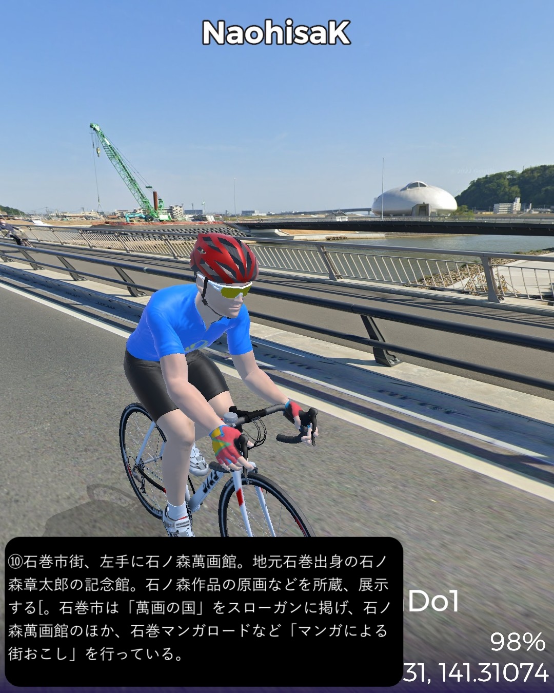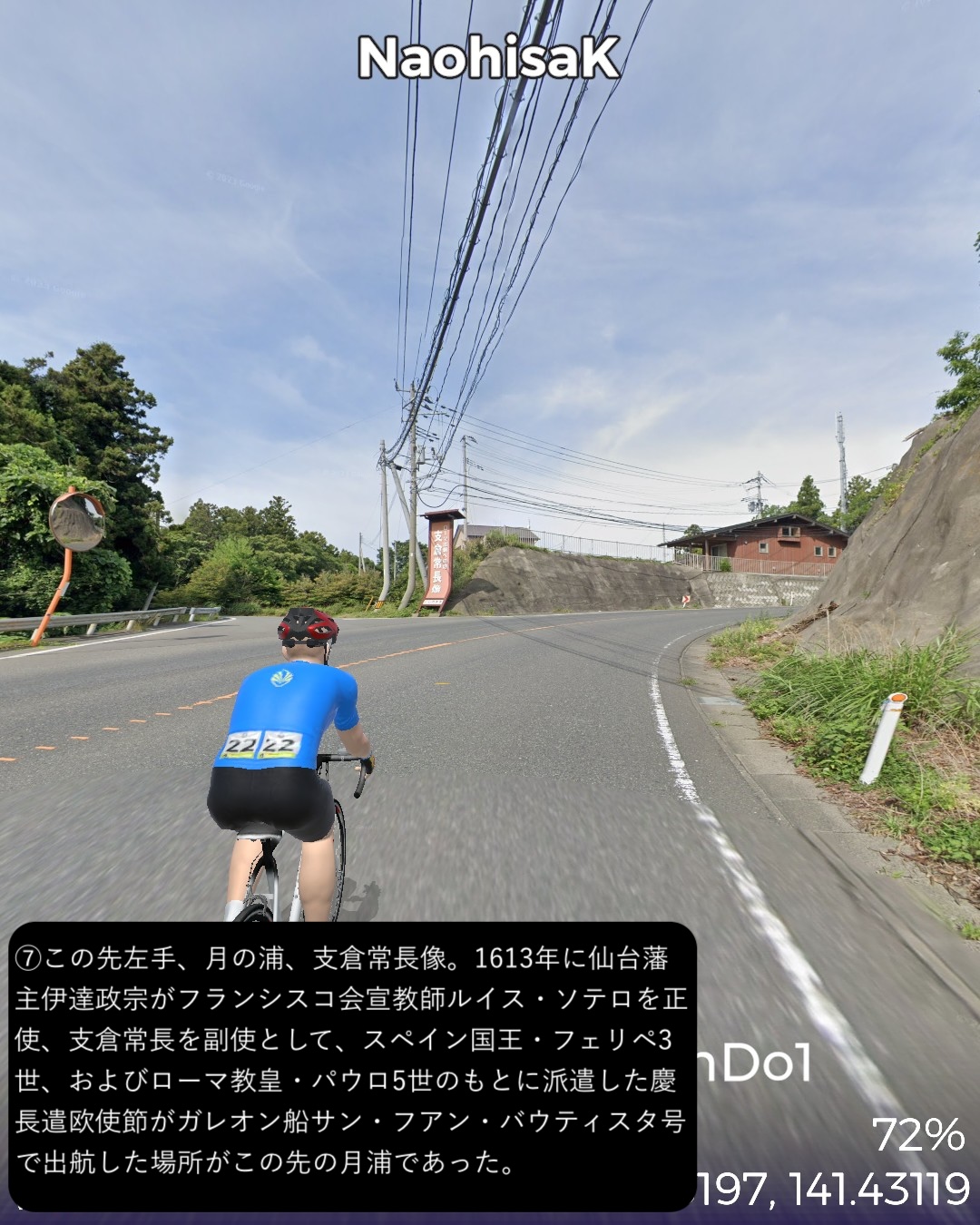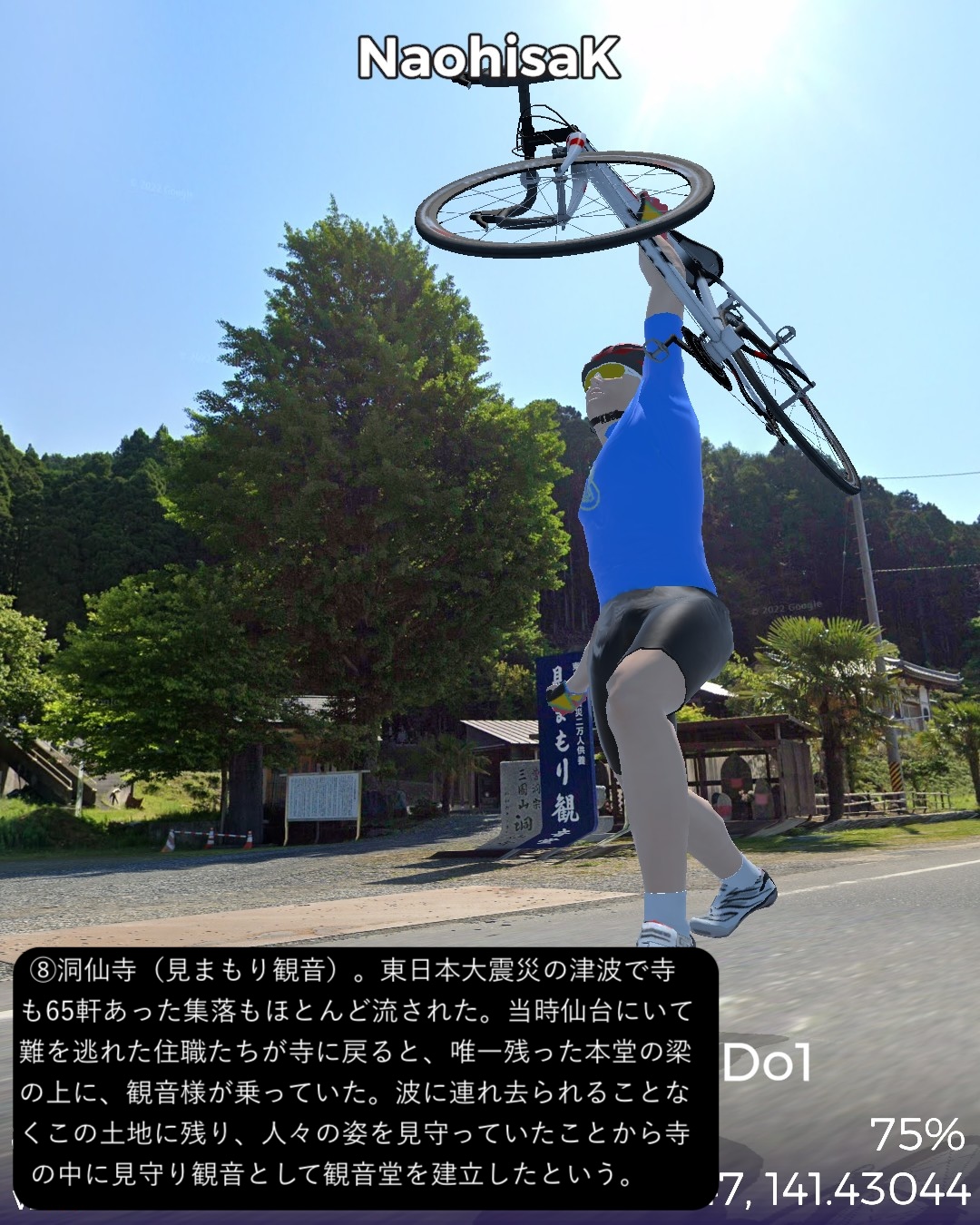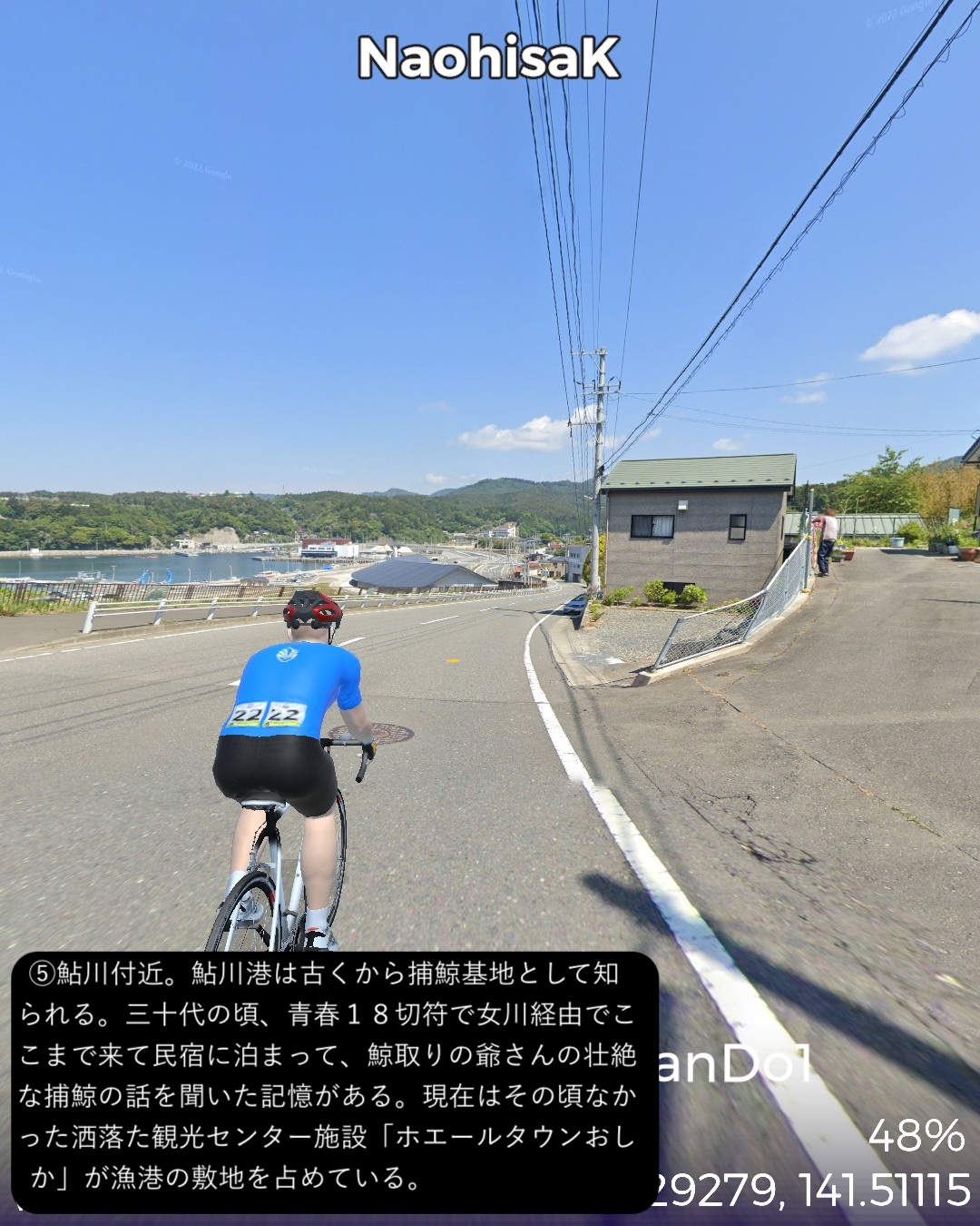 VRサイクリング 今回はリアス式海岸のなれの果てのような複雑な海岸線を極めた牡鹿半島一周編。東日本大震災の津波による廃墟から本来の漁業基地としてのステータスを取り戻した女川を出発し、しばらく牡鹿半島の北東部の海岸をなぞった後、細長い牡鹿半島の背骨となる尾根伝いの絶景のドライブウェイ、牡鹿コバルトラインをずんずん進み、半島先端の先に浮かぶ霊島、金華山を拝んだ後、昔の捕鯨基地鮎川港に下り、この辺から金華山への巡礼の街道、金華山道を辿って、牡鹿半島西海岸をなぞりながら北へ折り返してゆく。牡鹿半島の北西の根本の町、というより仙台のベッドタウン、宮城県第二の都市、石巻に至る71kmの行程。牡鹿半島の海上に浮かぶ霊島、金華山は恐山、出羽三山と並ぶ奥州三大霊場として知られる信仰の島。また金が国内で最初に発掘された場所とも言われて、その中心、金華山黄金山神社は金運のパワースポットとしても崇められ、古くから巡礼の対象となっていたようだ。その巡礼路が仙台から石巻を経由して牡鹿半島先端部に至る金華山道。次回にかけてその巡礼の帰り道を辿る。30代の頃、青春18切符でちょっと行ってみたい場所として牡鹿半島を目指し、女川駅からバスで今回走った牡鹿コバルトラインを通り鮎川まで行き、ここの民宿に泊まって次の日にフェリーで金華山に渡ったのだが、金華山のビジュアルな記憶がない。鮎川の民宿で聞いた、昔鯨取りとして捕鯨船に乗っていた民宿のオヤジの壮絶な武勇伝の方が記憶に残っている。今回もまだまだあちこちに東日本大震災の傷跡が残っていたなあ。特にゴールの石巻は、石巻駅付近の中心街は大きな被害は受けなかったように見えるが、広がりのある大きな都市のうち低地の市街地はかなりやられたようだ。次回は松島を経由して仙台へ向かう。