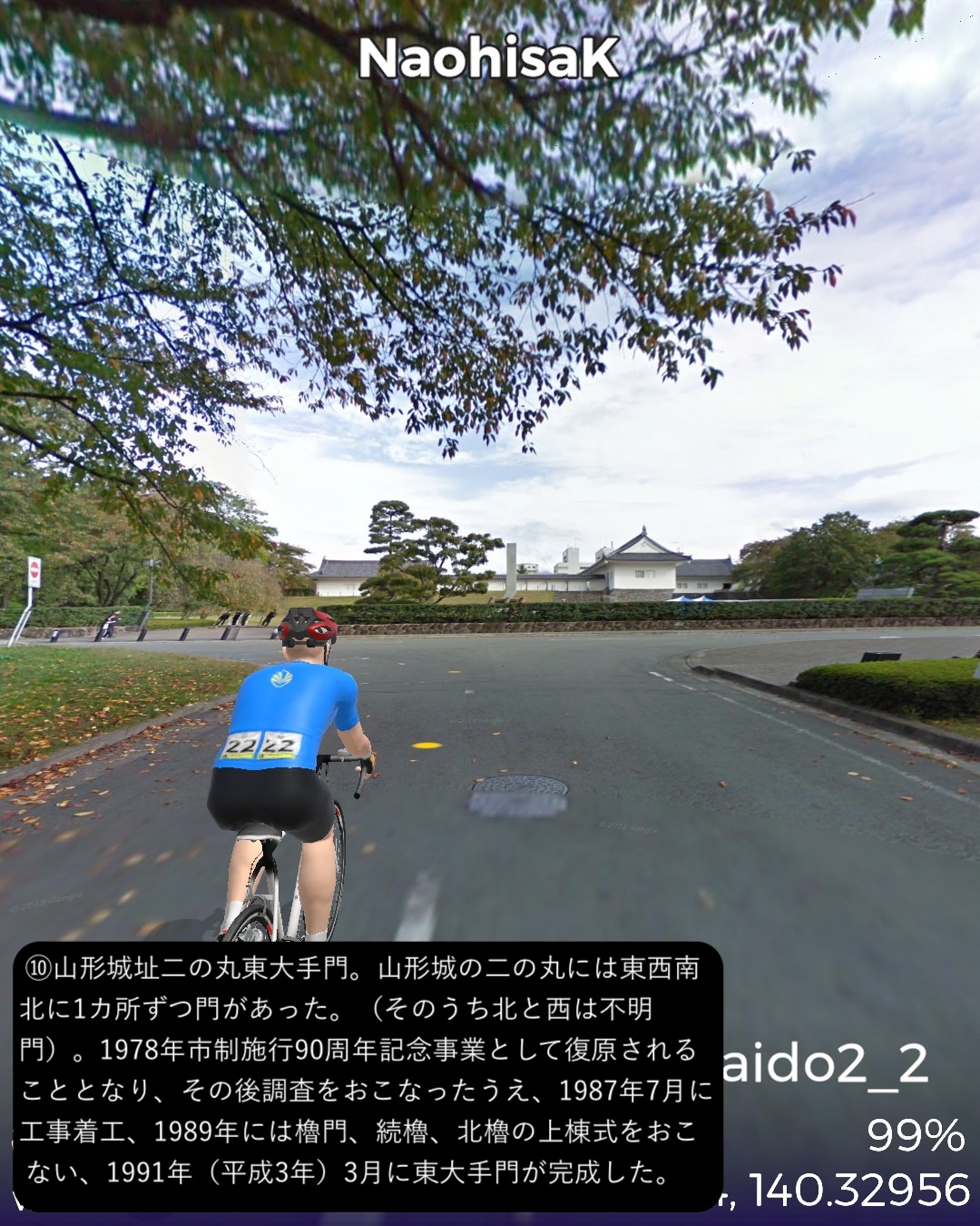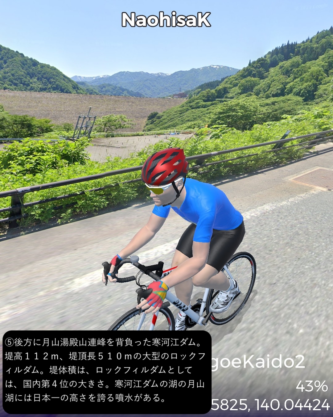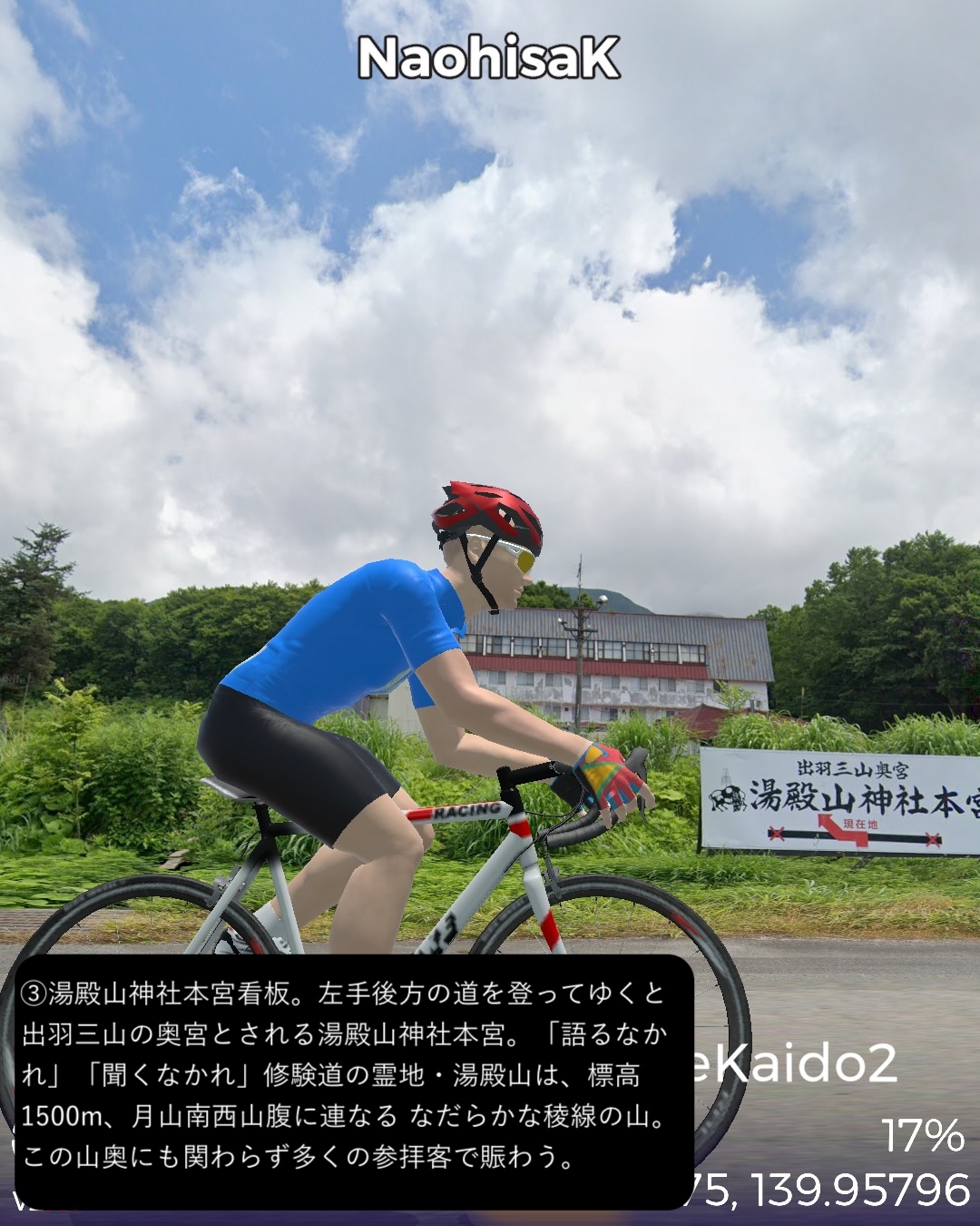 VRサイクリング 六十里越街道 2日目。月山・湯殿山連峰の奥深い山を越えて山形盆地へ下る。湯殿山総本寺のある大網をスタートし、田麦川の深い谷へ下って湯殿山の脇の山懐へ登ってゆく。そのまま奥深い山の道を延々と行くと月山スキーの基地となっている月山志津温泉へ辿り着く。そこからどんどん山を下ってゆき月山湖に出たら寒河江川に沿って行くと次第に山が遠のいて間沢、白岩と昔の宿場を通り過ぎてさくらんぼの町、寒河江に入る。そこからさらに平らな道をしばらく進むとゴール山形へ至る。山形は駅の西側の山形城址をゴールとする80kmの行程。今回の六十里越街道の道筋はまさに出羽三山の聖域の山懐を進むルートで、とにかくこれまで体験したことがないほどとてつもなく山が深いのを感じる。単に険しい地形というだけなら信州のアルプス越えの道や、北海道の大雪山系などの方が上かもしれないが、それだけではない何モノかがあるような気がする。六十里越街道は1200年前の古代から開かれた由緒ある街道で、古くから出羽三山詣で利用されてきたが、江戸時代には西のお伊勢詣り、東の三山詣りと呼ばれて毎年2万人以上の参拝者で賑わったらしい。道の険しさを考えると想像を絶する状況である。羽黒山は現世の幸せを祈る山(現在)、月山は死後の安楽と往生を祈る山(過去)、湯殿山は生まれ変わりを祈る山(未来)とされ、三山をこの順番で巡礼することにより、現在・過去・未来をめぐる「生まれ変わりの旅」として広がったということである。険しい旅路の先で生まれ変わるってなんかロマンチックじゃない?リアルな六十里越街道歩きで三山詣をちょっとしてみたくなった。