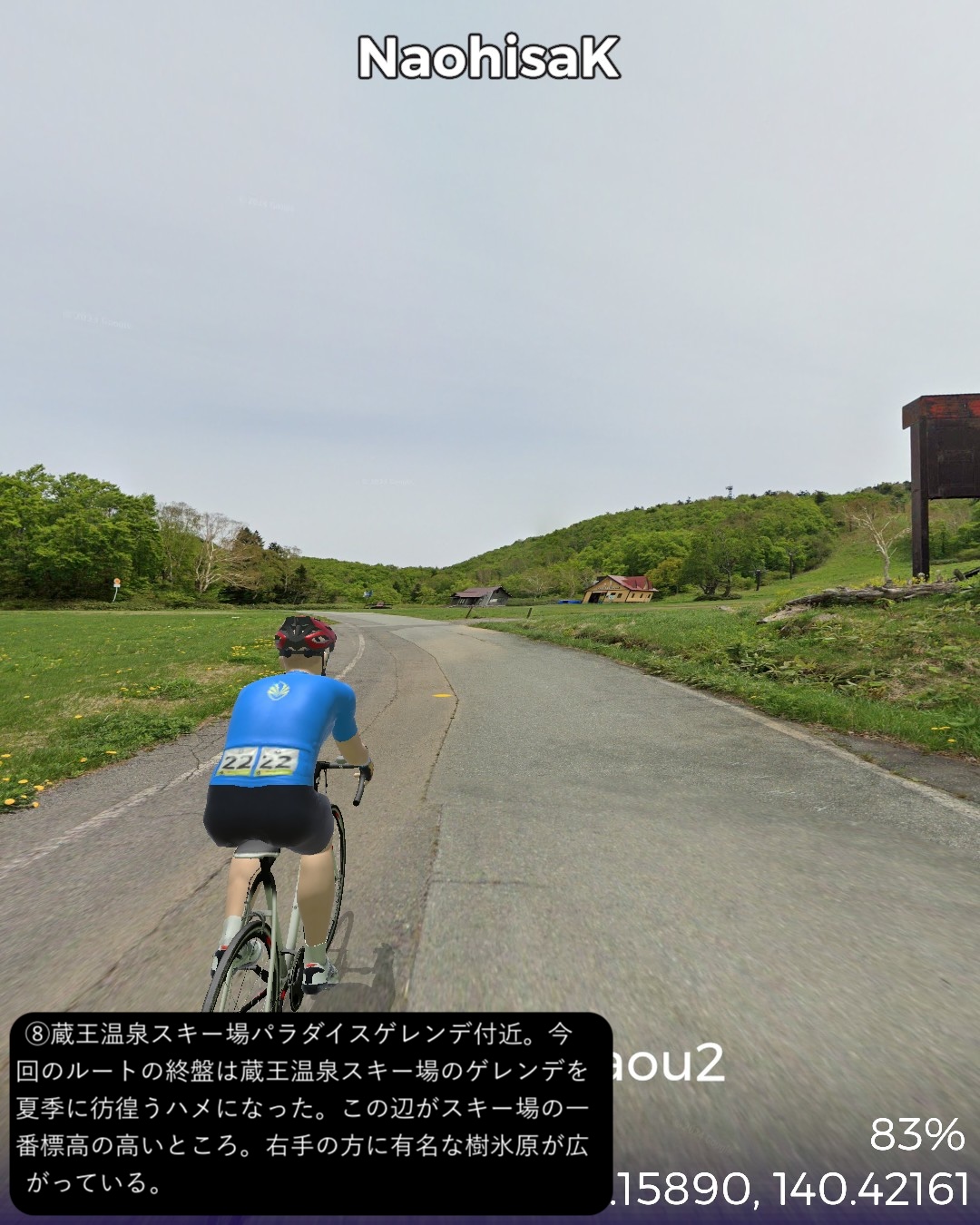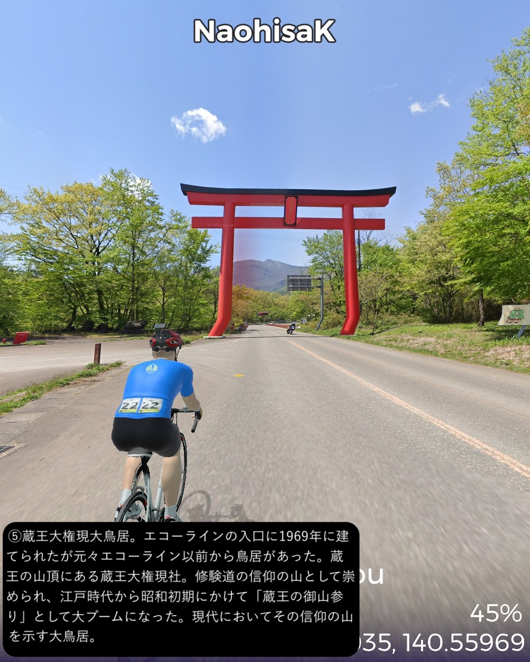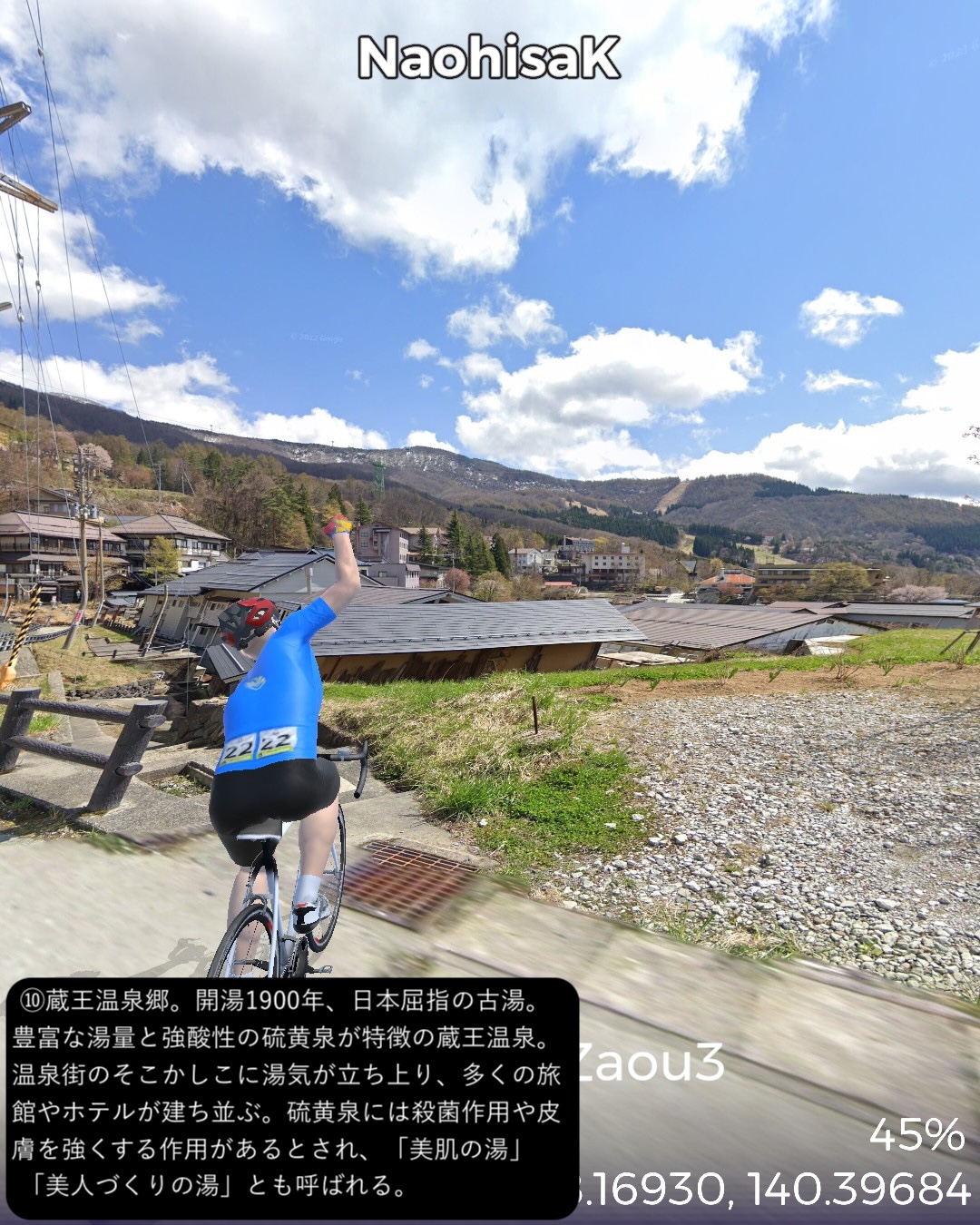 VRサイクリング 今回は完全寄り道の番外編で蔵王を周遊する。前回通過した蔵の街、村田を起点に蔵王町をすり抜けてこけし発祥の地の1つ遠刈田温泉、さらにちょっと牧場、別荘地が広がる七日原をぐるっと巡って遠刈田温泉に戻った後、蔵王エコーラインに入り、そのまま蔵王の山並みを越え山形県に入って一旦下る。蔵王温泉スキー場、ドッコ沼を経て蔵王温泉郷をゴールとする76kmの行程。蔵王は現代においてはスキーのメッカであるが、先日通った出羽三山と同様修験道の山であった。平安時代、刈田嶺山頂に山伏たちが最も大切にしている信仰の証「蔵王大権現」を祀った。それが蔵王の地名の由来ともなっている。その後江戸時代から太平洋戦争後にかけて、遠刈田から蔵王古道を登って蔵王山の蔵王大権現を参拝する「御山詣り」が盛んに行われた。今回通ったルートでは遠刈田温泉から蔵王エコーラインのドライブウェイを通るが、ほぼこの道筋が蔵王古道の道筋に合致しているようだ。先日の出羽三山もそうであるが、昔の日本人は旅と言えば「詣で」であり、山に登ると言ったら「詣で」だったんだねえ。日本人の精神構造も変わってしまったわけだ。今回のルートはイマイチの撮れ高であった。蔵王の象徴である「御釜」を望むことはできなかったし、山形側の蔵王は山が全面スキー場のゲレンデ化しているので、冬ならもう一つの蔵王の象徴、樹氷を拝むことができたであろうが、夏場は斑らに山肌が露出してちょっと頂けない。宮本輝の傑作小説「錦繍」や、合唱曲「蔵王」(昔合唱団所属していた時に歌った)に出てくる神秘の沼「ドッコ沼」を拝めたのは良かった。
