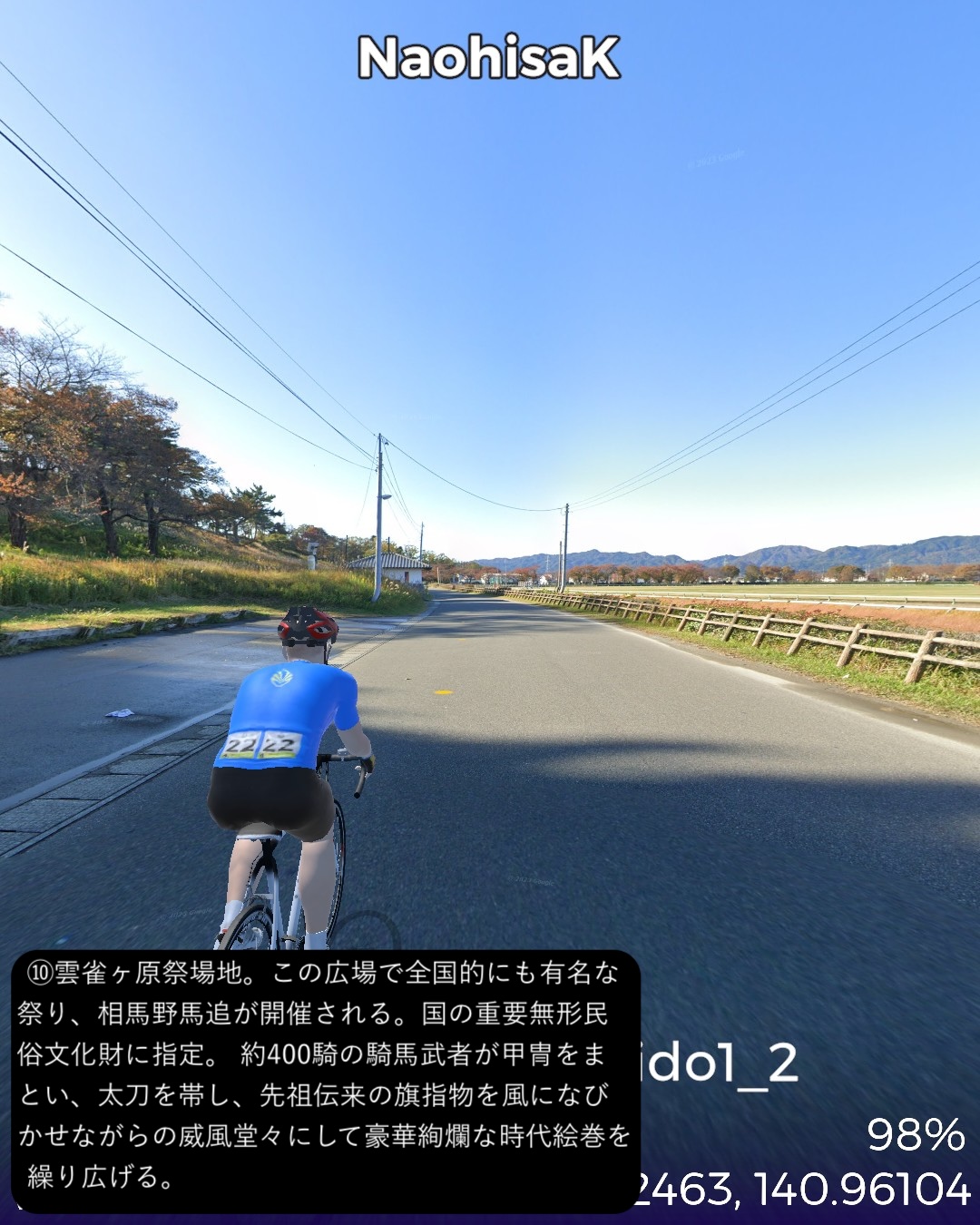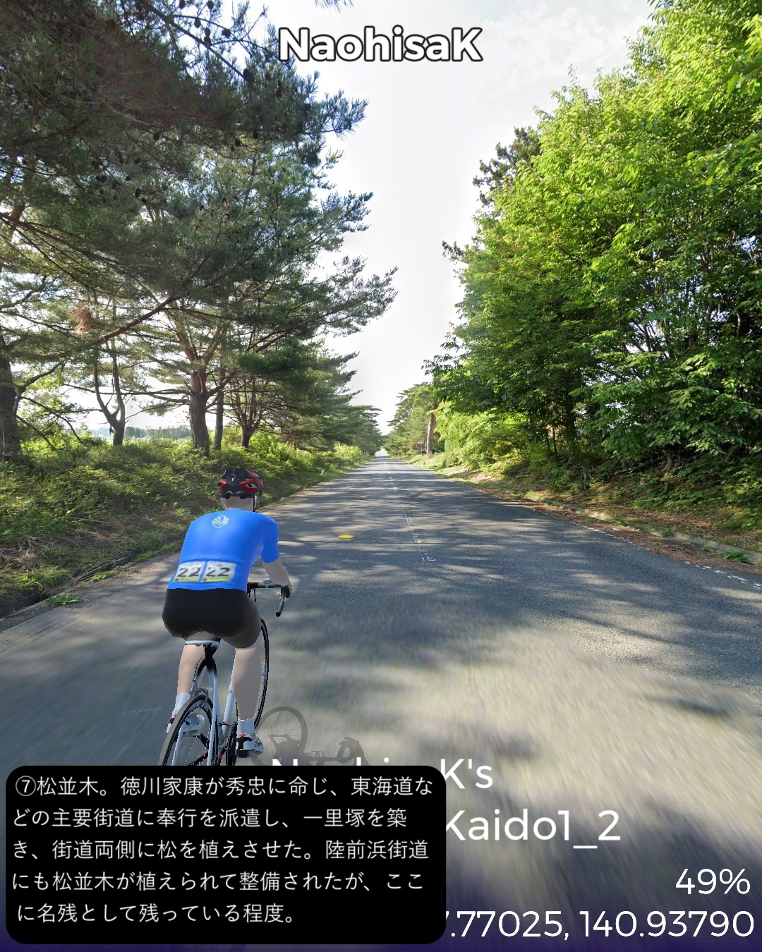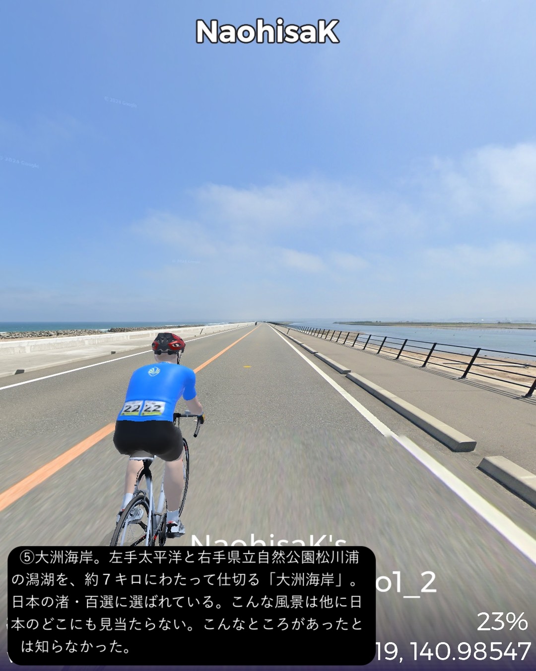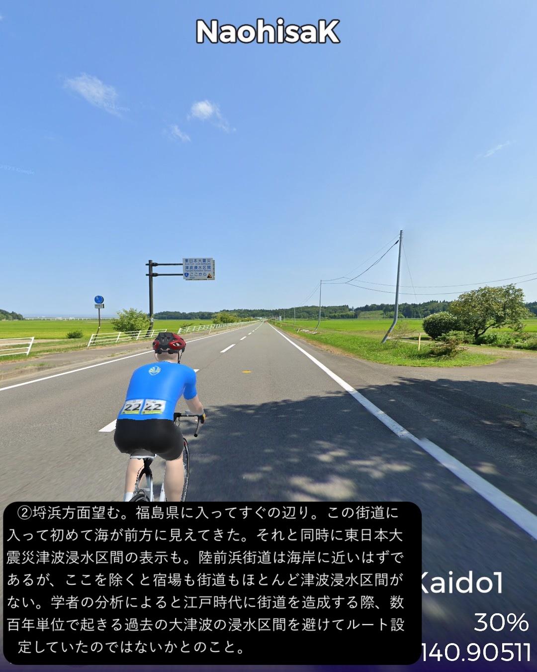VRサイクリング 今回からJR常磐線に沿ったいわゆる浜通りを南下して水戸を目指す。陸前浜街道という五街道に次ぐ位置付けの街道の旧街道をできる限り走ることとする。今回はその1日目で、宮城県から福島県北部まで進む。本来は奥州街道との分岐点となる岩沼宿を始点としたいところであるが、ルート設定の都合上、前々回のゴールとした逢隈をスタート地点として南へ進む。ミニ城下町である亘理宿、坂元宿を過ぎ、磐城国、福島県に入ると新地宿を通り、相馬藩の城下町中村宿まで進んだところで、街道を外れて寄り道モード。浜の街道という名称ながらここまで海岸の近くを通らなかったので、名勝地として知られる松川浦と太平洋の長い砂州、大洲海岸を通ってみる。また街道に戻り鹿島宿を経て原町宿を過ぎた先、相馬野馬追の会場となっている雲雀ヶ原祭場地をゴールとする71kmの行程。陸前浜街道は名前とは裏腹に海岸沿いの道は無く、山際のルートとなっている。学者の分析によると江戸時代に街道を造成する際、数百年単位で起きる過去の大津波の浸水区間を避けてルート設定していたのではないかとのこと。よって先の東日本大震災の浸水区間も街道沿いにはほとんどないようだ。先人の見識は現代以上と言えるかもしれない。今回のルートの地域は過去にリアルには訪れたことも通過したこともない私にとっての処女地であるが、相馬の海岸に広がる潟湖、松川浦という素晴らしい景勝地があるのは初めて知った。特に松川浦と太平洋に挟まれた延々と続く砂州の道が今回のハイライトであった。次回は本来自転車で通れないヤバい地域に足を踏み入れる。