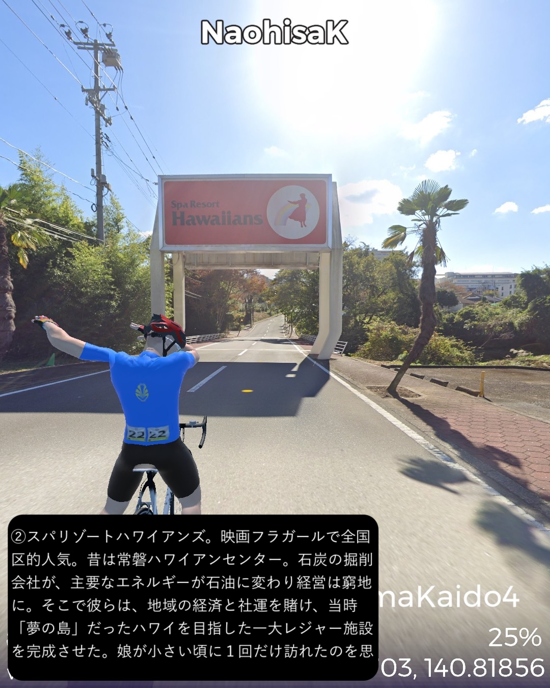 VRサイクリング 陸前浜街道4日目。磐城国(福島県)から常陸国(茨城県)へ。長くさすらってきた「みちのく」の旅もとりあえず一区切り。一旦関東へ入る。前回街道から外れた地点神谷をスタート、街道を辿っていわき市街である磐城平宿をくぐり抜けて、昔からの温泉地、湯本宿へ進むが、その前にちょっとスパリゾートハワイアンズへ寄り道。ずっと進んで関田宿を越えると、山の中の勿来の関跡。その先常陸国との国境を越えたところでまた寄り道。平潟漁港、五浦という風光明媚な海岸地帯を通って、再度街道に戻って今は跡形もない足洗宿まで65kmの行程。いわき駅があるいわき市の中心街は、戦国時代岩城氏が城下町として、街道上は磐城平宿として栄えてきた町。市町村合併でいわき市となるまでは平市と称し駅も平駅であった。いずれにしても想定していた大きな田舎町レベルではなく立派な都市であったのにちょっと驚いた。スパリゾートハワイアンズは娘がまだ幼い頃に親戚大勢で訪れた場所で、映画フラガールの舞台ということもあり、かなり寄り道であるがちょっと表敬訪問。昔より周囲の施設が増えたような気がする。磐城国と常陸国の国境近くの山中に勿来の関跡があった。百人一首の和歌などで勿来の関というのがよく詠まれていた気がして、こんな辺境の二級街道の関所のことをなぜ詠うのであろうか、と思ったら、「来る勿れ」(来ないでください)の意を示す歌枕として駄洒落のように使われていただけらしい。その先、北茨城市の平潟漁港の集落に混じってあんこう鍋を売りにする温泉旅館が何軒かあって、なんか観光地ではないネイティブな漁村ぽい雰囲気に惹かれたが、さらにあんこう鍋の評判も良さそうなので一度冬にあんこうを食べに訪れたいものだと思った次第。次回は一気に水戸へ到達予定。