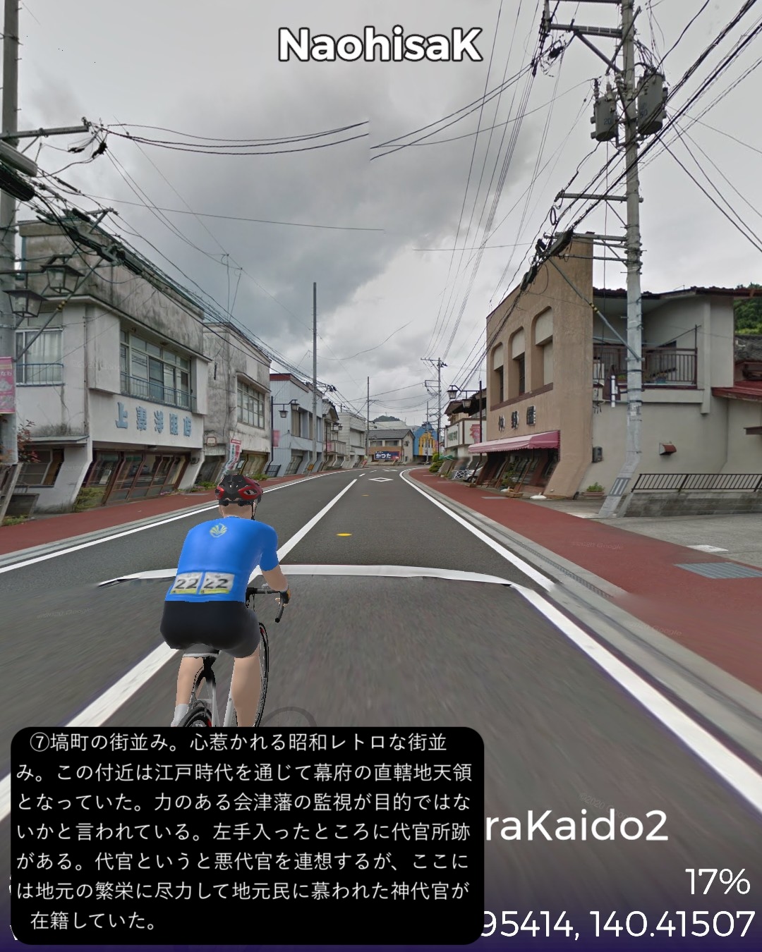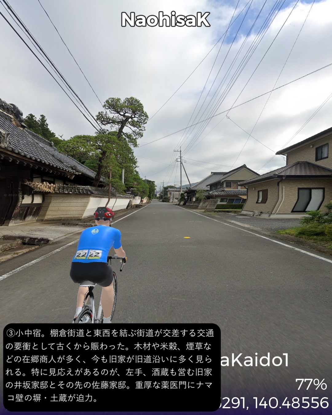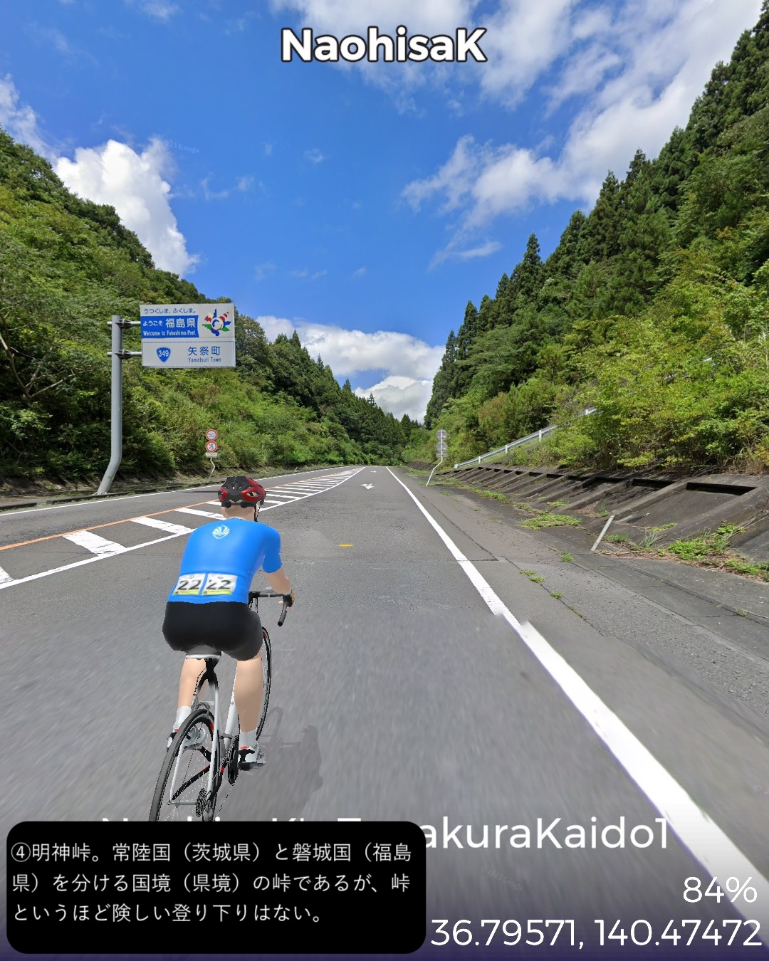 VRサイクリング 棚倉街道 2日目で磐城国(福島県)南部を北上。奥久慈の河原野宿を出発し久慈川支流里川に沿ってさらに奥久慈の奥へ進む。折橋宿、大中宿、小中宿と立て続けに三つの宿場を通り抜けると常陸国(茨城県)と磐城国(福島県)の国境(県境)となる明神峠。峠をダラダラと下ってゆくとしばらくしてJR水郡線沿線に出て東館宿、天領であった塙町を過ぎて城下町棚倉宿へ到達。さらに進み阿武隈川を渡るといわゆる中通りのだだっ広い盆地。田園をひたすら進み、棚倉街道終点で奥州街道の宿場でもある矢吹から次の街道への移動のため奥州街道の東側を並行して北上し奥州街道須賀川宿の1kmほど東の翠ヶ丘公園北東角をゴールとする81kmの行程。前回短めの行程としたこともあるが前回の2倍近い距離になってしまった。それでも前回の方が明らかに名所旧跡、その他気になるスポット満載で、今回は若干間延びしたルート構成となった。出だしの常陸国内は前回終盤の奥久慈の里山地帯が続き、旧街道そいの折橋宿、大中宿、小中宿という三つの宿場町がなかなか味のある街並み風景を見せてくれて良かった。峠を越えた後の磐城国は開けて山が若干遠のいた分街道風景も単調になってきた。それでも江戸時代天領であった塙町の昭和レトロな街並みや、棚倉のこじんまりした城下町風情は魅力的な町の風景であった。その後はひたすら田園地帯で街道を抜けたこともありスポットが少なかったが、ゴール間近の日本最初の西洋式牧場岩瀬牧場や日本唯一国指定名勝に登録された須賀川牡丹園など、通りがかりの眺めだけだが、リアルにもし近くを通ったらちょっと立ち寄ってみたいスポットがあった。次回は会津方面へ進む予定であるが、棚倉街道終点矢吹から会津方面への街道の分岐点本宮まで、今回から次回にかけて、近道だが一度通った奥州街道を回避するため若干遠回りのルートで迂回することになる。